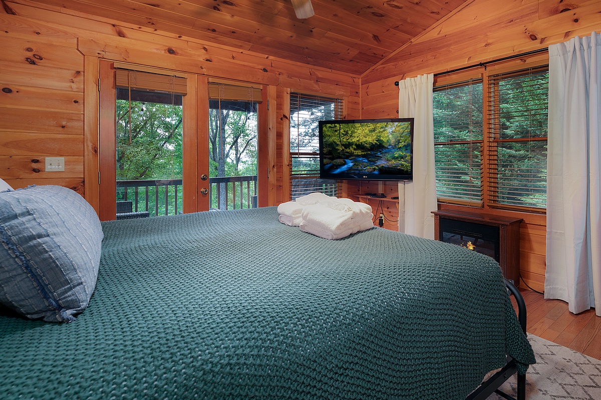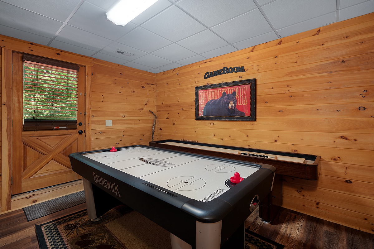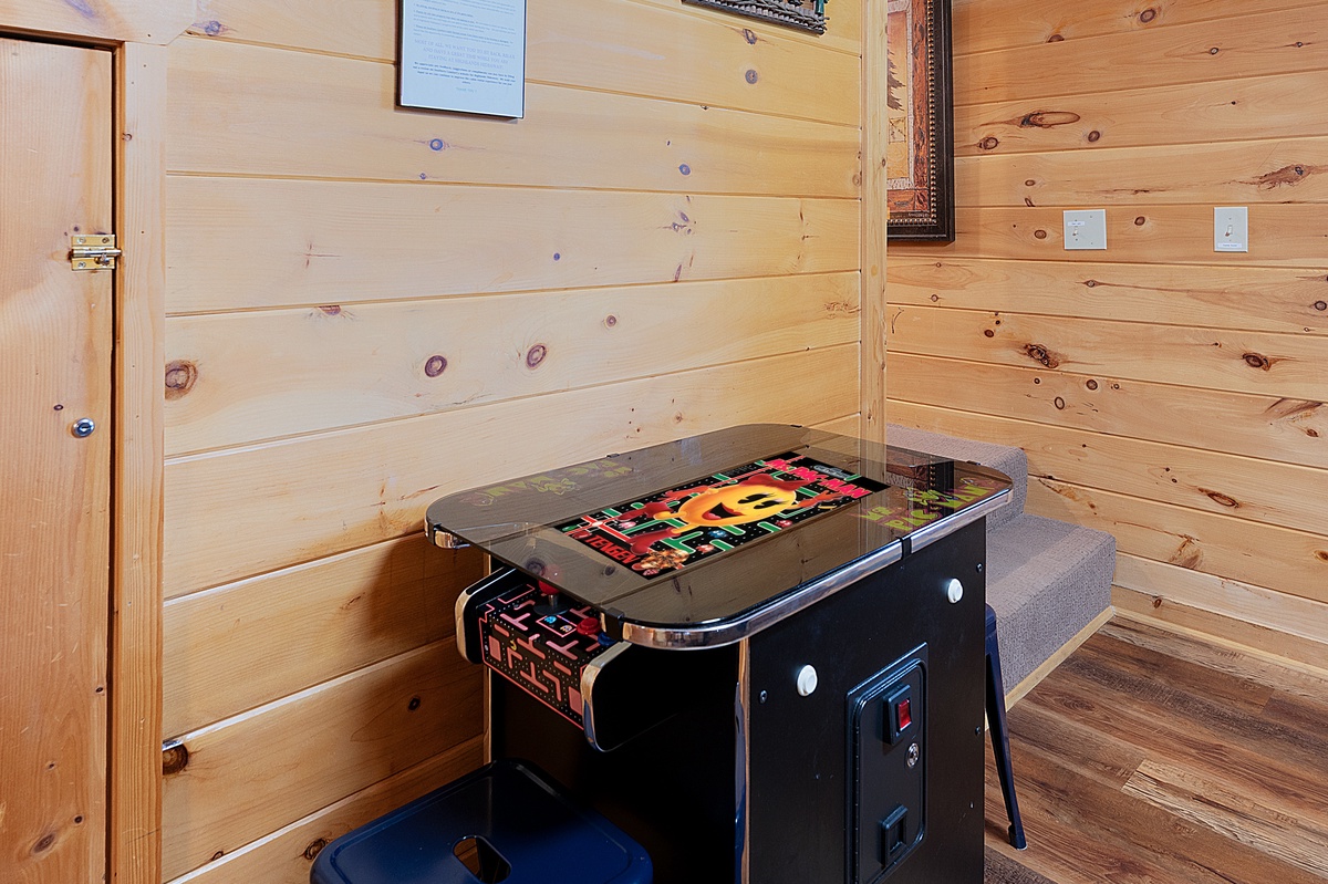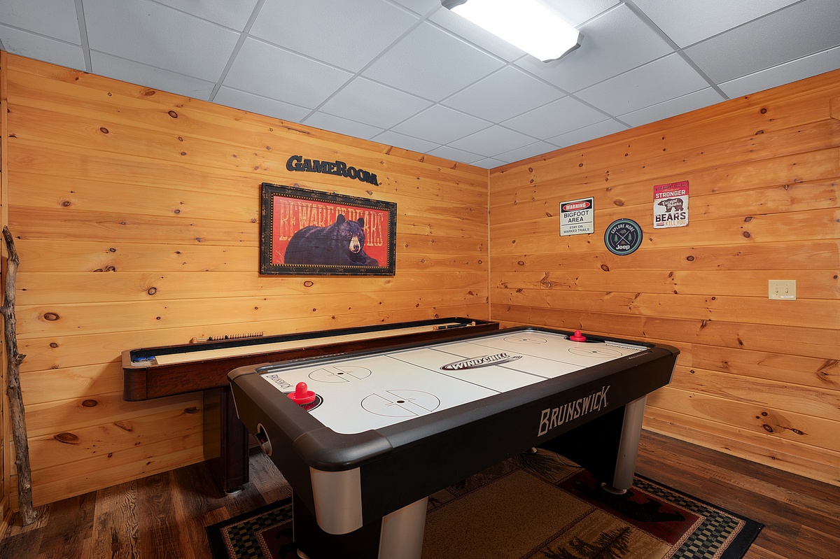 The upper-level king suite offers added privacy, its own ensuite bath, a fireplace heater, and a private balcony, which is a sweet little spot for sipping something warm and watching the treetops sway. Downstairs, the fun kicks in with a dedicated game room featuring air hockey, shuffleboard, and a vintage arcade console, plus a queen bedroom and a bunk room that kids will love, complete with a gaming setup and porch access.