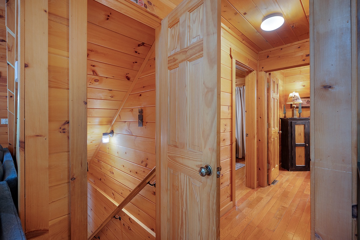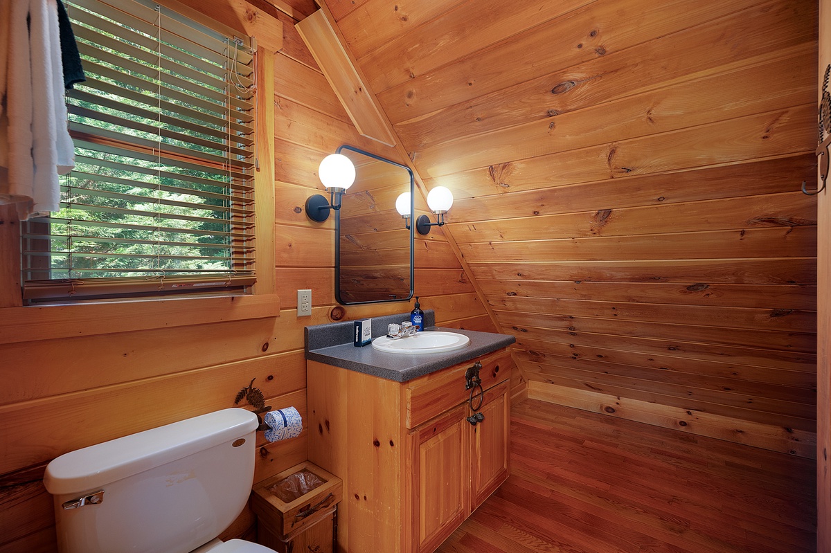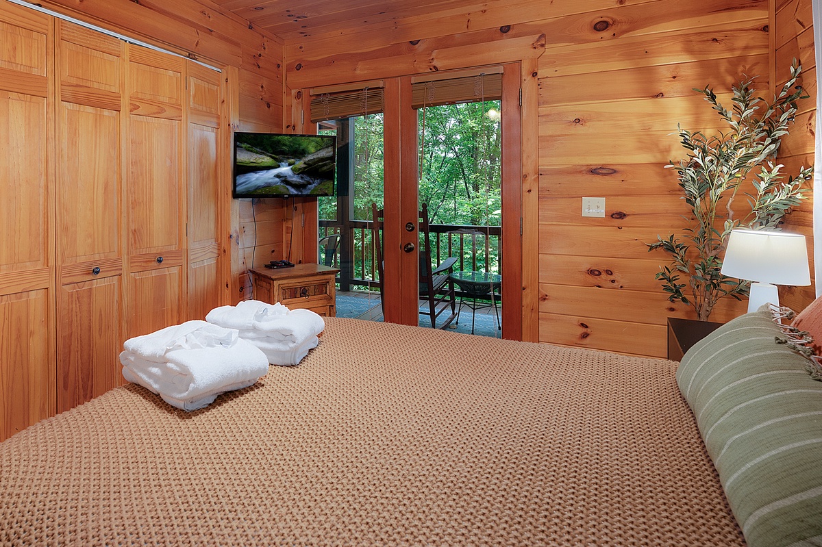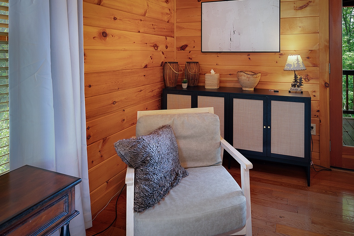 The upper-level king suite offers added privacy, its own ensuite bath, a fireplace heater, and a private balcony, which is a sweet little spot for sipping something warm and watching the treetops sway. Downstairs, the fun kicks in with a dedicated game room featuring air hockey, shuffleboard, and a vintage arcade console, plus a queen bedroom and a bunk room that kids will love, complete with a gaming setup and porch access.