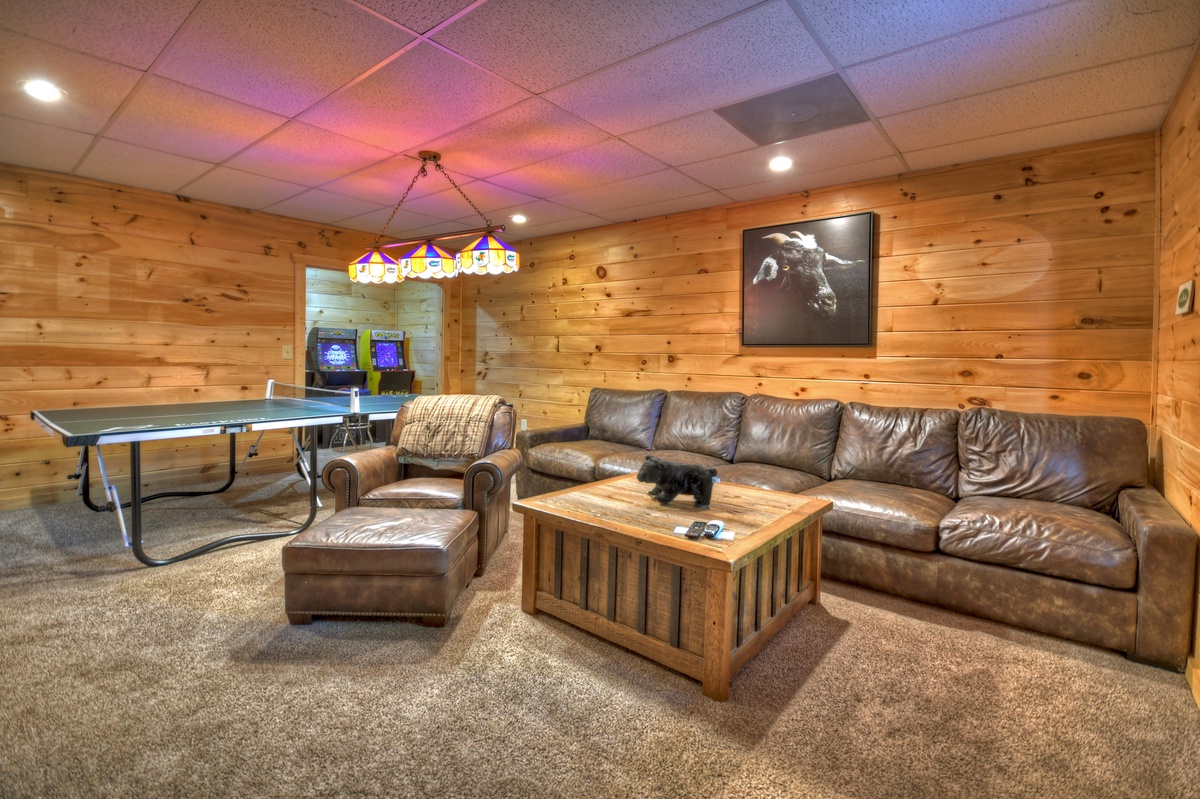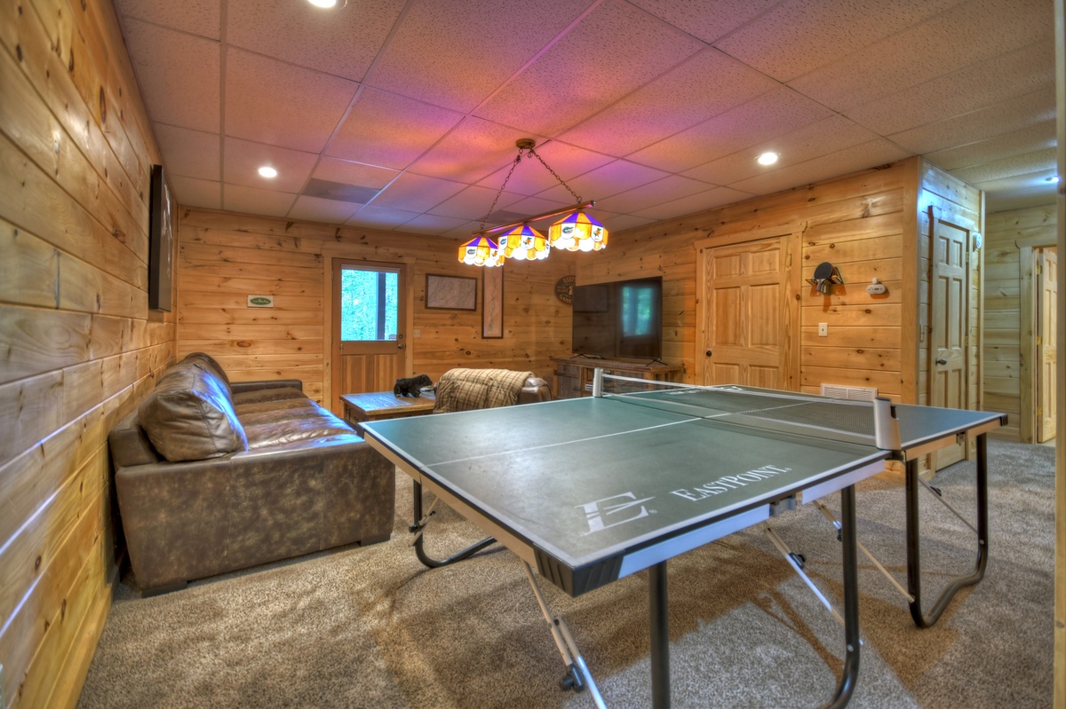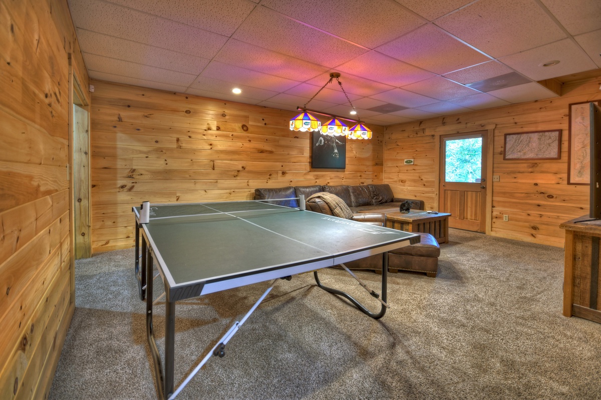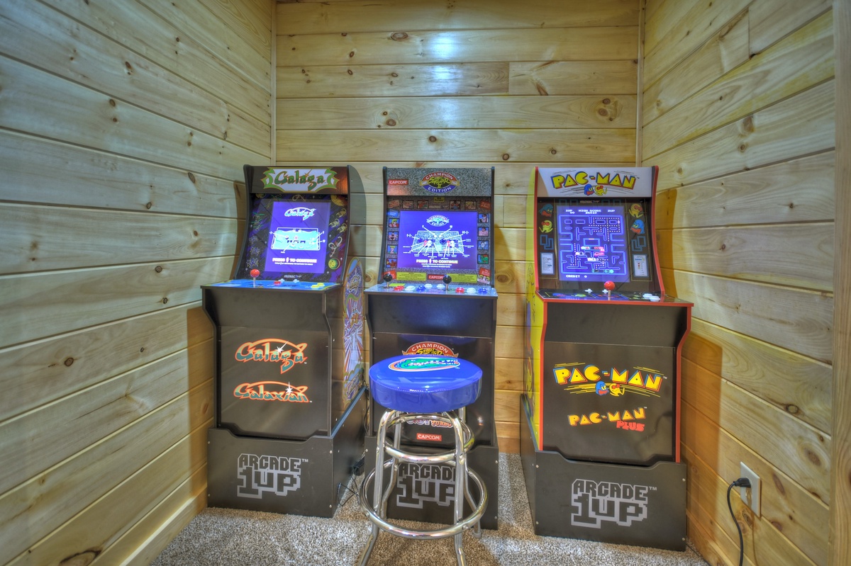Descending to the lower level, you're greeted with the sights and sounds of this ultimate entertainment hub where you can't help but feel a sense of excitement and anticipation. Whether you're a solo player looking for a challenge, or gathering with friends and family for a night of fun, this space promises endless entertainment and unforgettable memories. The 70” TV, with its NFL Sunday Ticket, XBox360 and streaming capabilities will start the show. Here also a ping pong table awaits challengers, its surface gleaming and paddles at the ready. The rhythmic clack of the ball echoing through the room as players engage in fierce, yet friendly, matches is music to the ears. The other gems of this entertainment paradise are the arcade games. Not just one, but two classic cabinets stand proudly, beckoning players to step into a world of heart pounding adventures. One offers the thrill of classic arcade street action with games from Street Fighter 2 and the other of saving the universe from Galaga Galeria 2.