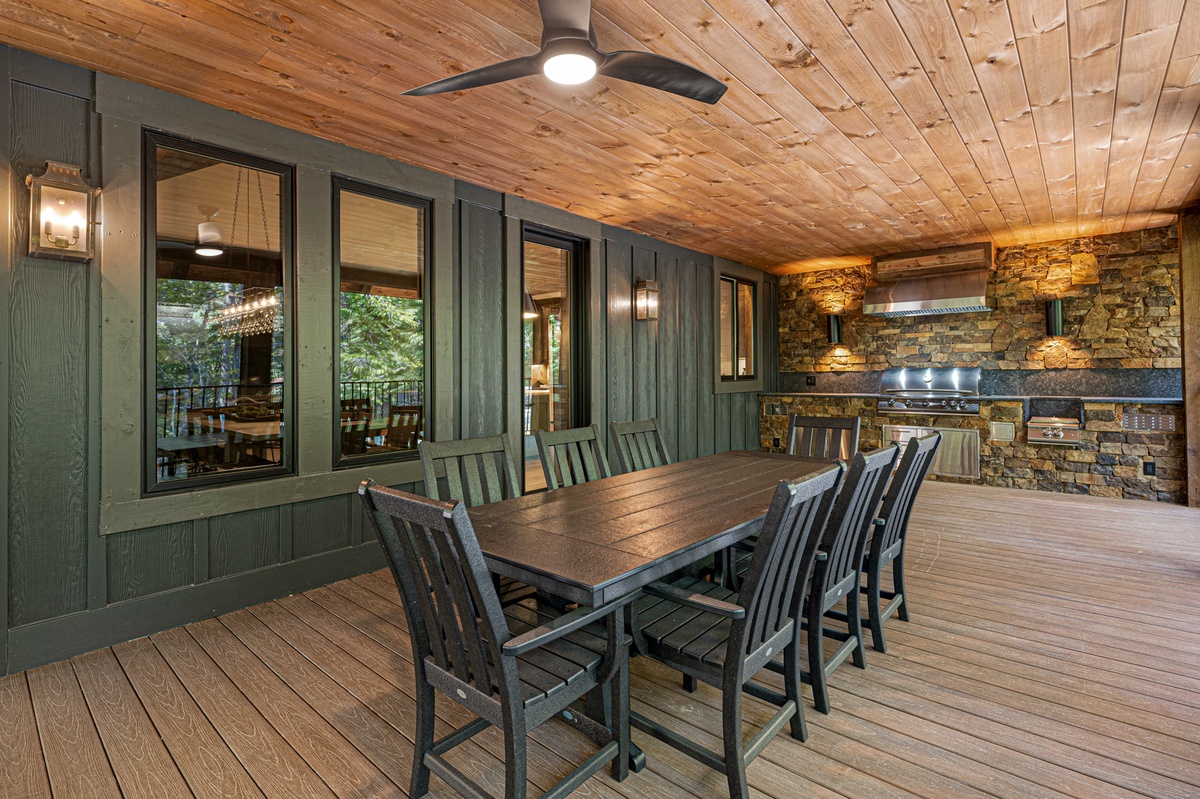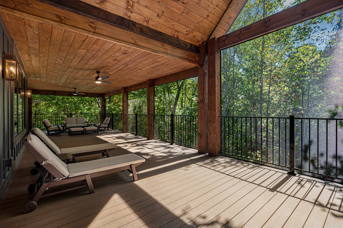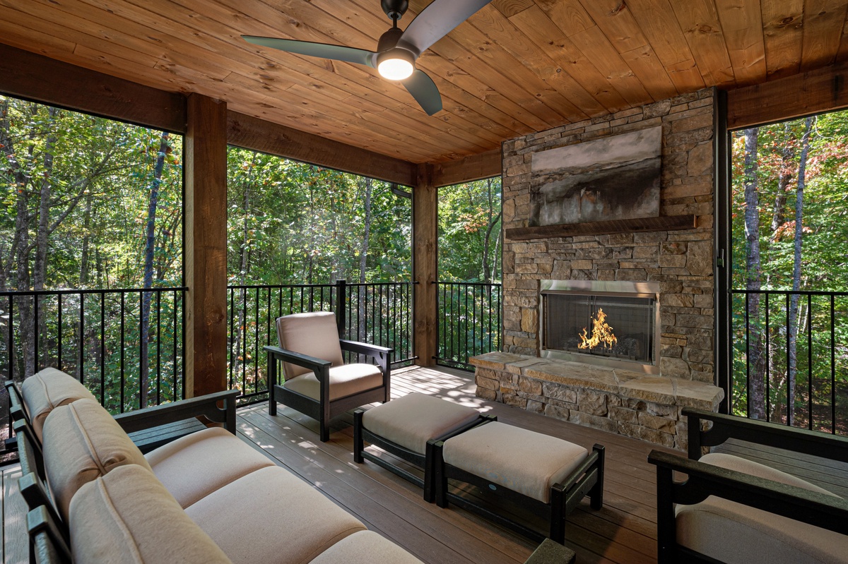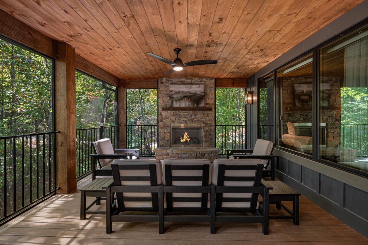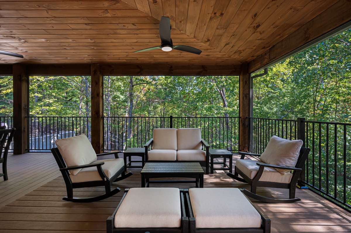 After enjoying an afternoon of gaming with family and friends, step out onto the entry level fully screened in deck space for a breath of fresh air. The space features a covered gas-burning fireplace, lounge chairs, rocker chairs, ceiling fans, an outdoor kitchen with a gas grill and side burners, and a dining table set for eight. The front deck offers wooden rockers and end tables, along with a Solo Stove smokeless firepit for cozy evenings under the stars.