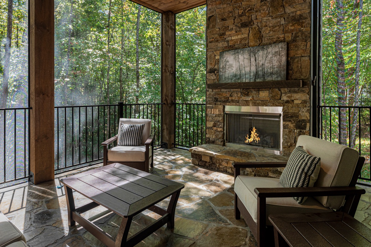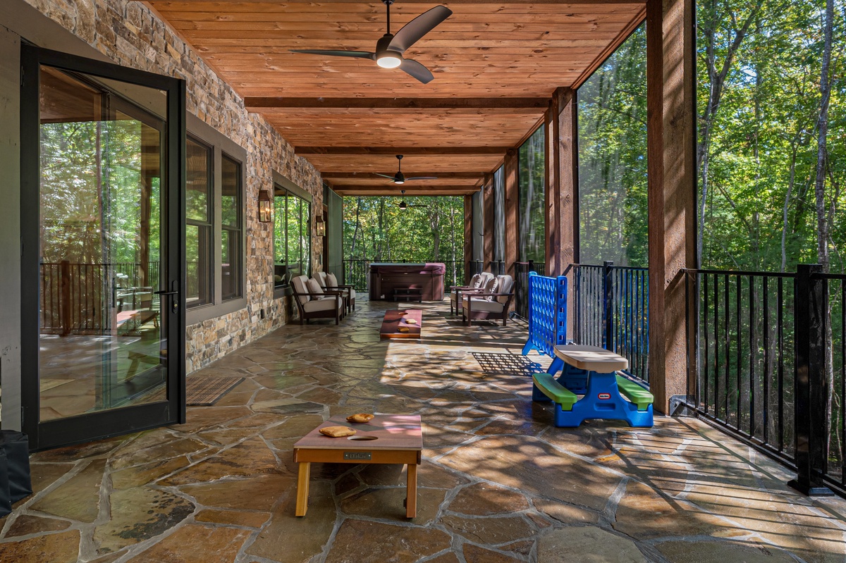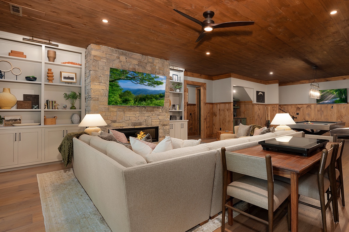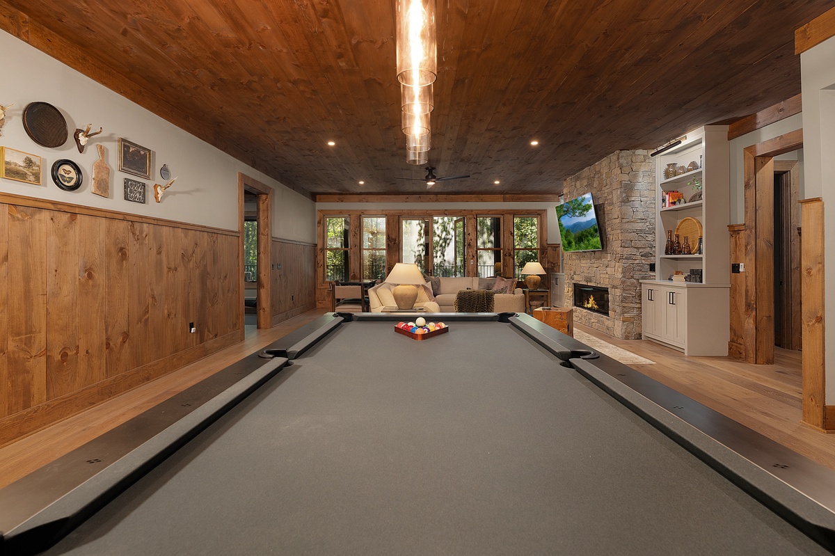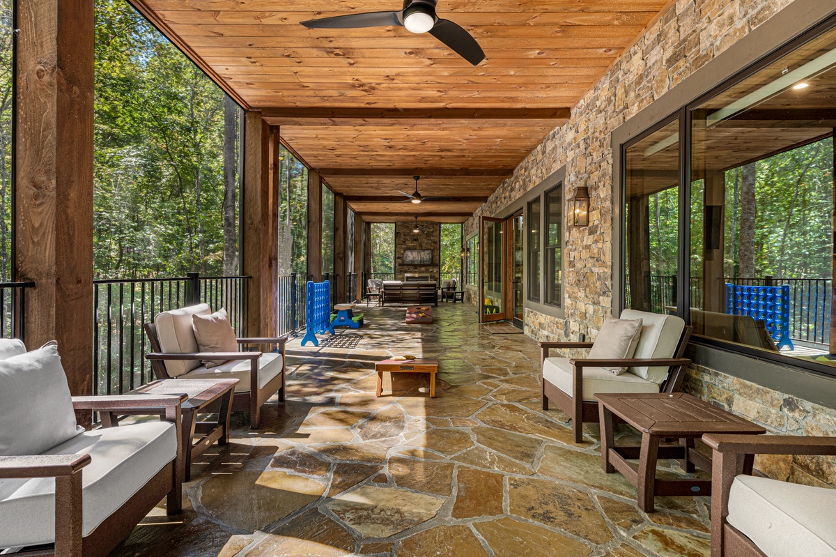 After enjoying an afternoon of gaming with family and friends, step out onto the entry level fully screened in deck space for a breath of fresh air. The space features a covered gas-burning fireplace, lounge chairs, rocker chairs, ceiling fans, an outdoor kitchen with a gas grill and side burners, and a dining table set for eight. The front deck offers wooden rockers and end tables, along with a Solo Stove smokeless firepit for cozy evenings under the stars.
