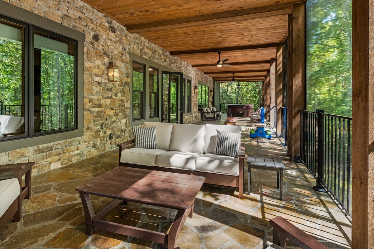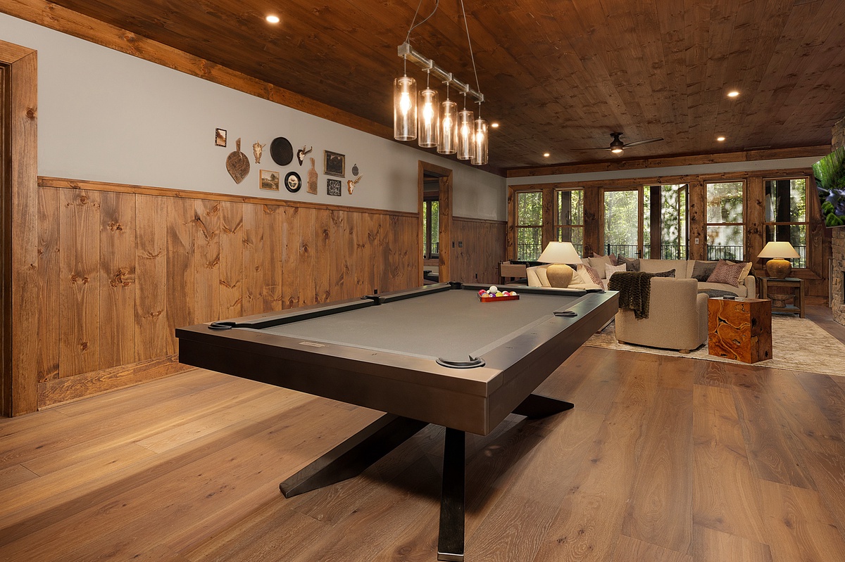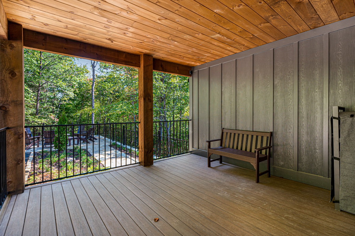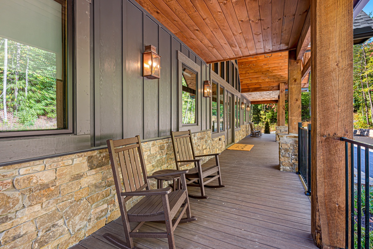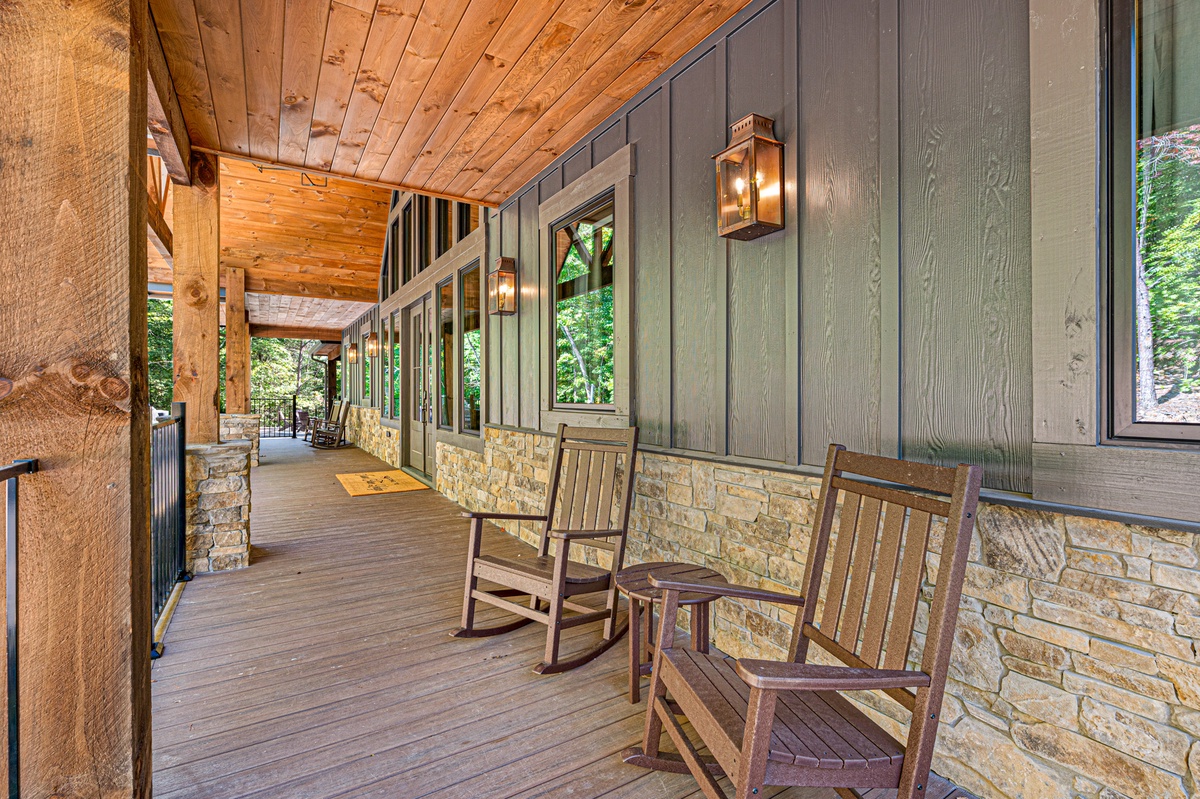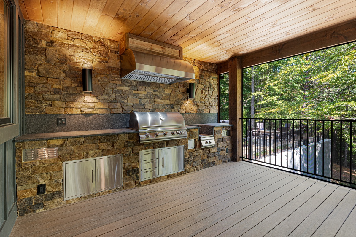 After enjoying an afternoon of gaming with family and friends, step out onto the entry level fully screened in deck space for a breath of fresh air. The space features a covered gas-burning fireplace, lounge chairs, rocker chairs, ceiling fans, an outdoor kitchen with a gas grill and side burners, and a dining table set for eight. The front deck offers wooden rockers and end tables, along with a Solo Stove smokeless firepit for cozy evenings under the stars.