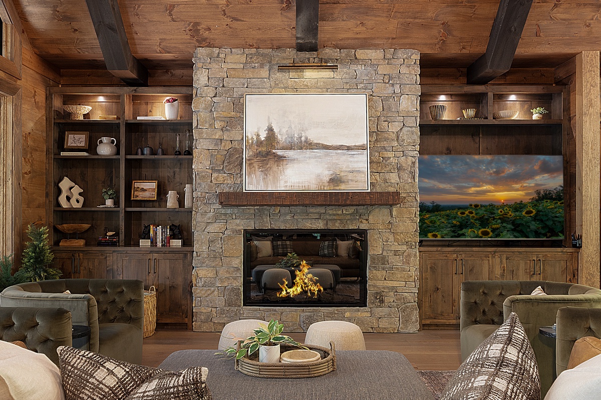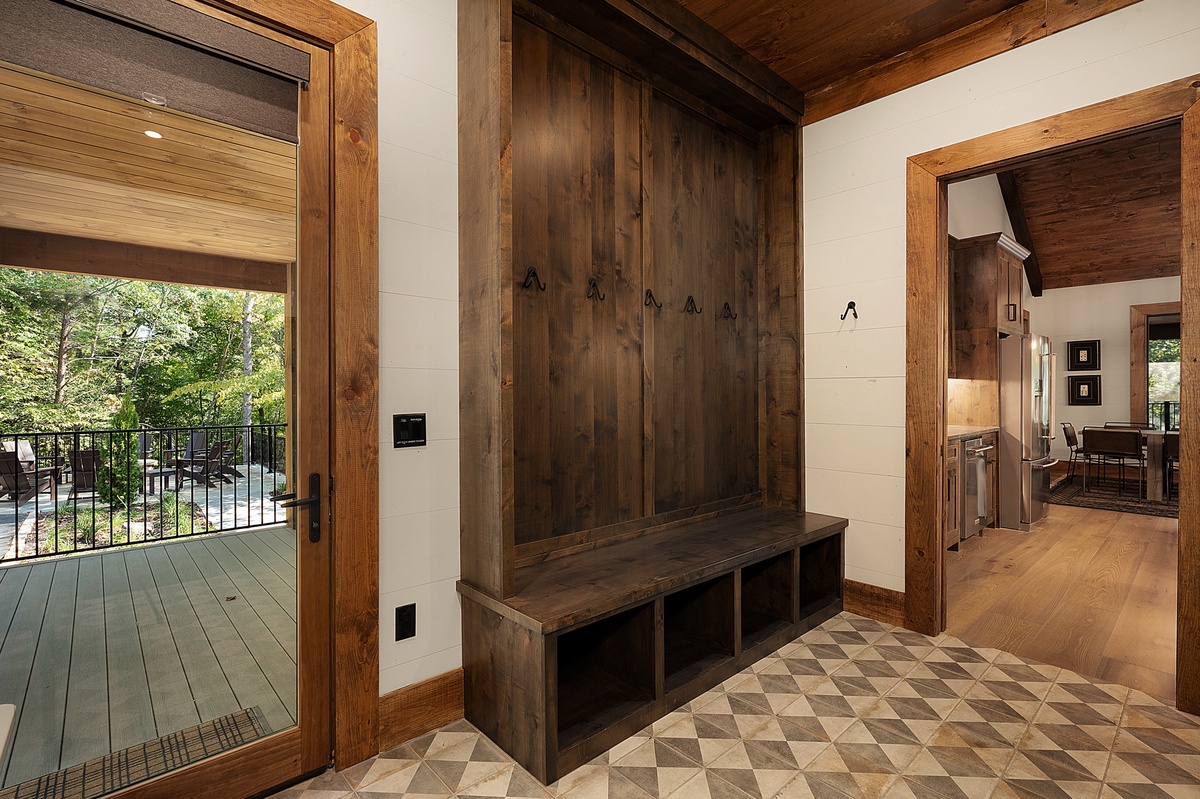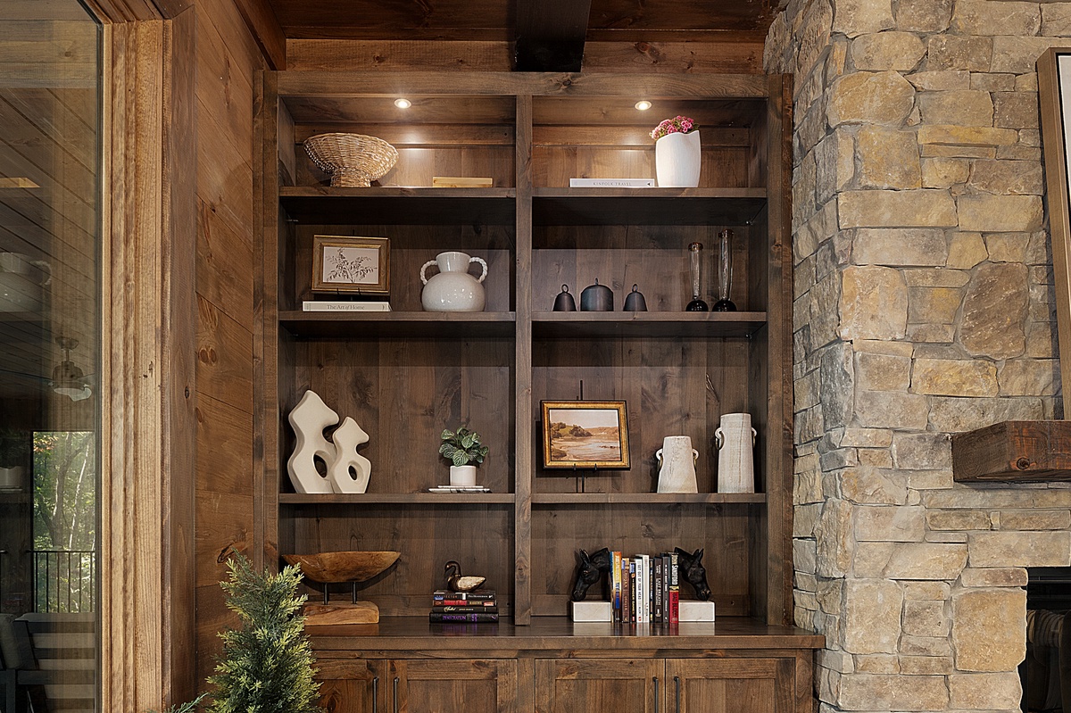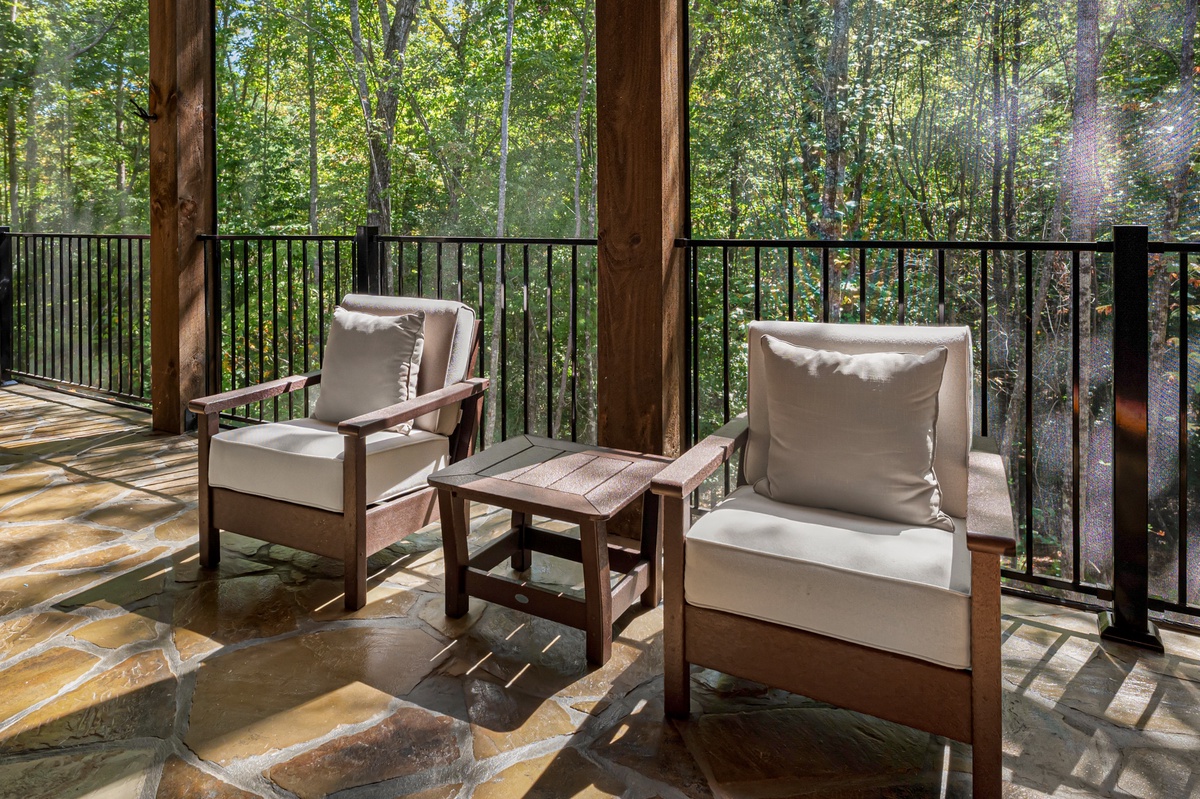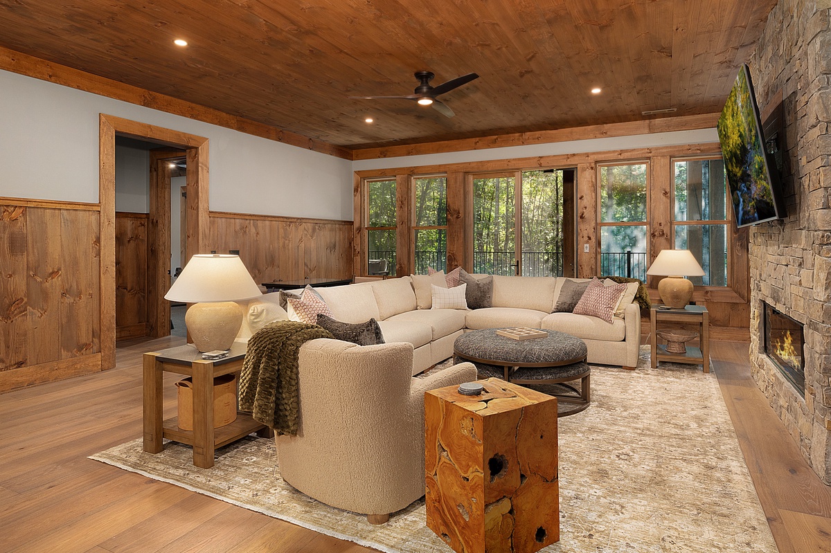 After enjoying an afternoon of gaming with family and friends, step out onto the entry level fully screened in deck space for a breath of fresh air. The space features a covered gas-burning fireplace, lounge chairs, rocker chairs, ceiling fans, an outdoor kitchen with a gas grill and side burners, and a dining table set for eight. The front deck offers wooden rockers and end tables, along with a Solo Stove smokeless firepit for cozy evenings under the stars.
