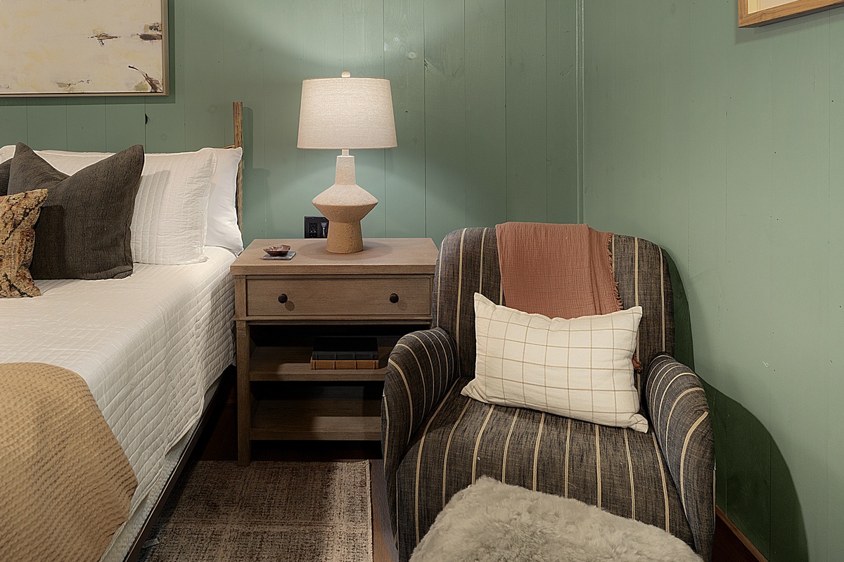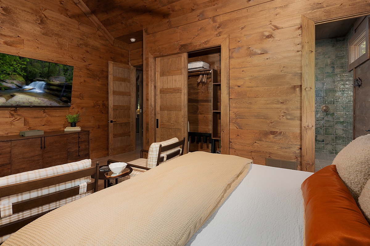 The four King Suites, spanning across two levels reflect the lush attributes of the shared living area. Each are outfitted with a 65" TV, dresser, plush chairs and a closet. These suites continue the theme of indulgence with en-suite bathrooms featuring tile showers with multiple shower heads, warming toilet seats with bidets, and light up makeup mirrors  - ensuring that every guest enjoys comfort and privacy.