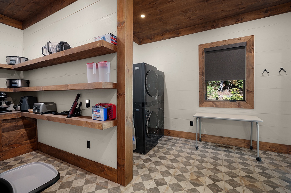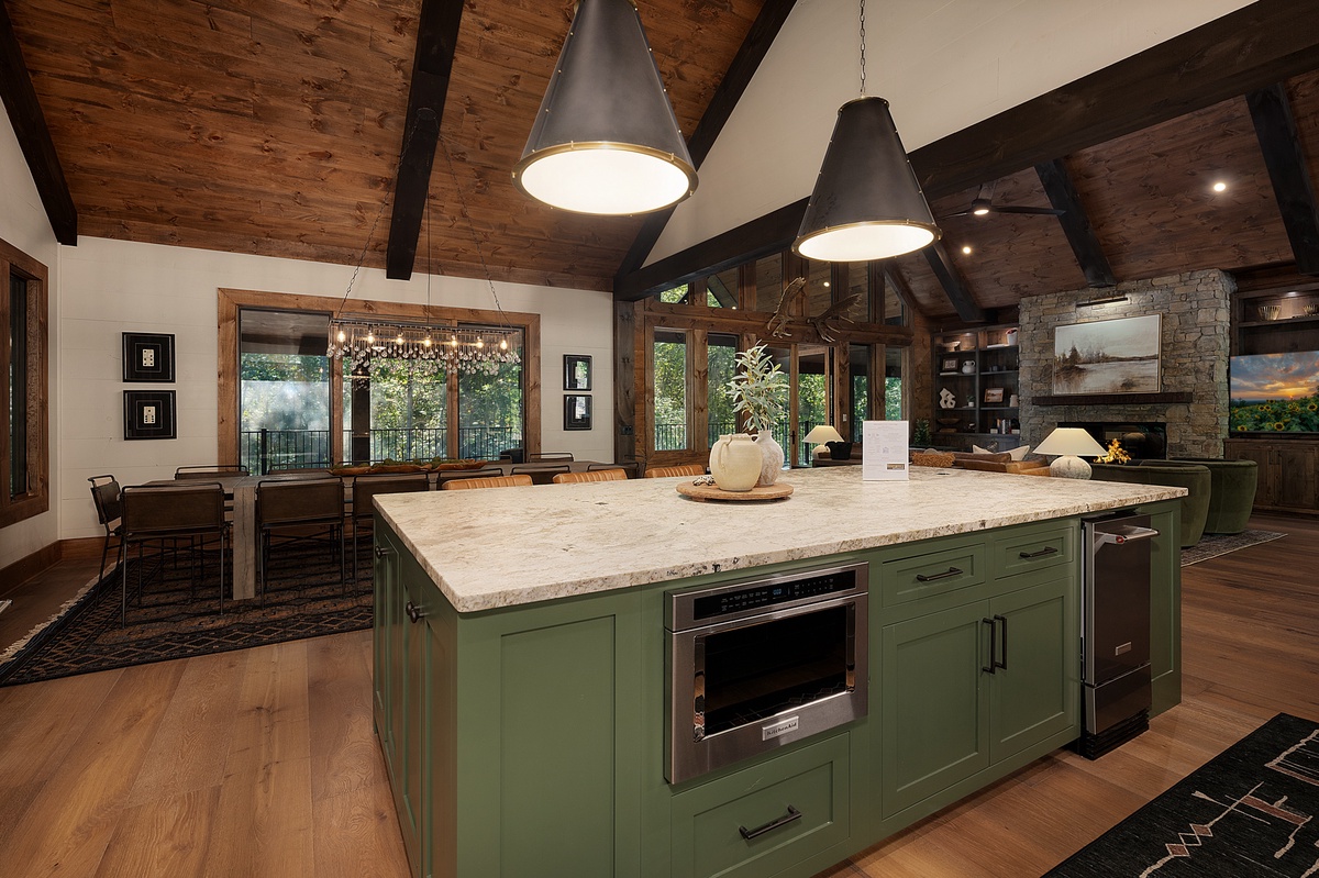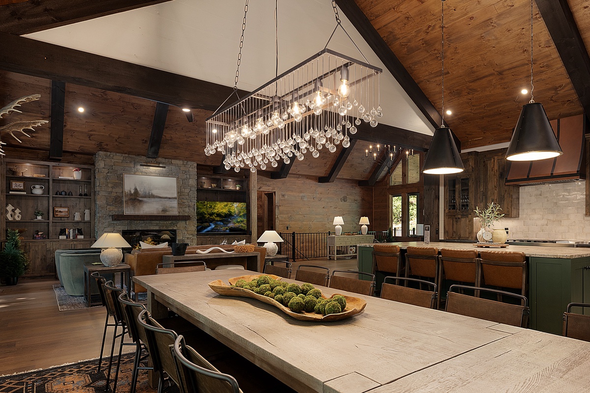 All this excitement before ever stepping foot inside. As you walk through the grand entryway the foyer offers lounge seating and teases the extravagance of the rest of the property. The living room invites you to unwind with its cozy couch, four velvet chairs, and two footstools, all centered around a striking stone-stacked electric fireplace. Watch your favorite shows on the massive 75" TV, or gather around the dining table, which comfortably seats 14, for memorable meals with loved ones. The kitchen is a chef’s dream, featuring a gas stovetop, double oven, and two dishwashers, all complemented by a spacious kitchen island with seating for four. Just off the kitchen, the laundry room and pantry offer two sets of washers and dryers, abundant counter space, and easy access to the deck.
