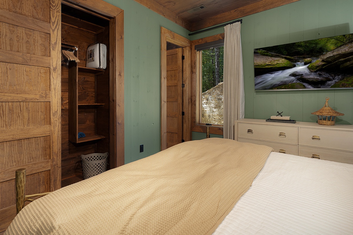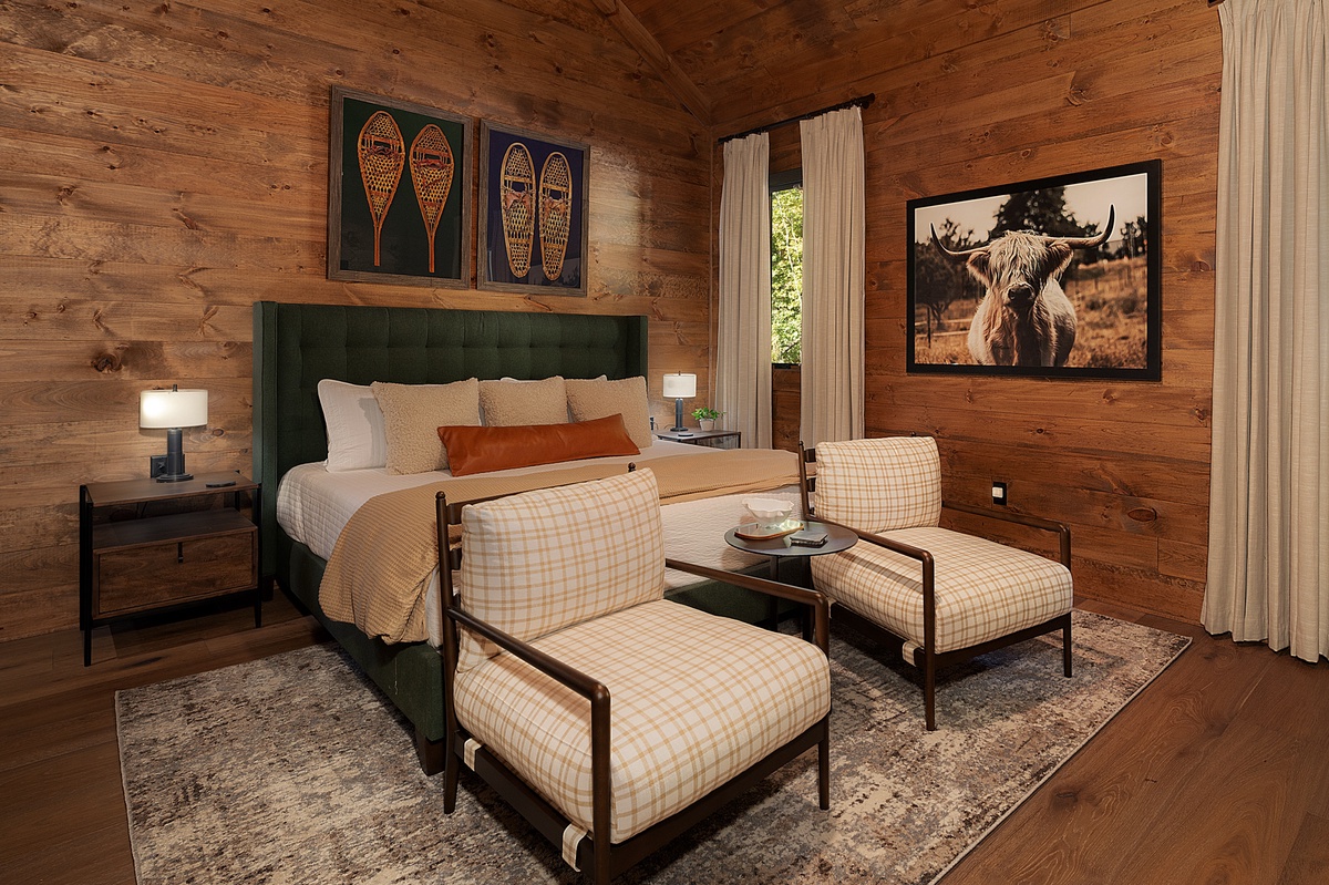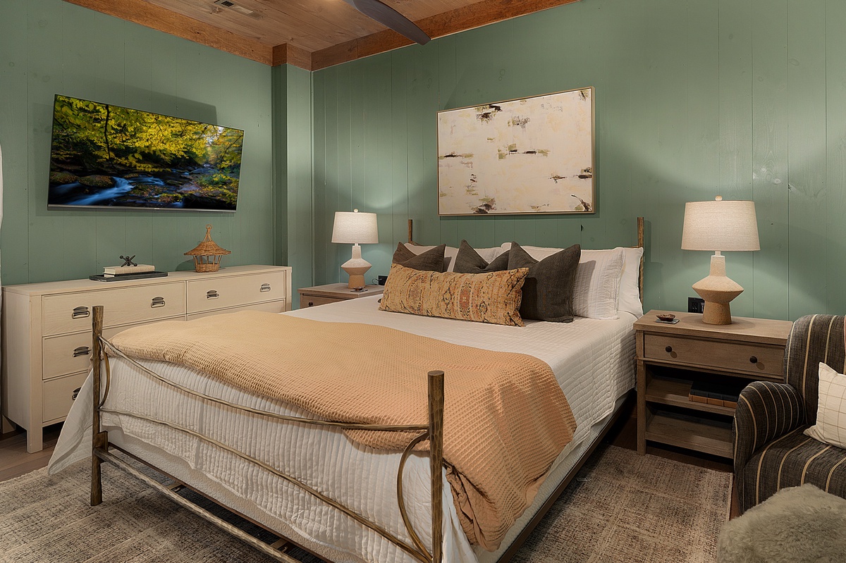 For larger groups or families, the spacious bunkroom is a perfect addition. This room is equipped with two plush king beds and two twin XL beds, making it an ideal space for both children and adults. A custom-built closet provides ample storage, while a 70" TV offers entertainment for movie nights or lazy mornings in bed. The cozy chair and footstool in the corner create a quiet nook for reading or unwinding after a day of mountain adventures.