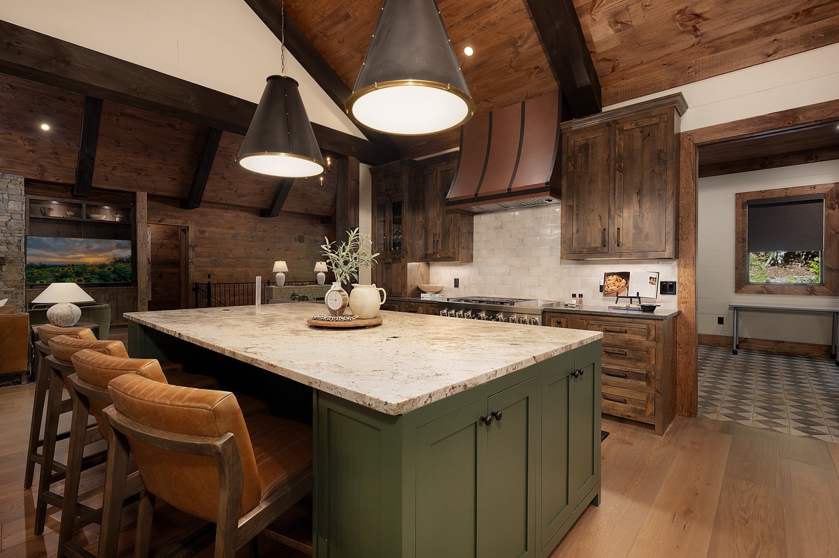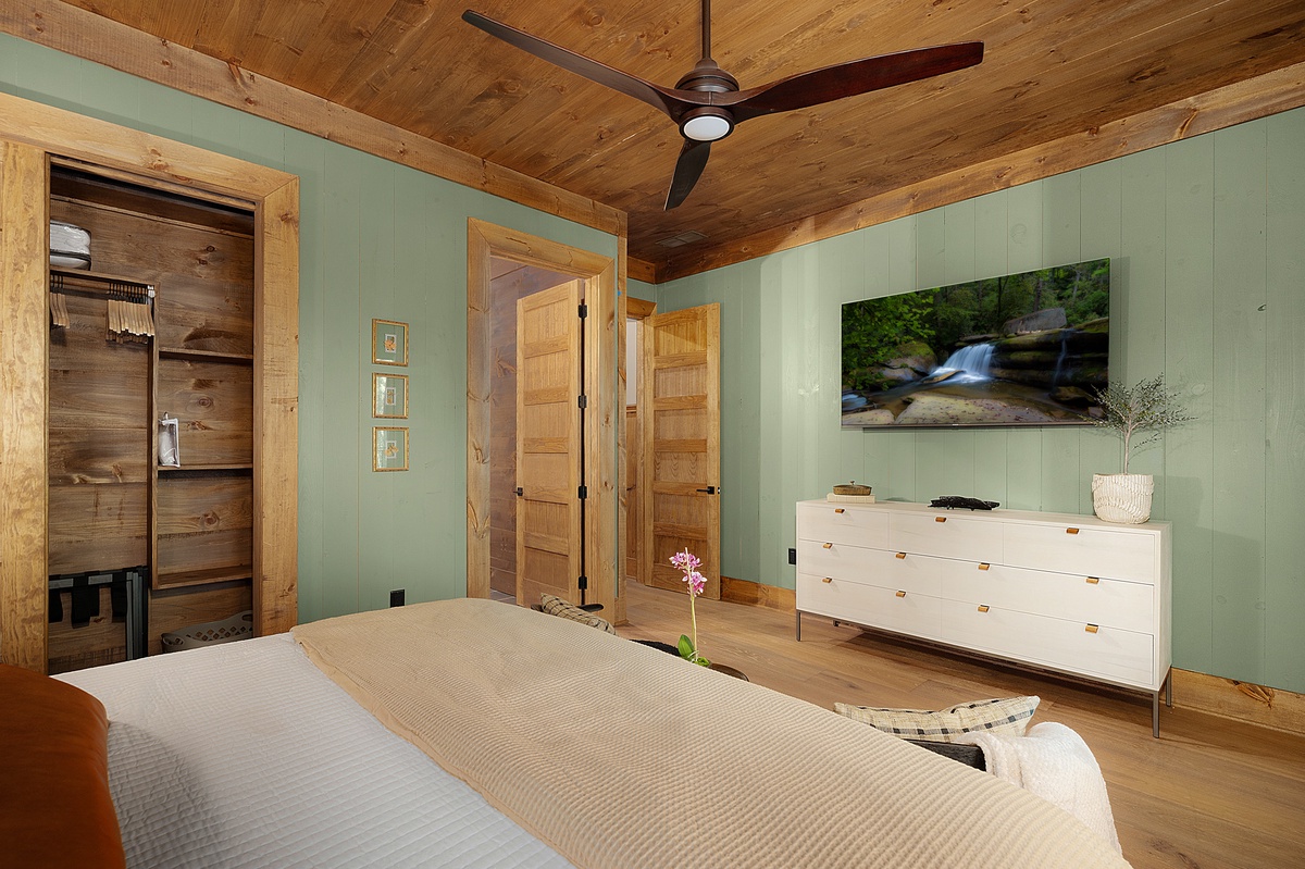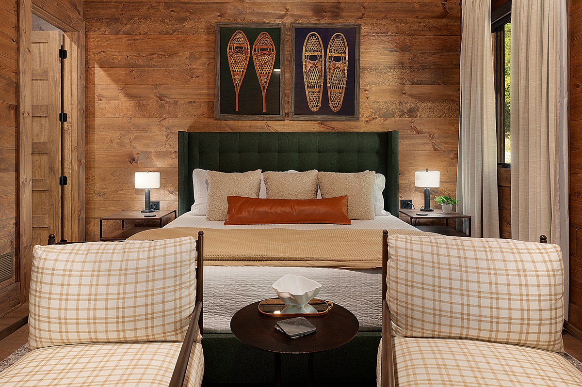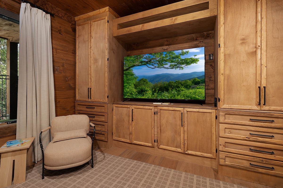For larger groups or families, the spacious bunkroom is a perfect addition. This room is equipped with two plush king beds and two twin XL beds, making it an ideal space for both children and adults. A custom-built closet provides ample storage, while a 70" TV offers entertainment for movie nights or lazy mornings in bed. The cozy chair and footstool in the corner create a quiet nook for reading or unwinding after a day of mountain adventures.