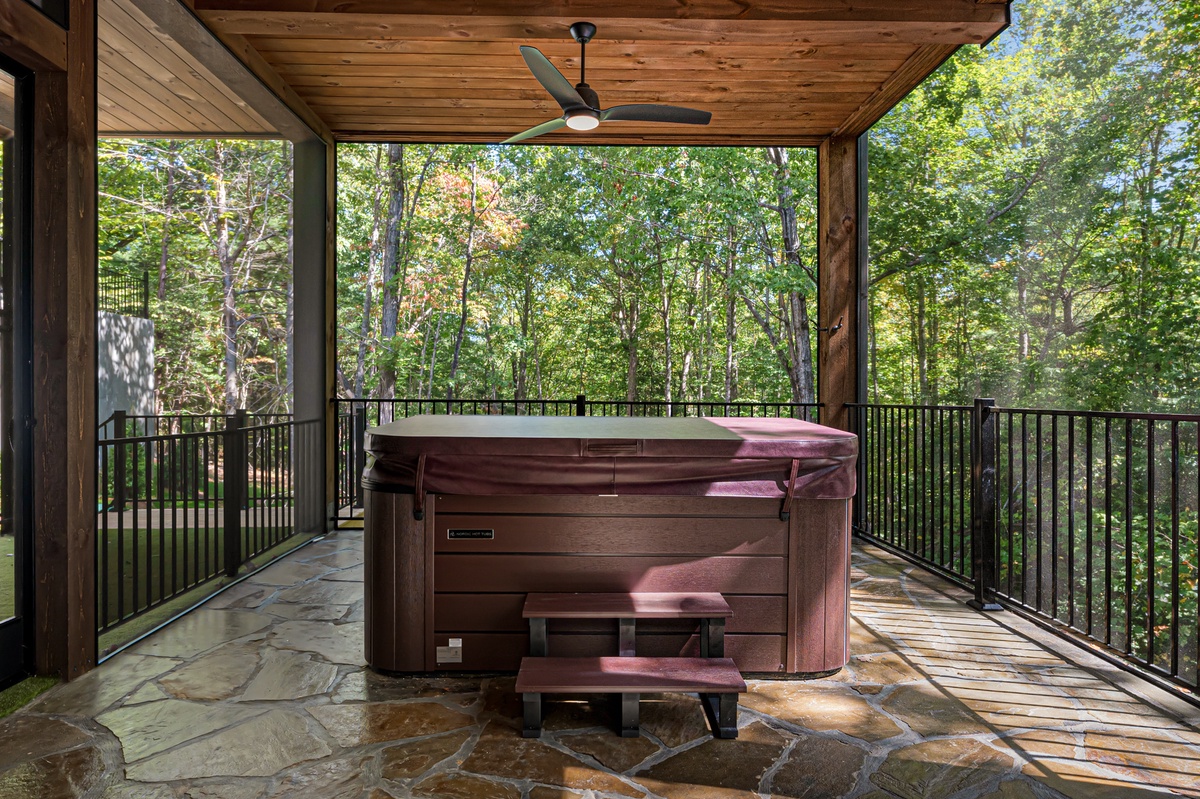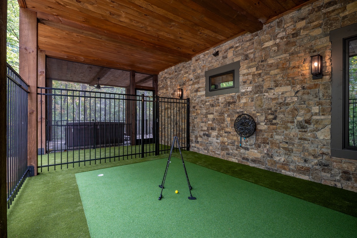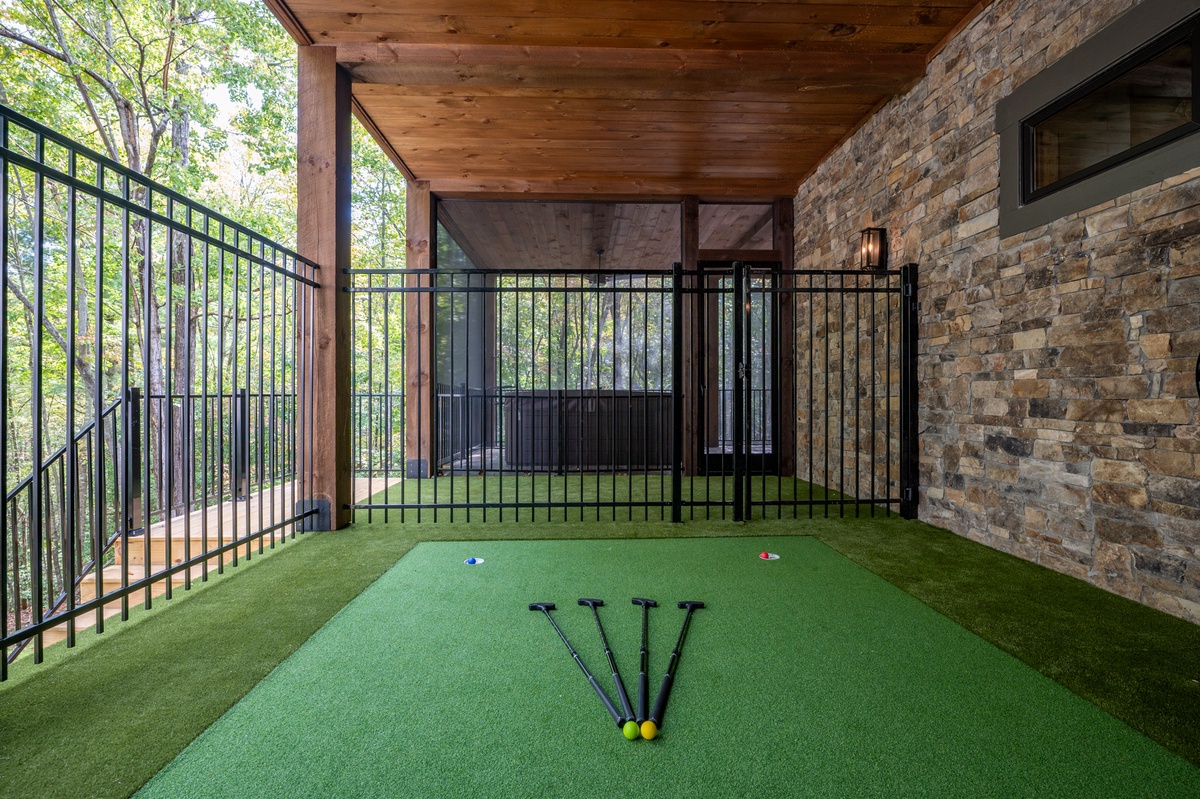 On the lower-level deck, you'll find a covered hot tub, another gas-burning fireplace, and a variety of games, including Giant Connect 4, Giant Jenga, and Cornhole. The unscreened area features a fenced putting green with clubs and balls provided, perfect for sharpening your putting skills.