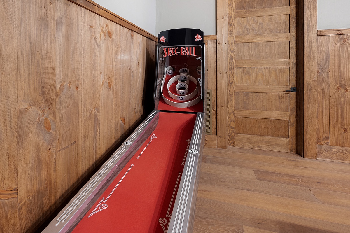 The lower-level entertainment area offers the ultimate chill zone. The den offers sectional seating around an electric fireplace and a 75" TV, perfect for movie nights. Challenge friends and family to a game of pool, or Skee Ball. A custom wet bar stocked with assorted color wine tumblers, an ice bucket, and a cocktail recipe book adds a touch of sophistication to your evenings.