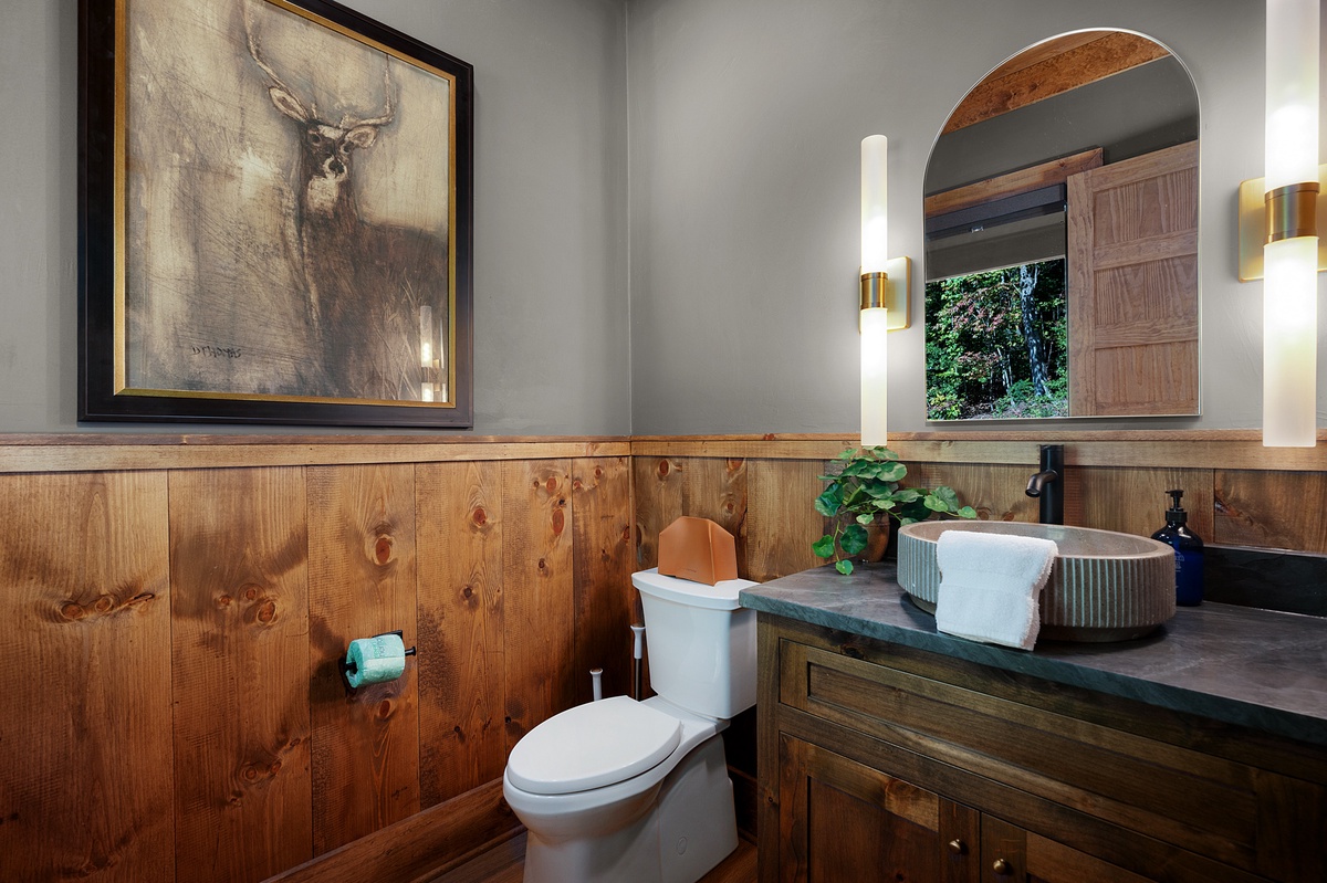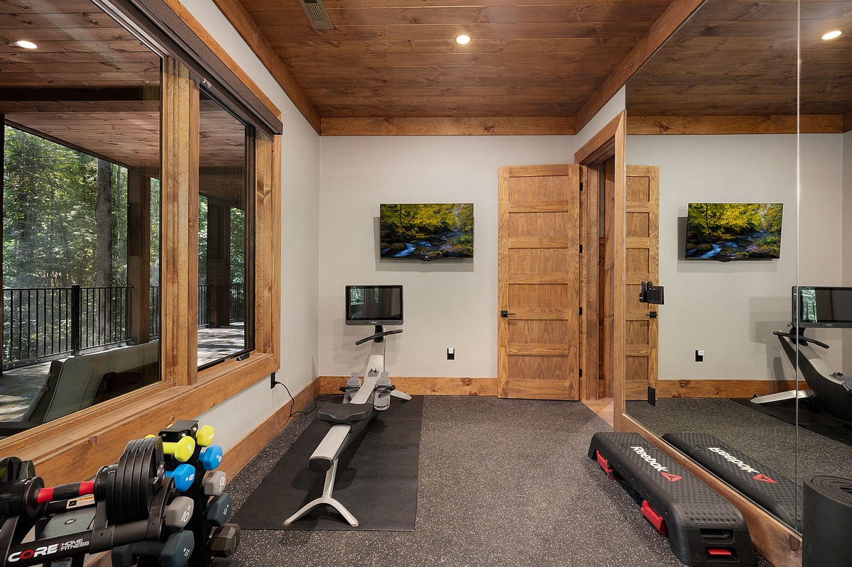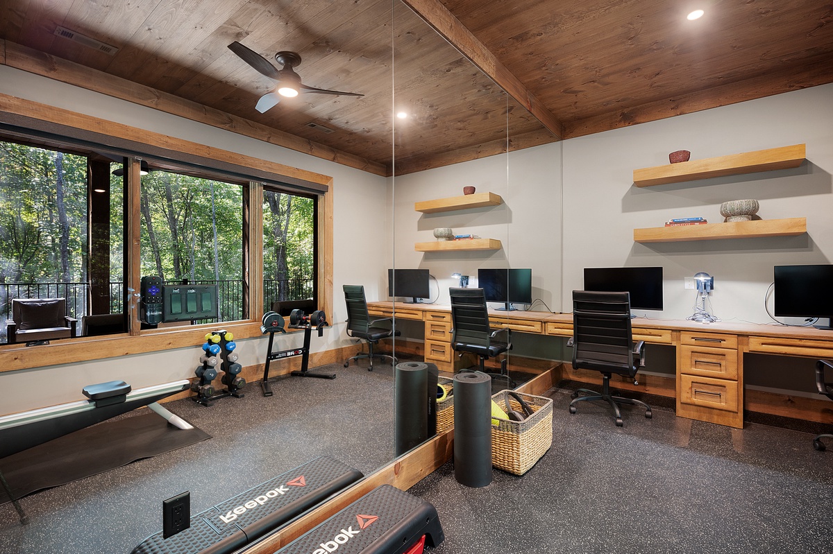 For those in your party that have the occasional work to check on or have daily workout routines, there is an office and equipped gym area that is both functional and stylish. The gym is outfitted with a Hydrow Royer, perfect for rowing enthusiasts, along with an adjustable bench and a set of dumbbells for strength training. A complete mirrored wall adds a professional touch, allowing for perfect form during workouts. For those who need to catch up on work or stay connected during their stay, the office area provides two workstations, each with a 32" monitor, ergonomic chairs, and high-speed internet access. Even in this serene mountain setting, you'll have all the tools you need to stay productive.