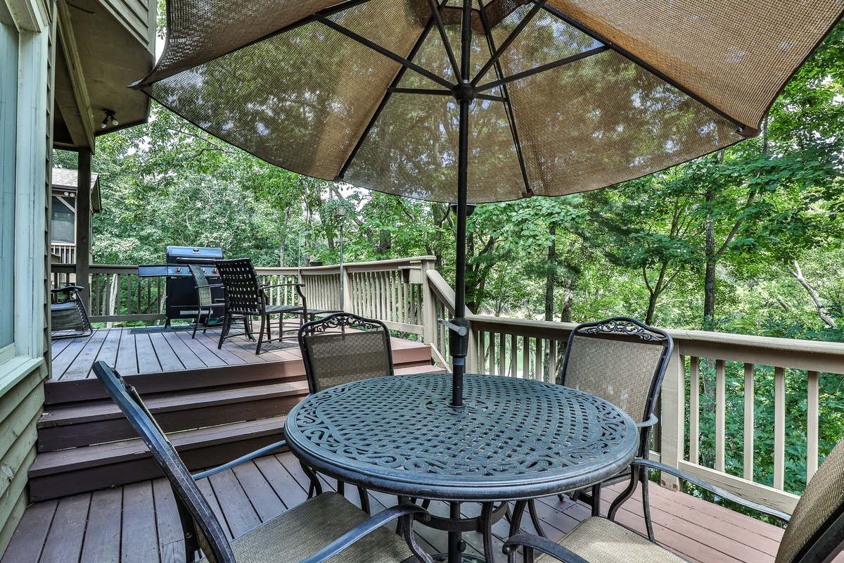 The house features upstairs and downstairs decks with a gas grill and plenty of lounge chairs to enjoy the fantastic Lake Sconti and mountain views.