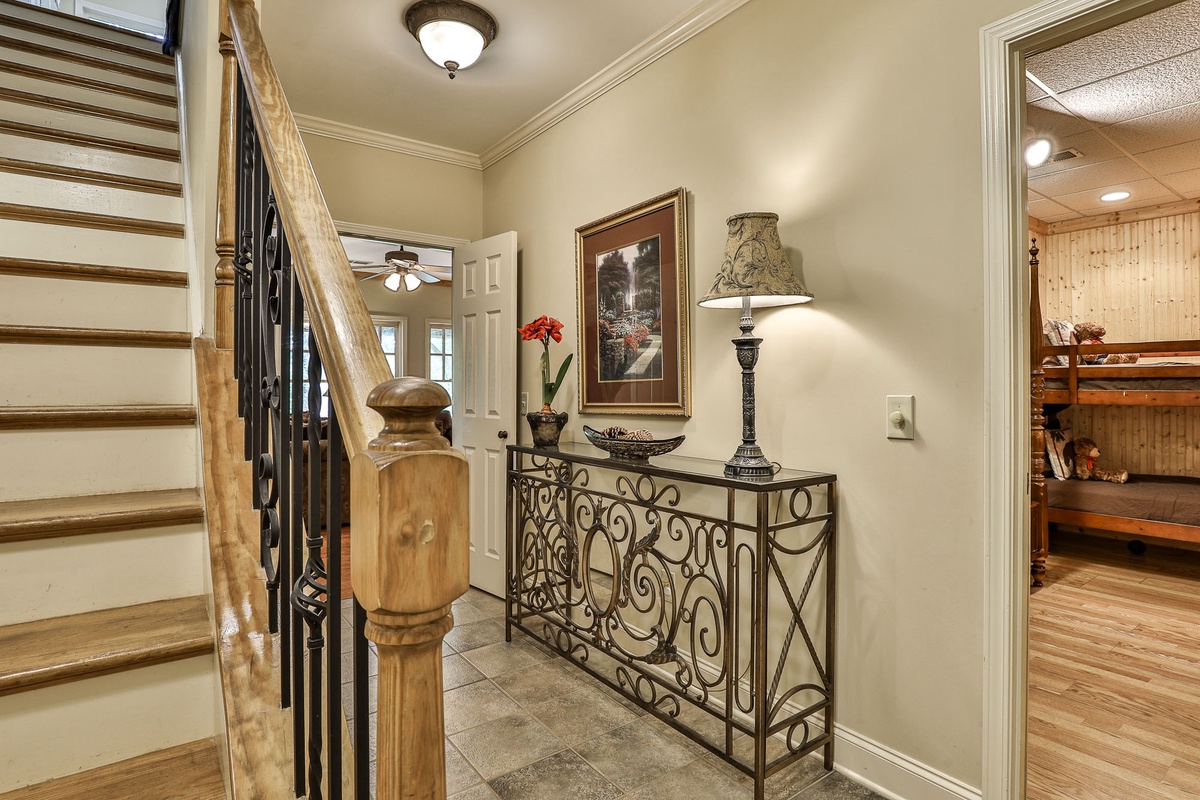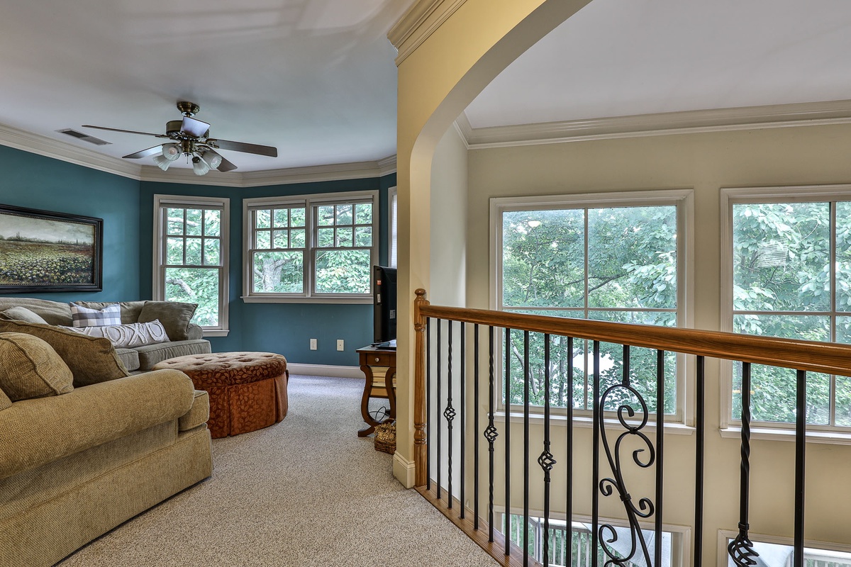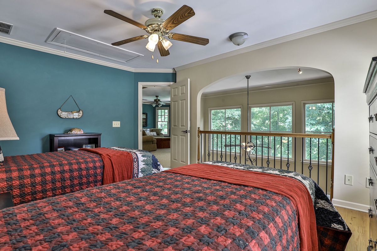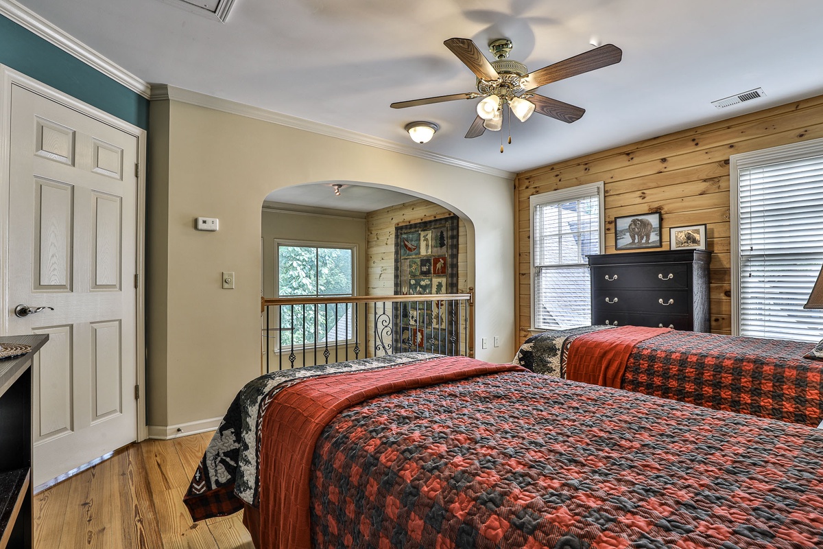 Upstairs, you'll find a bedroom with two twin beds and a bedroom with a queen bed, a large Jack and Jill bath, and a loft area great for kids or quiet reading. The downstairs level includes a bedroom with a queen bed, a resting room with a queen bed and bunk beds, a large Jack and Jill bath, and a sizable recreation room with a flat-screen TV and fireplace.