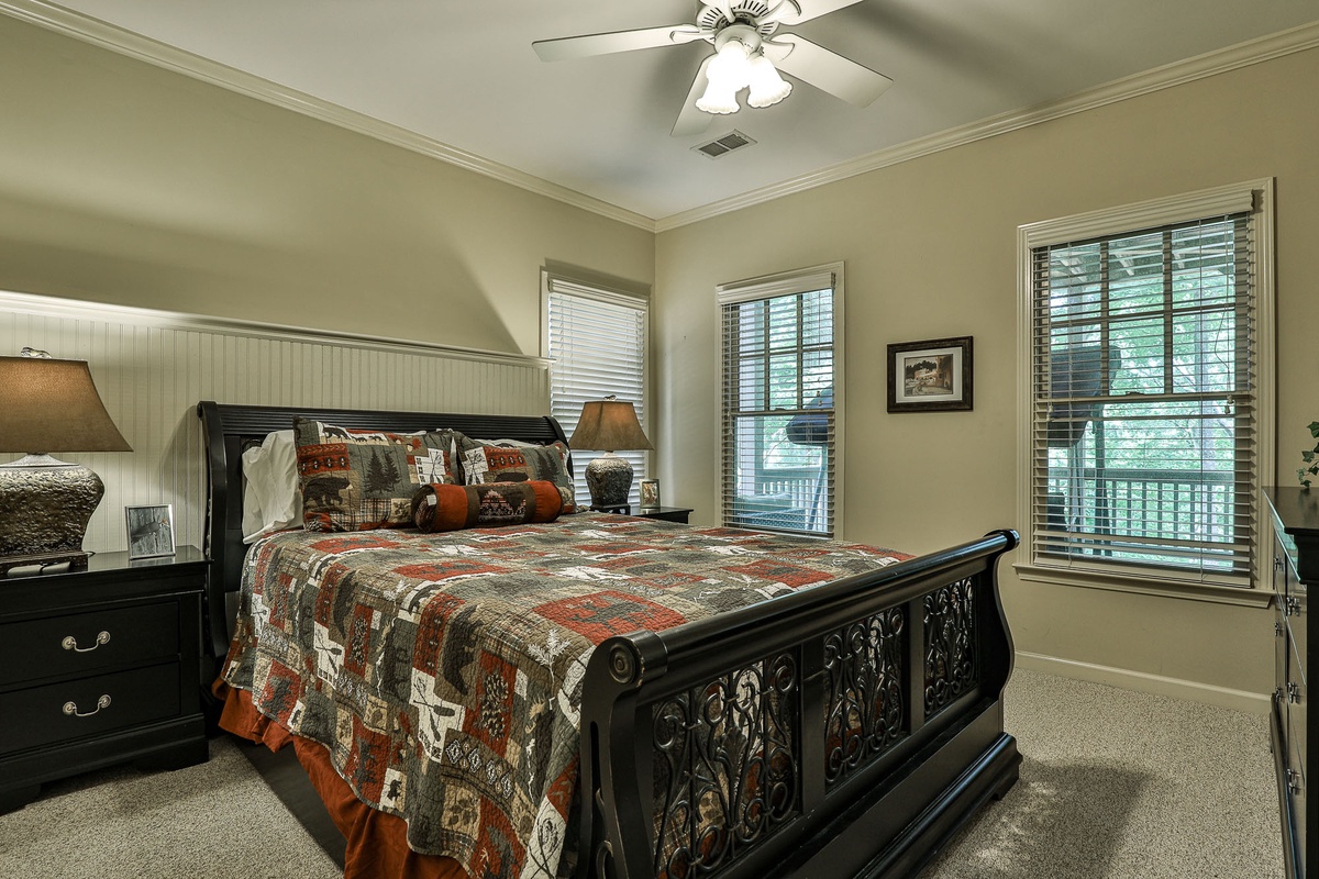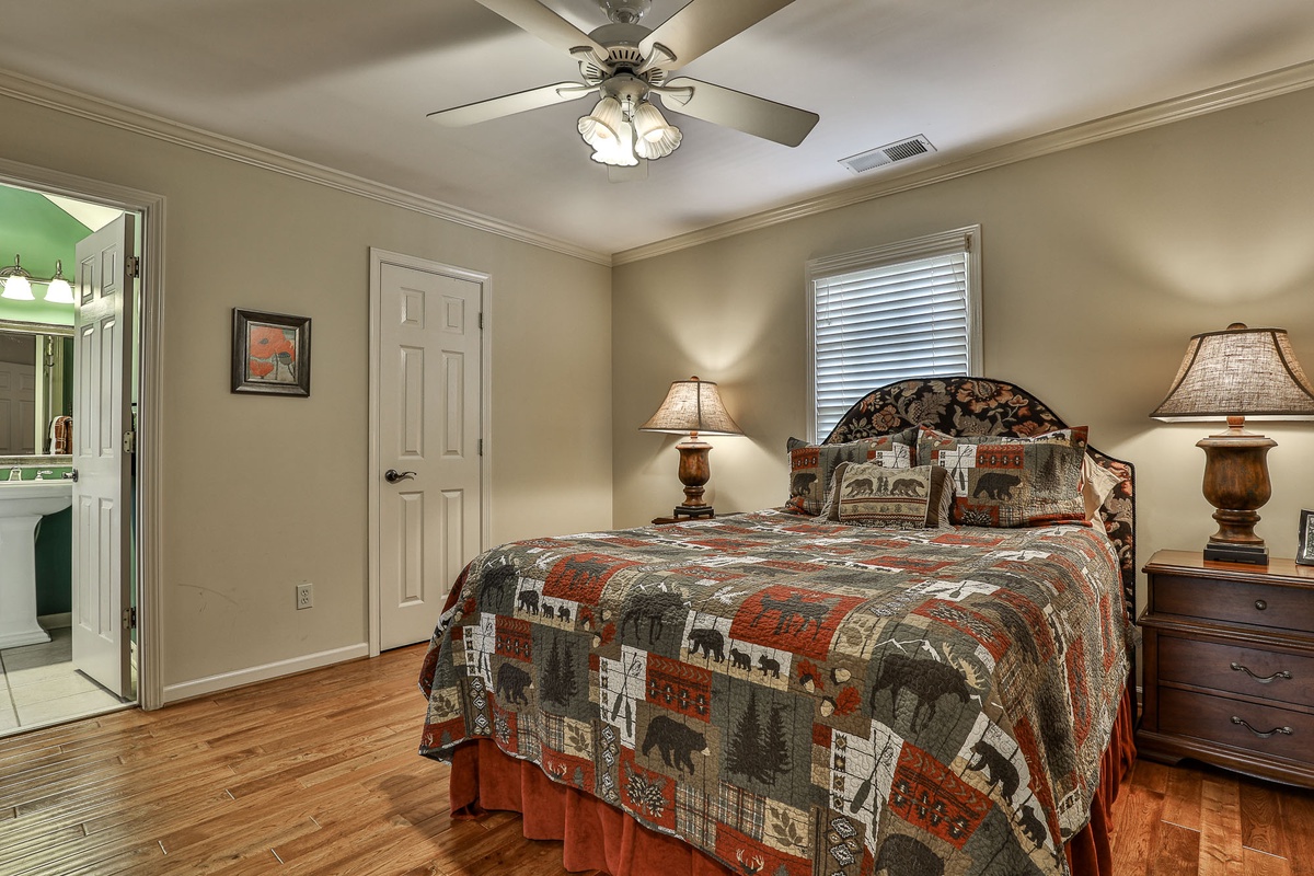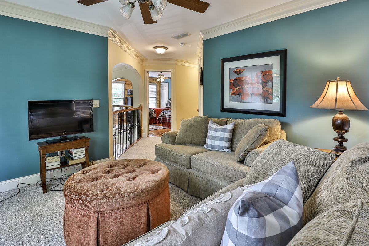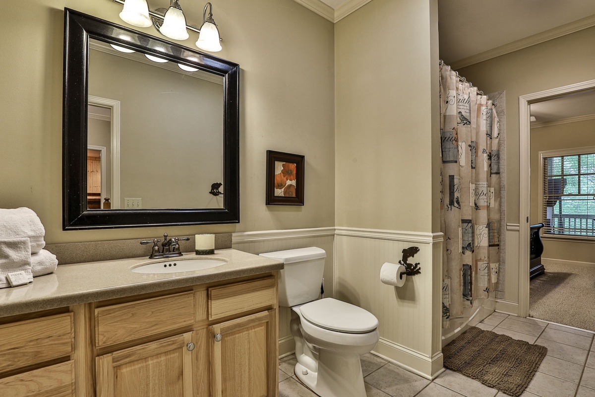 Upstairs, you'll find a bedroom with two twin beds and a bedroom with a queen bed, a large Jack and Jill bath, and a loft area great for kids or quiet reading. The downstairs level includes a bedroom with a queen bed, a resting room with a queen bed and bunk beds, a large Jack and Jill bath, and a sizable recreation room with a flat-screen TV and fireplace.