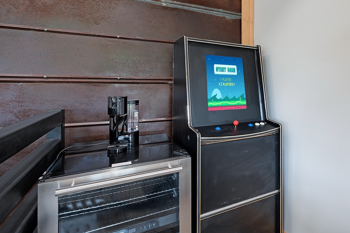 Upstairs, the fun continues. You’ll find two more bedrooms, another king bedroom and a cozy queen bedroom, along with a full shared bathroom. The bonus loft is a guest favorite: with a queen bed, mini coffee bar, wine fridge, retro arcade console, and a second seating area with its own table and views, it’s the perfect hangout zone for late-night games or lazy mornings watching the lake sparkle.