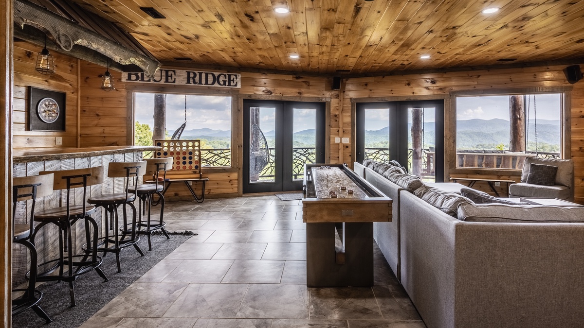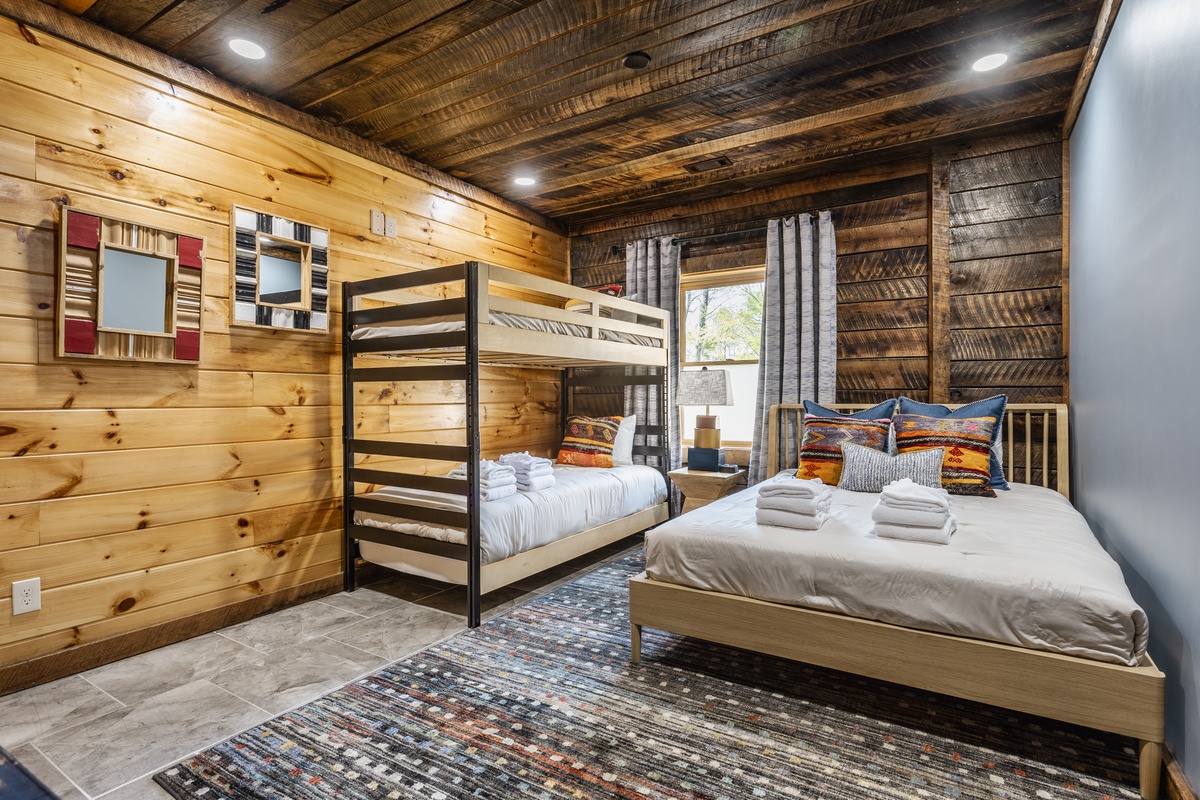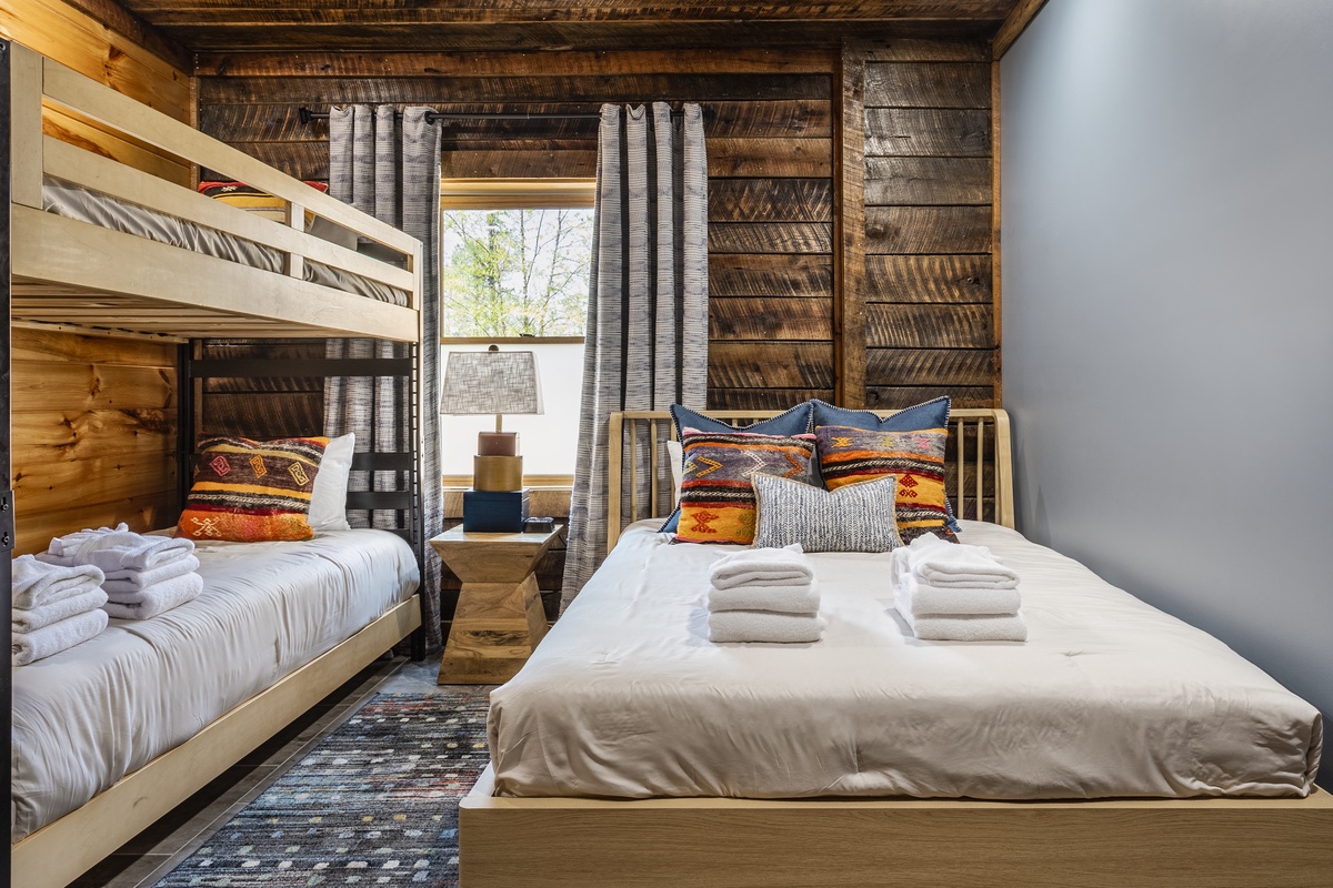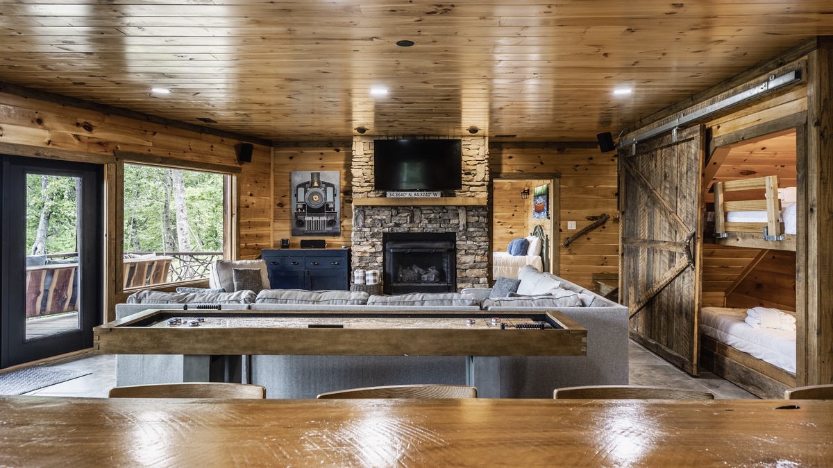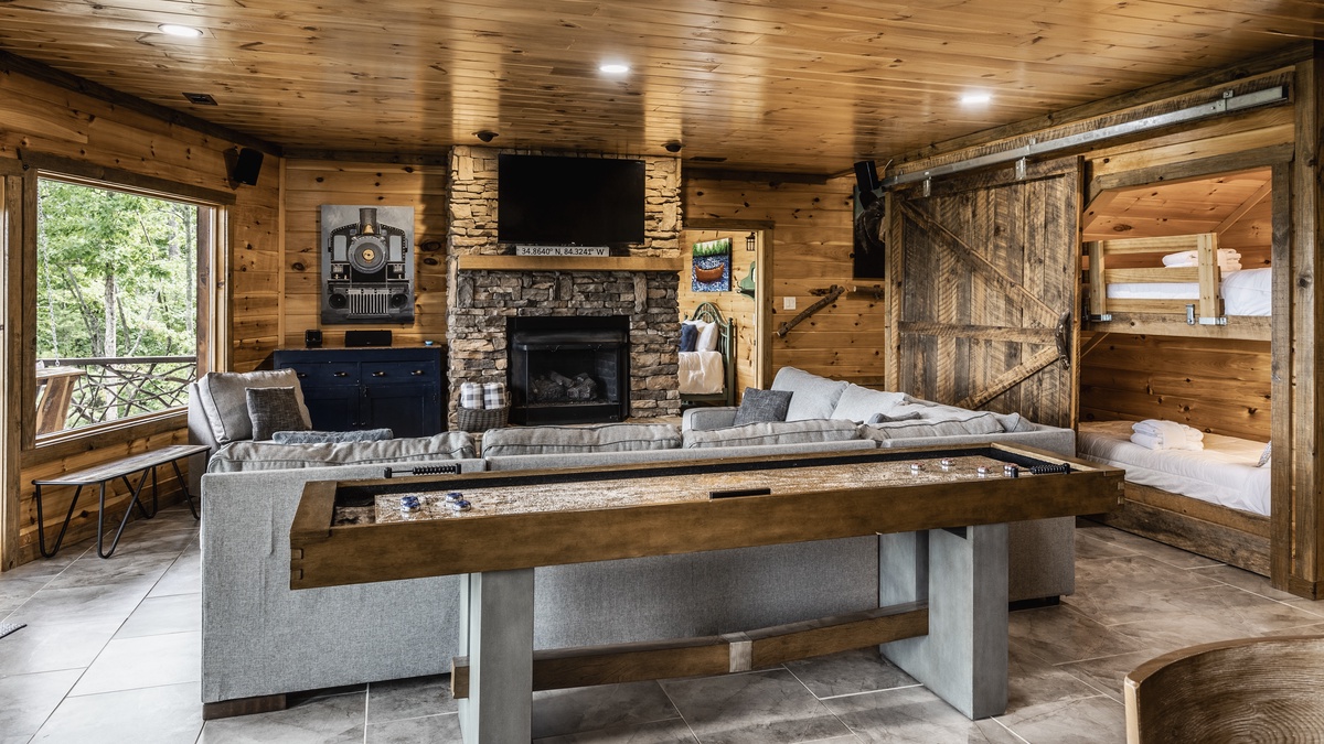 Venture to the upper level and discover the primary king suite, a serene oasis with a workstation overlooking the mountains, a cozy chair, dresser, couch, and a 55” TV. Indulge in the luxury of a large soaking tub, tile shower, and walk-in closet, all enhanced by a sliding privacy barn door. The mountain views from this level are simply spectacular, providing a perfect backdrop for relaxation and inspiration. The lower level of Lookout Lodge is designed for entertainment and comfort, featuring a den with sectional seating, a gas fireplace, and a 65” TV. Enjoy friendly competition at the shuffleboard table or mix up cocktails at the custom wet bar equipped with a mini fridge, microwave, and cocktail set. This level also includes a built-in twin bunk bed with a sliding barn door, a queen bedroom with a vaulted ceiling, and a fourth bedroom with a queen bed and twin bunks, ensuring ample space for everyone. A shared bathroom with double sinks, a tile shower, and a laundry room add to the convenience.