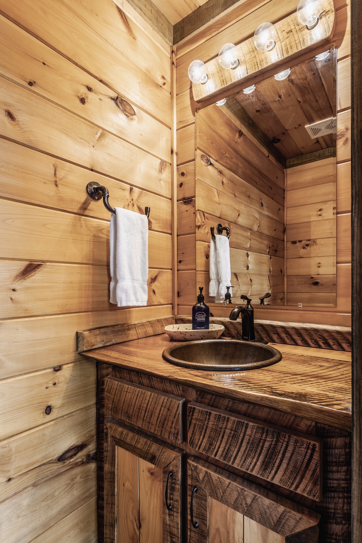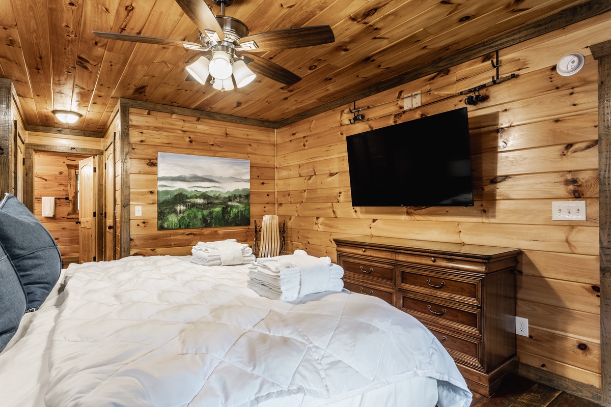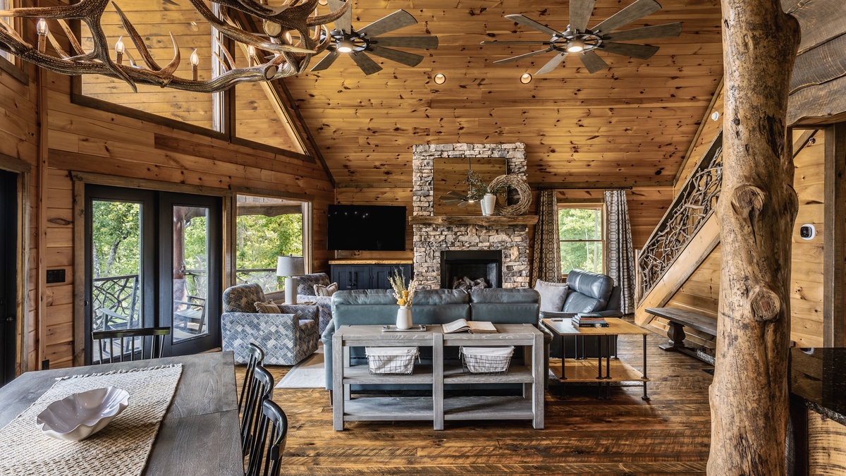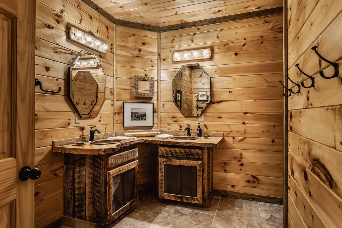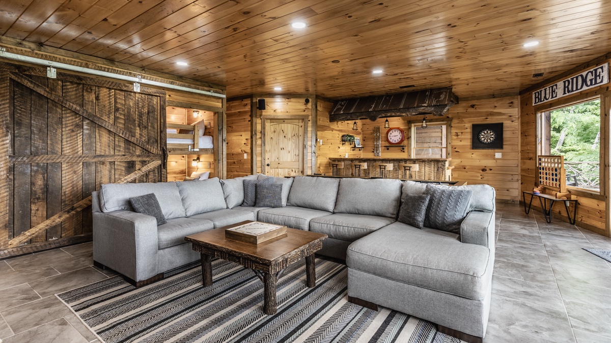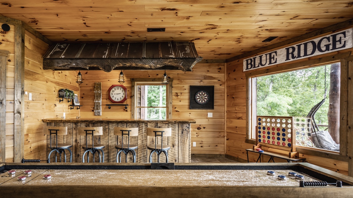 Venture to the upper level and discover the primary king suite, a serene oasis with a workstation overlooking the mountains, a cozy chair, dresser, couch, and a 55” TV. Indulge in the luxury of a large soaking tub, tile shower, and walk-in closet, all enhanced by a sliding privacy barn door. The mountain views from this level are simply spectacular, providing a perfect backdrop for relaxation and inspiration. The lower level of Lookout Lodge is designed for entertainment and comfort, featuring a den with sectional seating, a gas fireplace, and a 65” TV. Enjoy friendly competition at the shuffleboard table or mix up cocktails at the custom wet bar equipped with a mini fridge, microwave, and cocktail set. This level also includes a built-in twin bunk bed with a sliding barn door, a queen bedroom with a vaulted ceiling, and a fourth bedroom with a queen bed and twin bunks, ensuring ample space for everyone. A shared bathroom with double sinks, a tile shower, and a laundry room add to the convenience.