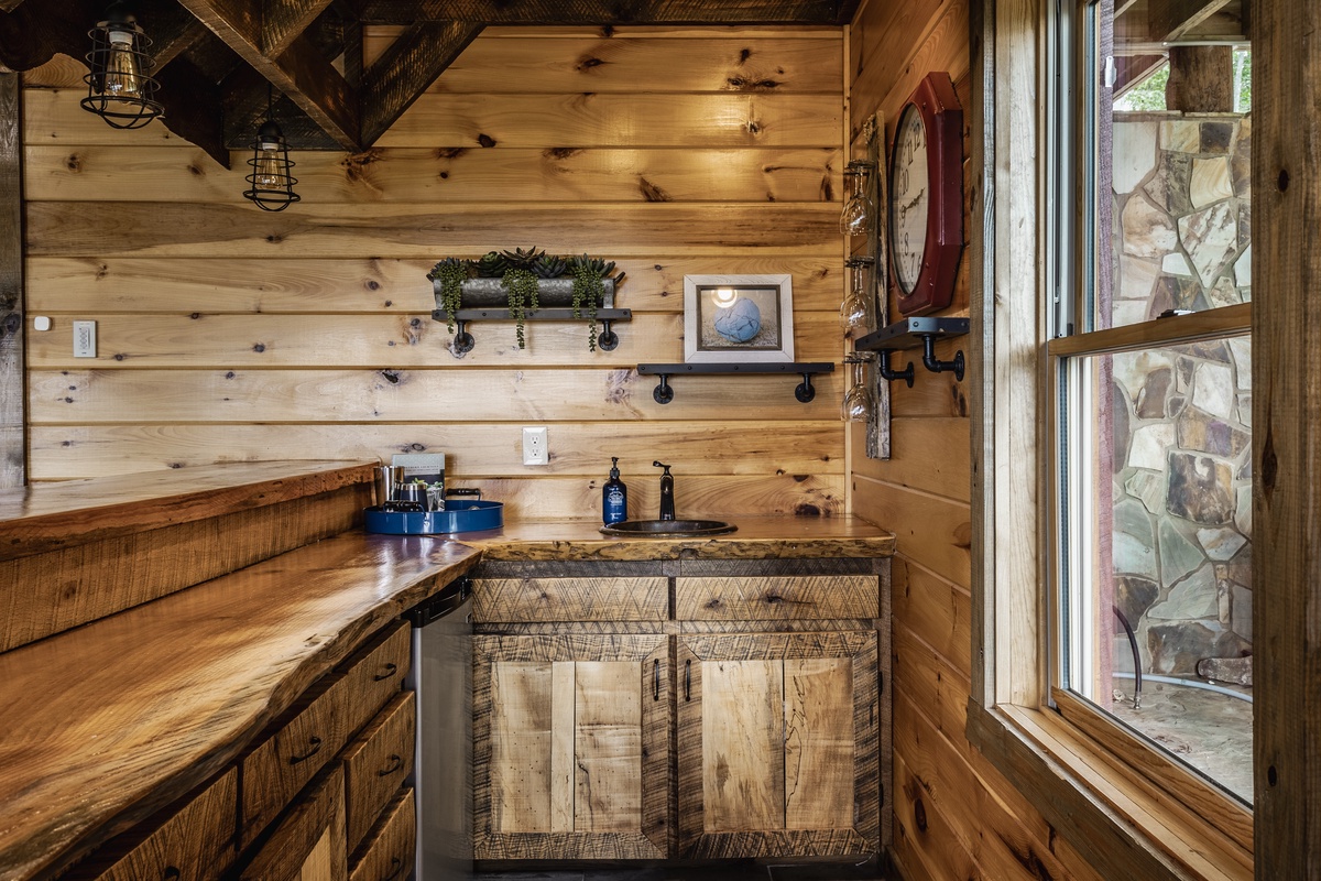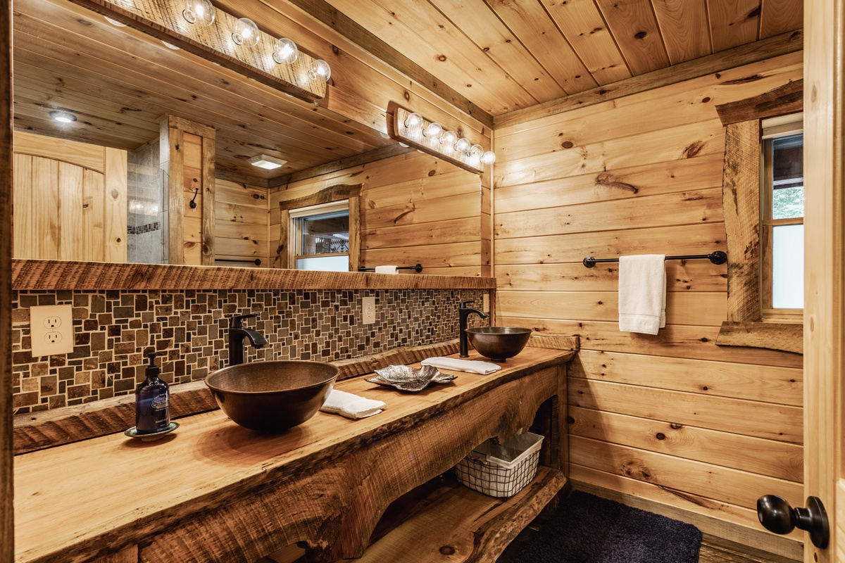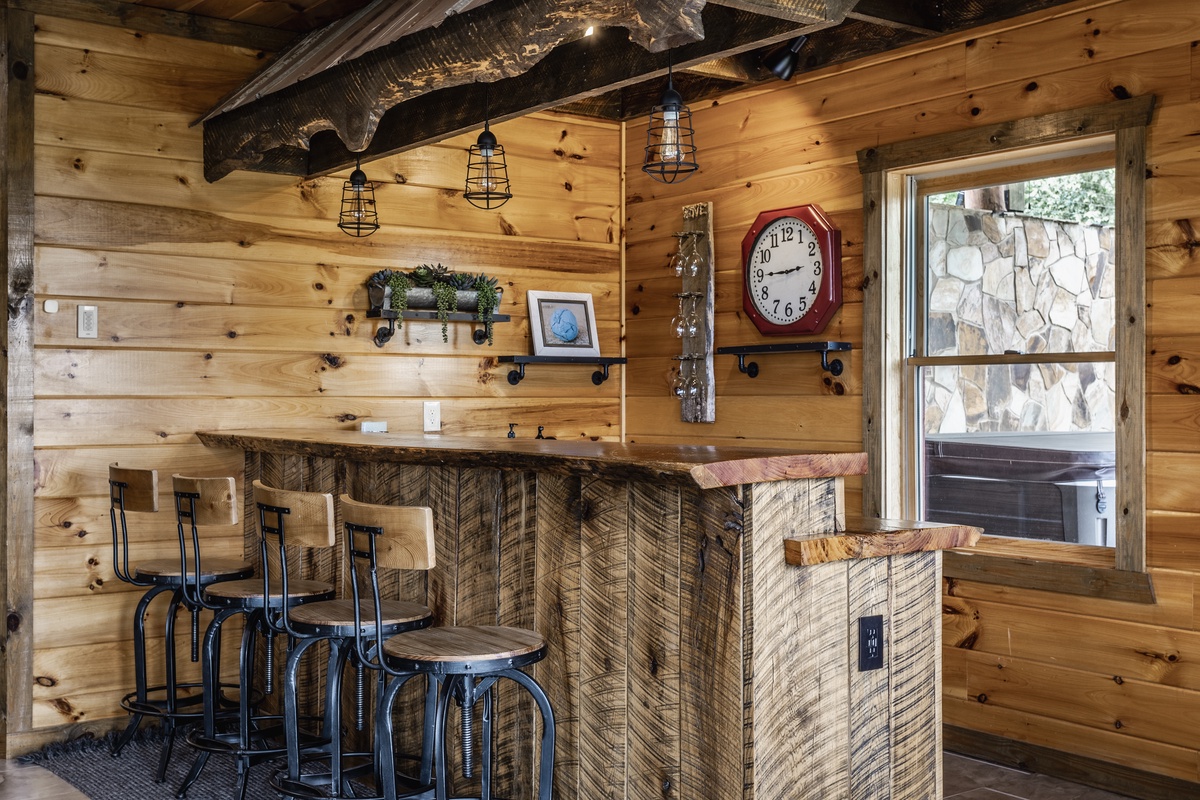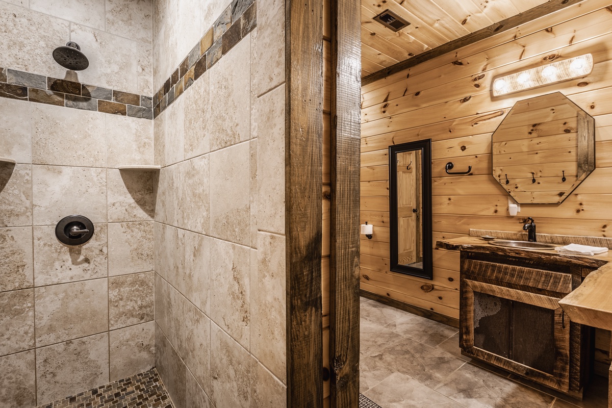 Venture to the upper level and discover the primary king suite, a serene oasis with a workstation overlooking the mountains, a cozy chair, dresser, couch, and a 55” TV. Indulge in the luxury of a large soaking tub, tile shower, and walk-in closet, all enhanced by a sliding privacy barn door. The mountain views from this level are simply spectacular, providing a perfect backdrop for relaxation and inspiration. The lower level of Lookout Lodge is designed for entertainment and comfort, featuring a den with sectional seating, a gas fireplace, and a 65” TV. Enjoy friendly competition at the shuffleboard table or mix up cocktails at the custom wet bar equipped with a mini fridge, microwave, and cocktail set. This level also includes a built-in twin bunk bed with a sliding barn door, a queen bedroom with a vaulted ceiling, and a fourth bedroom with a queen bed and twin bunks, ensuring ample space for everyone. A shared bathroom with double sinks, a tile shower, and a laundry room add to the convenience.