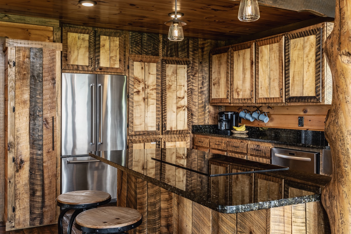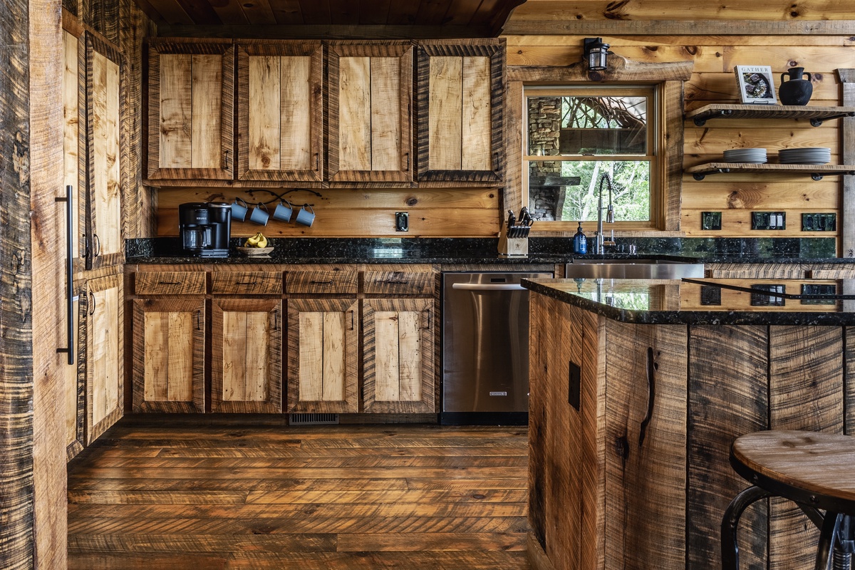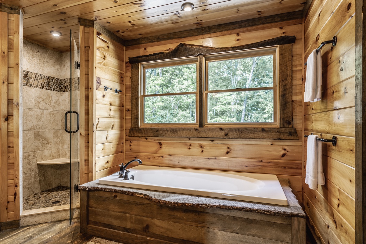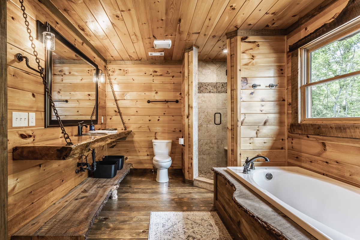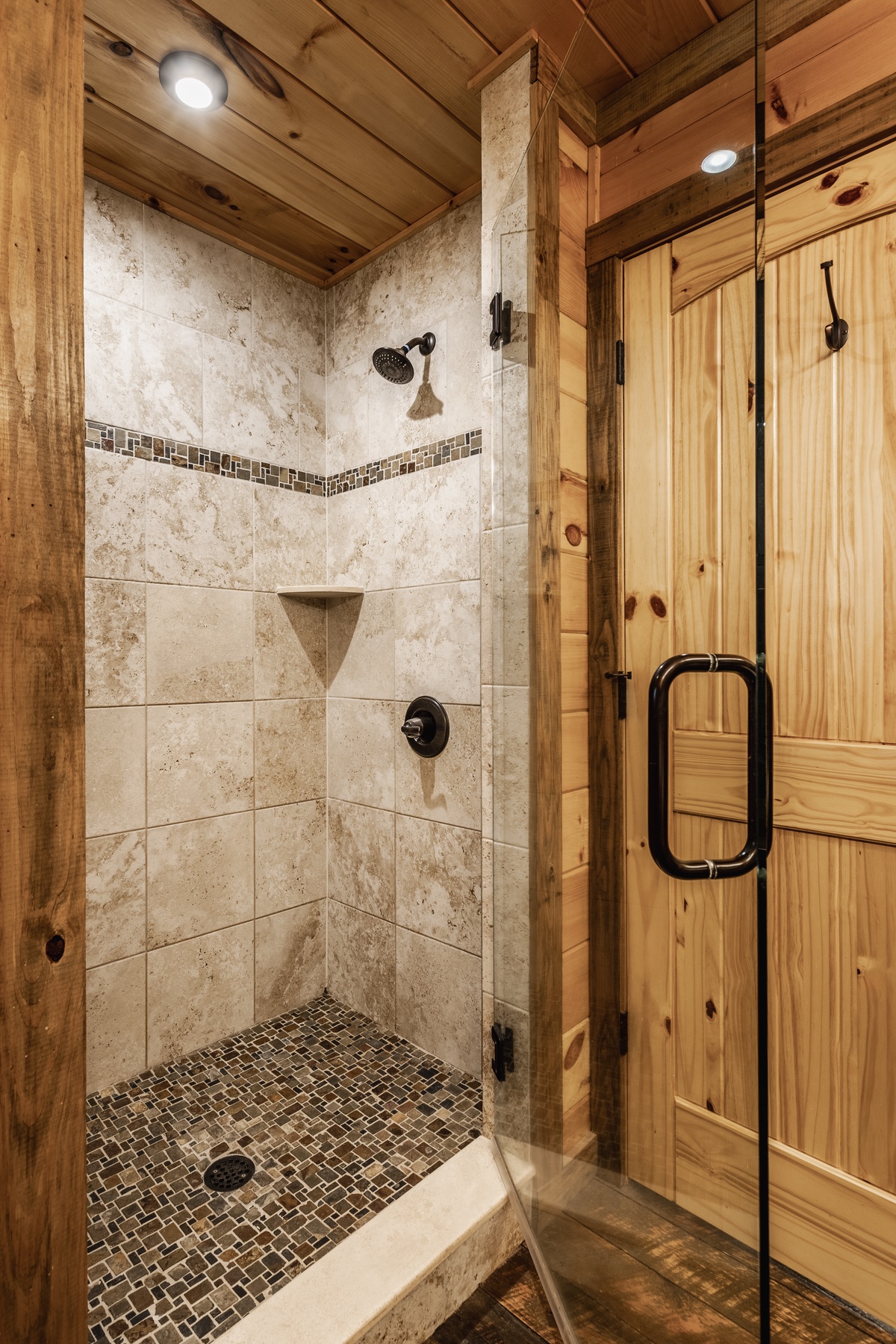 Venture to the upper level and discover the primary king suite, a serene oasis with a workstation overlooking the mountains, a cozy chair, dresser, couch, and a 55” TV. Indulge in the luxury of a large soaking tub, tile shower, and walk-in closet, all enhanced by a sliding privacy barn door. The mountain views from this level are simply spectacular, providing a perfect backdrop for relaxation and inspiration. The lower level of Lookout Lodge is designed for entertainment and comfort, featuring a den with sectional seating, a gas fireplace, and a 65” TV. Enjoy friendly competition at the shuffleboard table or mix up cocktails at the custom wet bar equipped with a mini fridge, microwave, and cocktail set. This level also includes a built-in twin bunk bed with a sliding barn door, a queen bedroom with a vaulted ceiling, and a fourth bedroom with a queen bed and twin bunks, ensuring ample space for everyone. A shared bathroom with double sinks, a tile shower, and a laundry room add to the convenience.