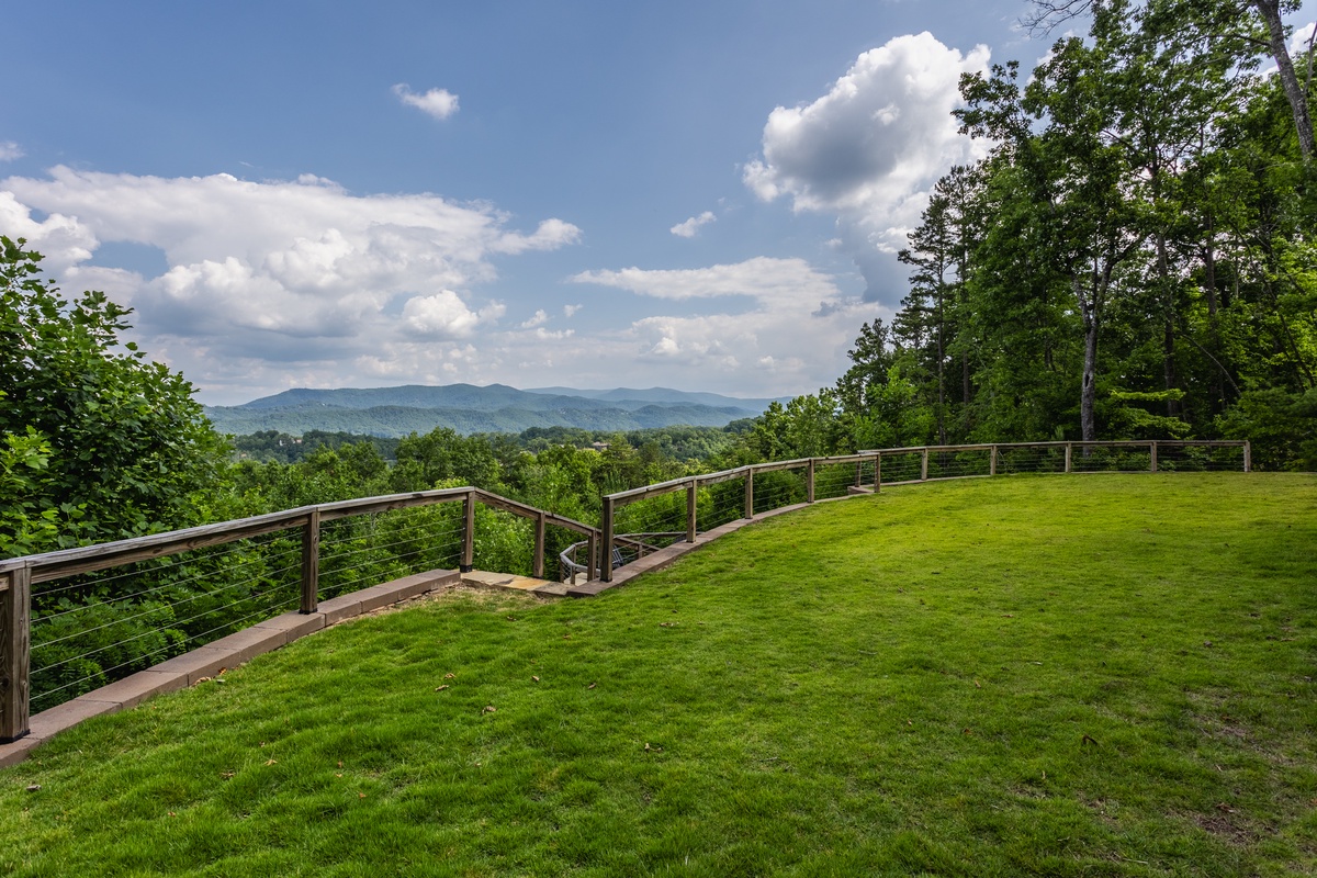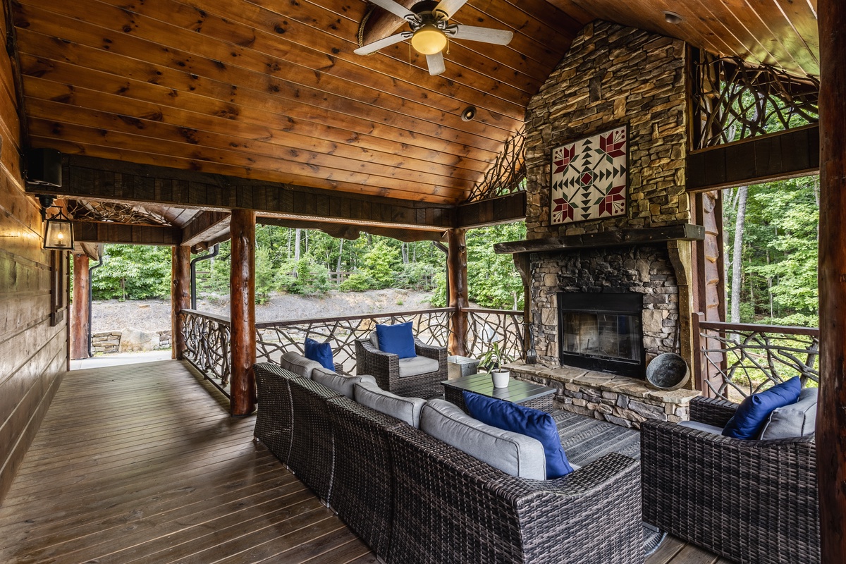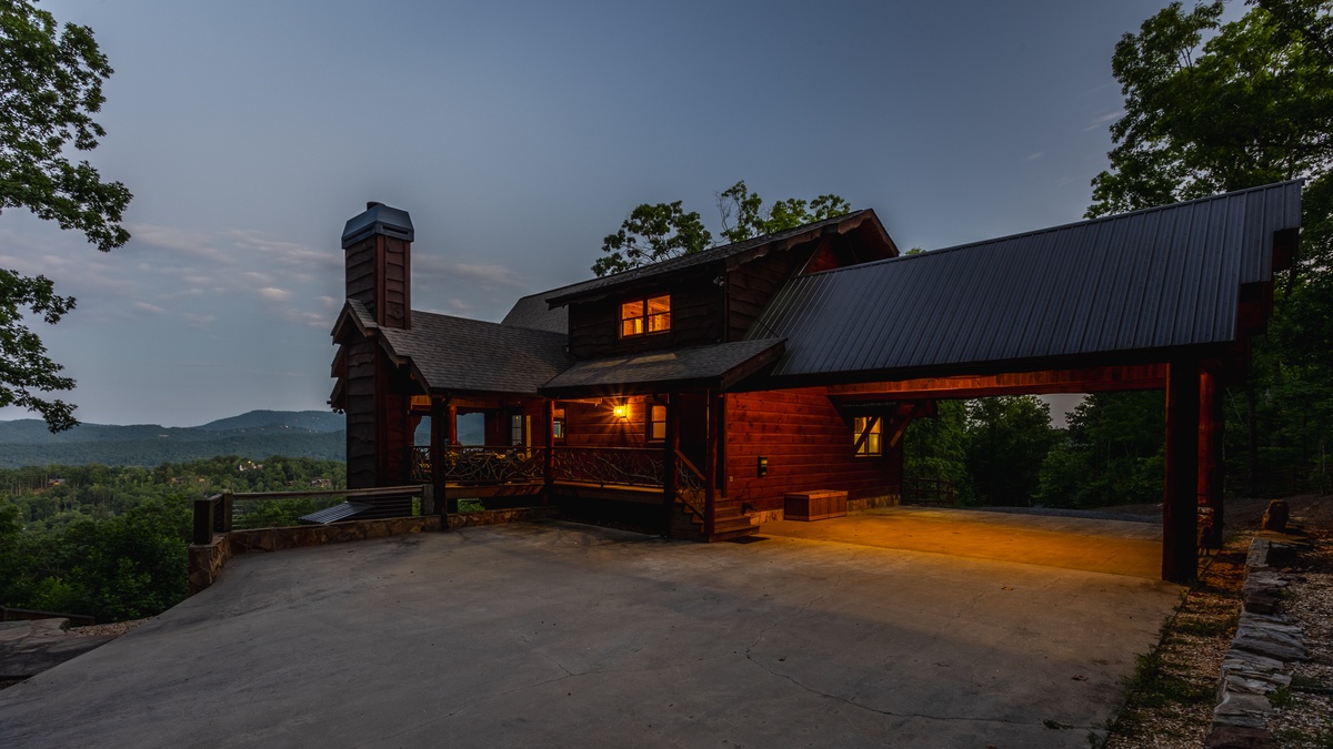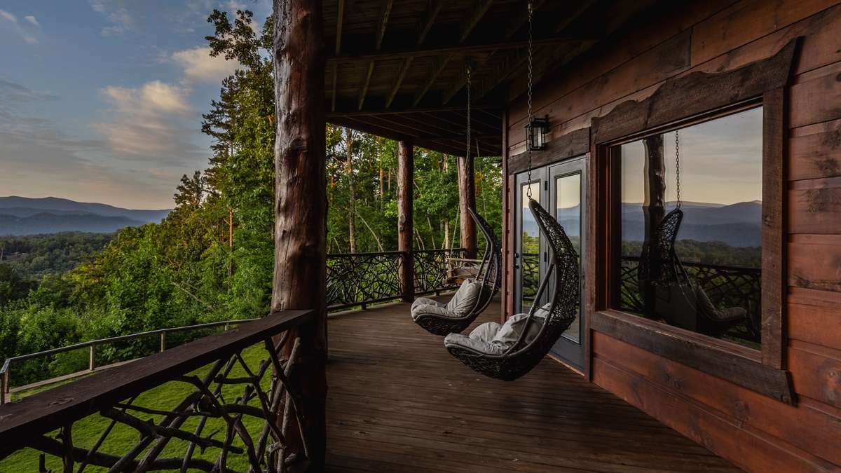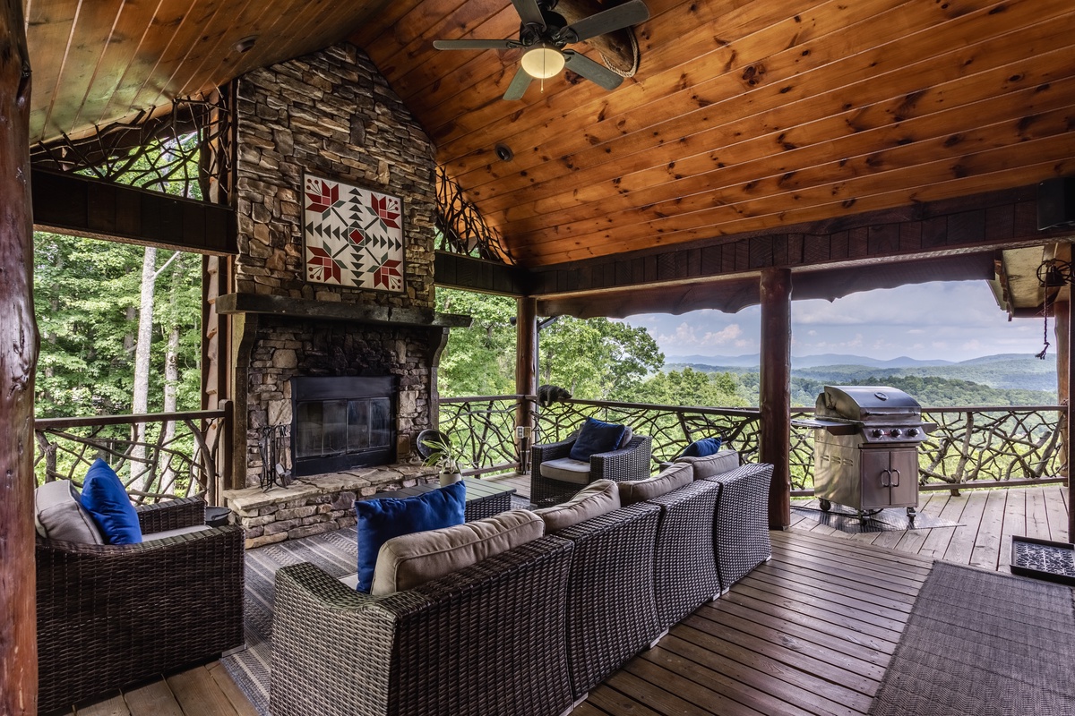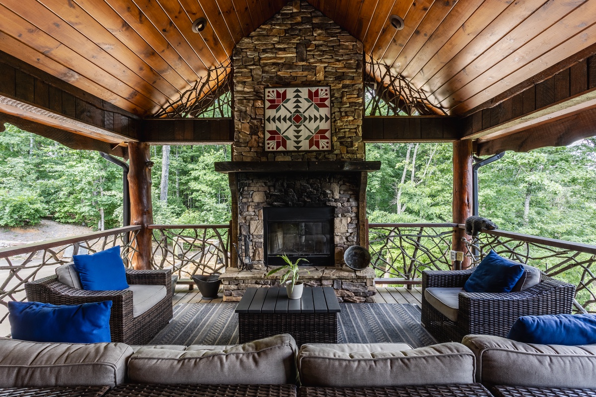 Step outside to the entry-level deck and be greeted by a covered wood-burning fireplace seating area, a gas grill, and four rocker chairs, ideal for enjoying the crisp mountain air. The lower-level deck offers a covered hot tub, two hanging egg basket chairs, a bed swing, and two additional rocker chairs, creating a haven for relaxation. The manicured grounds feature a flat grassy yard, a stone-laid fire pit, covered parking, and a paved driveway. Every detail of Lookout Lodge has been thoughtfully designed to provide an unforgettable mountain getaway, blending luxury and natural beauty in perfect harmony.