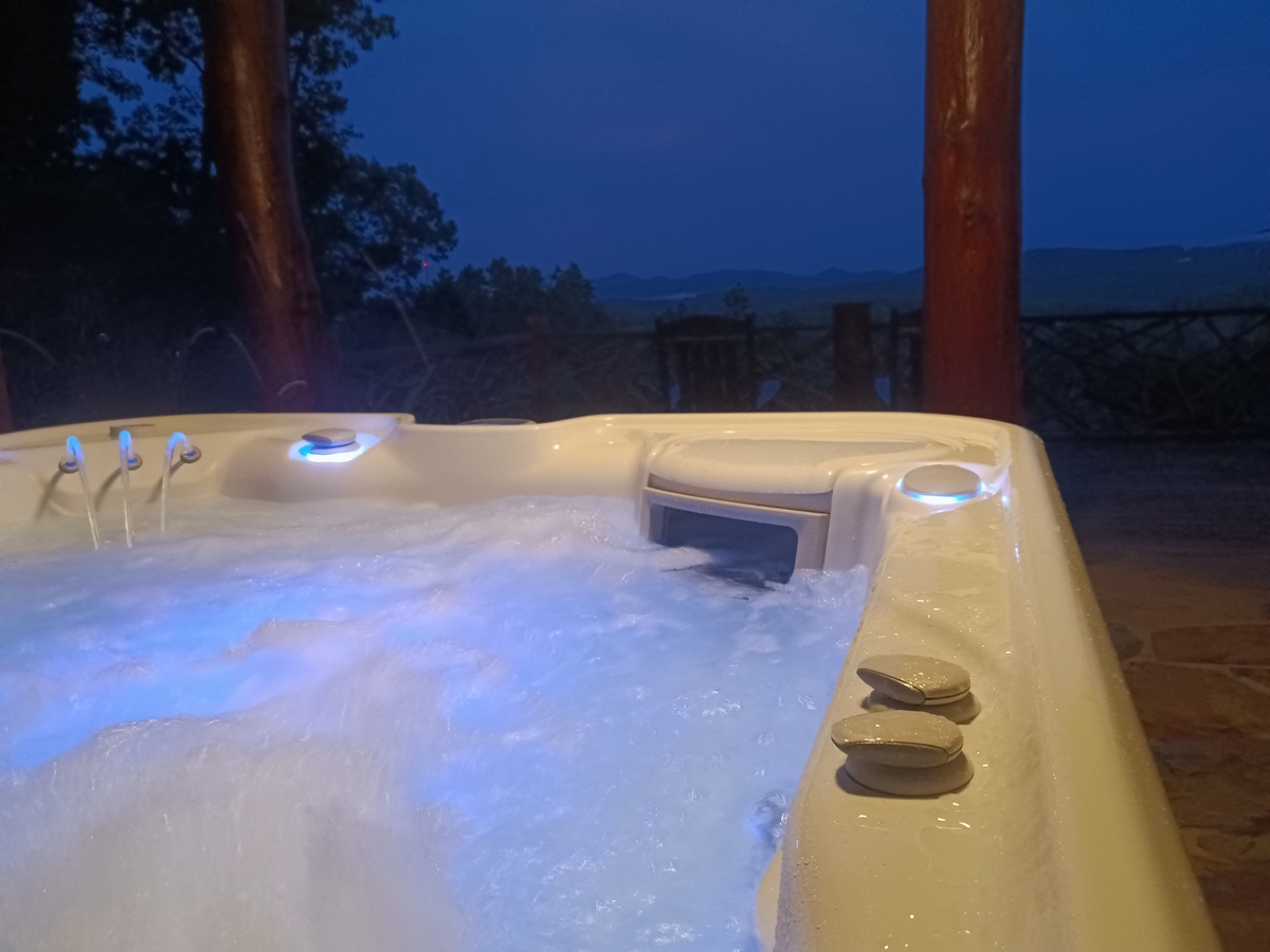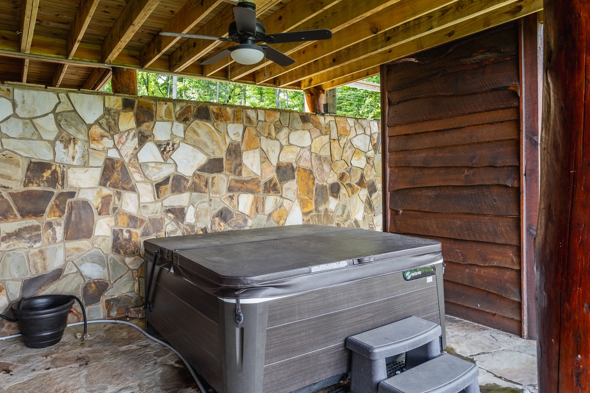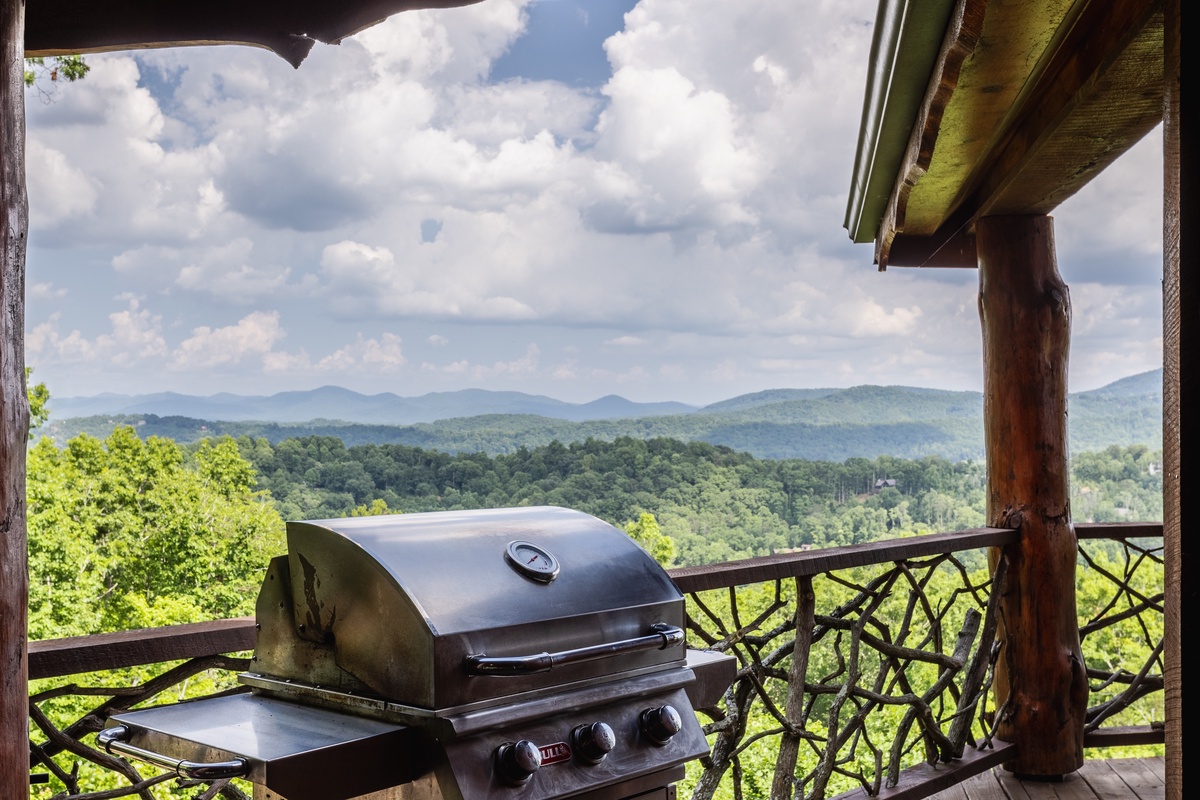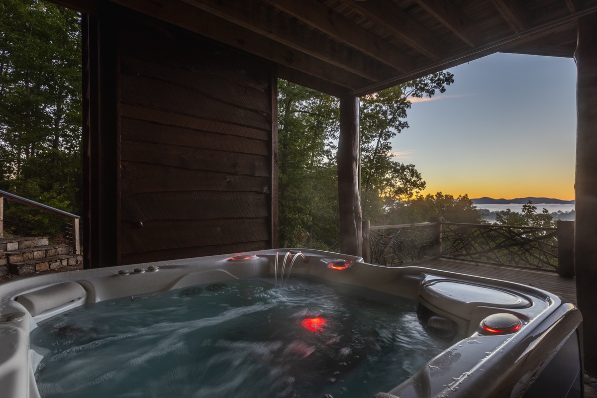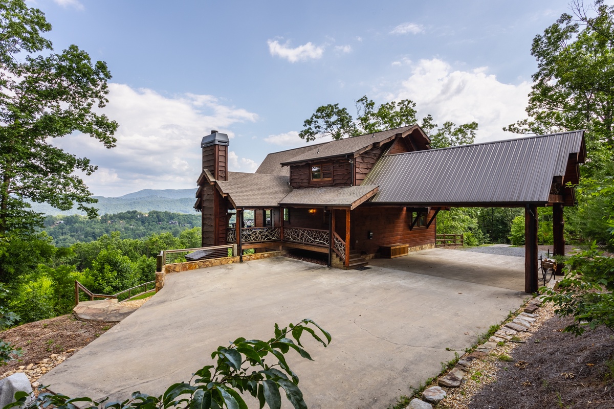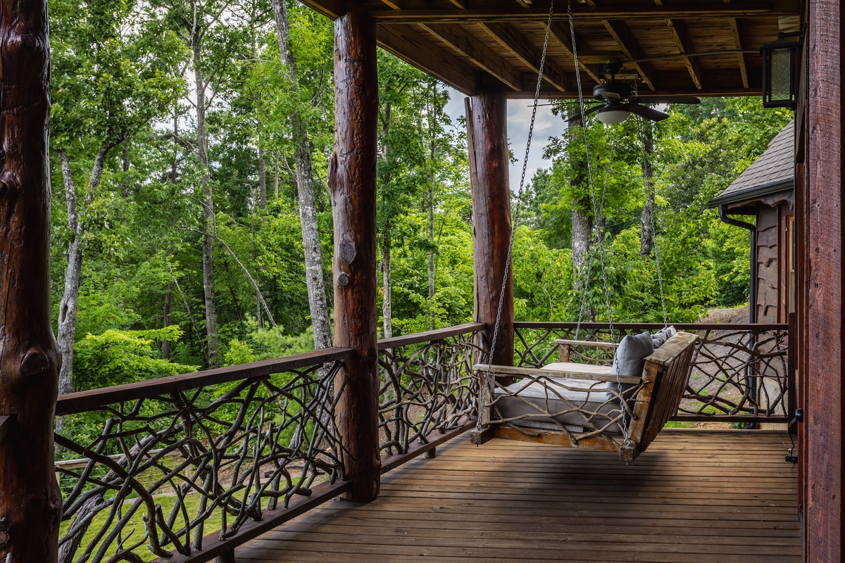 Step outside to the entry-level deck and be greeted by a covered wood-burning fireplace seating area, a gas grill, and four rocker chairs, ideal for enjoying the crisp mountain air. The lower-level deck offers a covered hot tub, two hanging egg basket chairs, a bed swing, and two additional rocker chairs, creating a haven for relaxation. The manicured grounds feature a flat grassy yard, a stone-laid fire pit, covered parking, and a paved driveway. Every detail of Lookout Lodge has been thoughtfully designed to provide an unforgettable mountain getaway, blending luxury and natural beauty in perfect harmony.