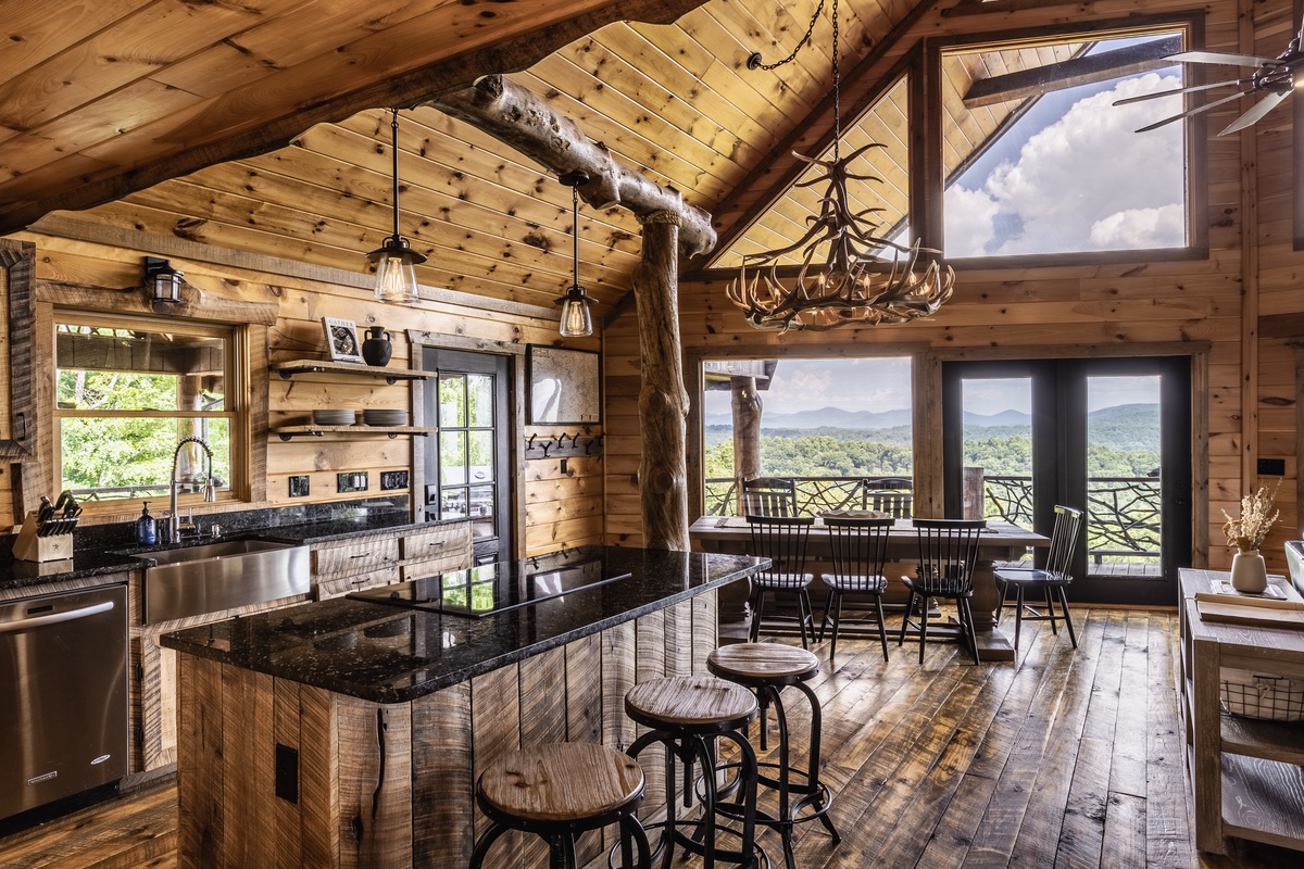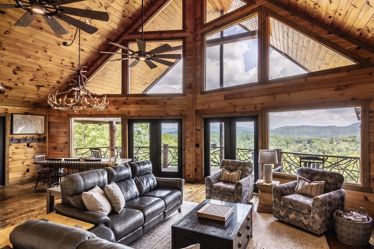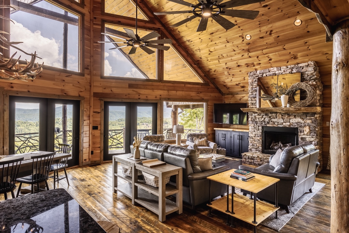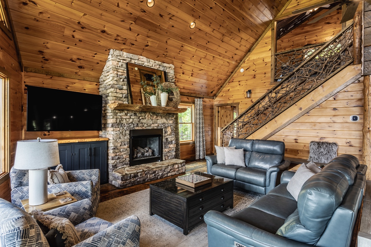 Welcome to Lookout Lodge, an exquisite mountain retreat in Blue Ridge, Georgia, where luxury meets rustic charm in a breathtaking setting. As you enter this magnificent cabin, the full kitchen with island seating and state-of-the-art appliances invites you to create culinary delights. The spacious living area boasts floor-to-ceiling windows that frame stunning mountain views, a cozy gas fireplace, and plush leather reclining couches, perfect for unwinding after a day of adventure. The elegant dining table for eight ensures that family and friends can gather for memorable meals, while a half bath adds convenience. The king bedroom suite on this level offers a private sanctuary with a 55” TV, dresser, closet, and a lavish bathroom featuring a tile shower and double sinks.