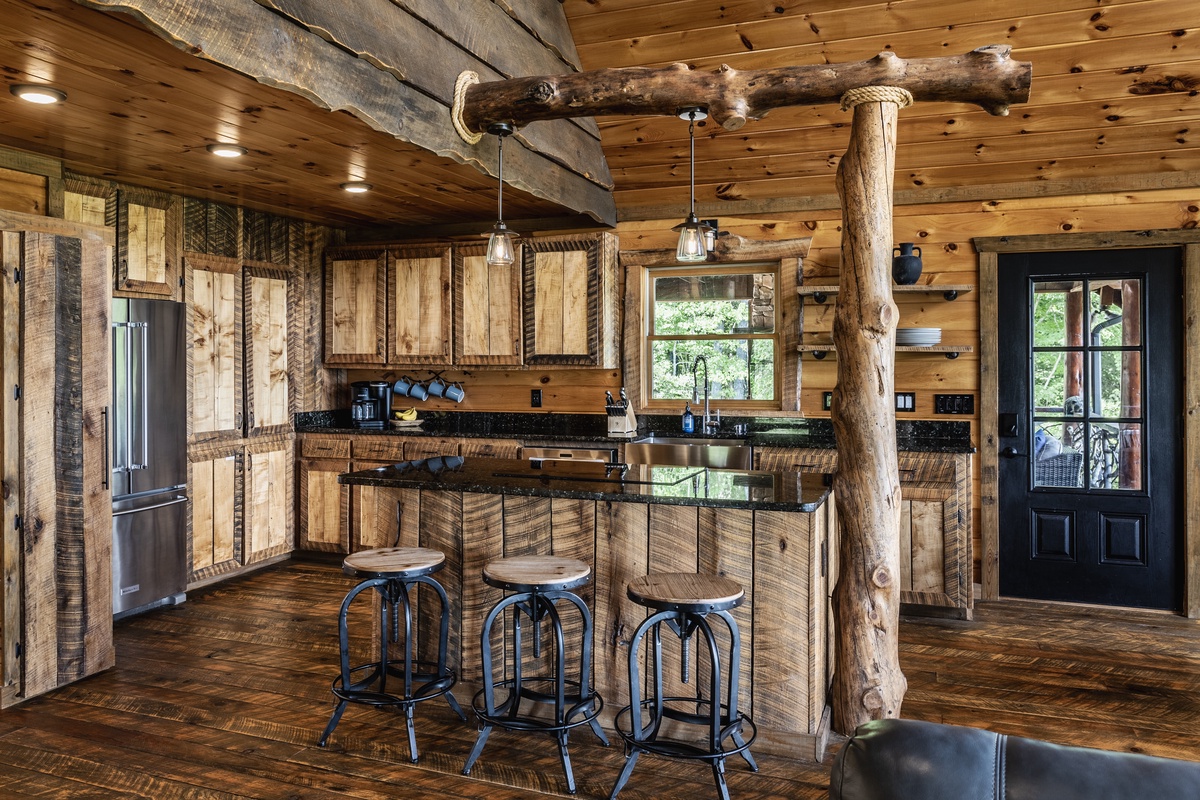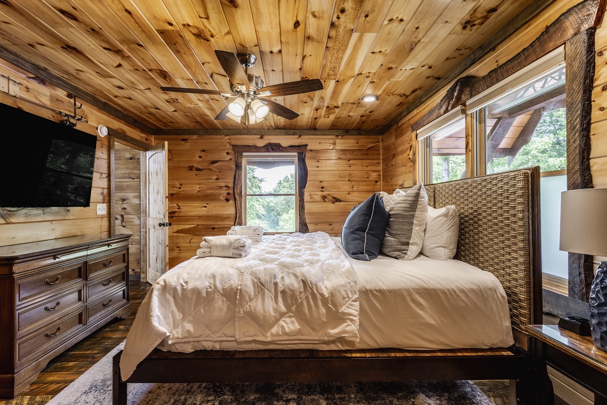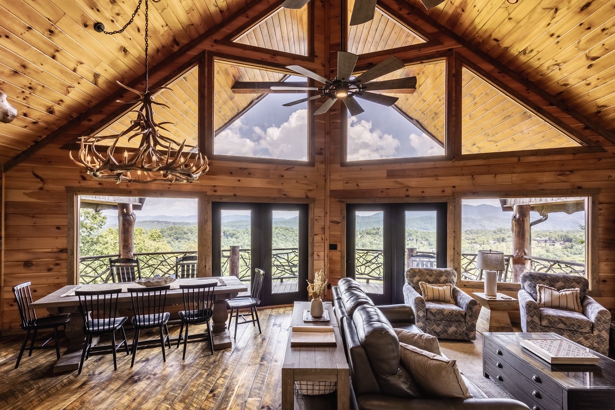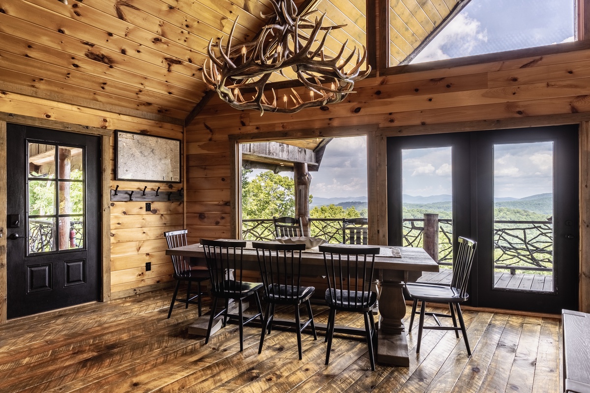 Welcome to Lookout Lodge, an exquisite mountain retreat in Blue Ridge, Georgia, where luxury meets rustic charm in a breathtaking setting. As you enter this magnificent cabin, the full kitchen with island seating and state-of-the-art appliances invites you to create culinary delights. The spacious living area boasts floor-to-ceiling windows that frame stunning mountain views, a cozy gas fireplace, and plush leather reclining couches, perfect for unwinding after a day of adventure. The elegant dining table for eight ensures that family and friends can gather for memorable meals, while a half bath adds convenience. The king bedroom suite on this level offers a private sanctuary with a 55” TV, dresser, closet, and a lavish bathroom featuring a tile shower and double sinks.