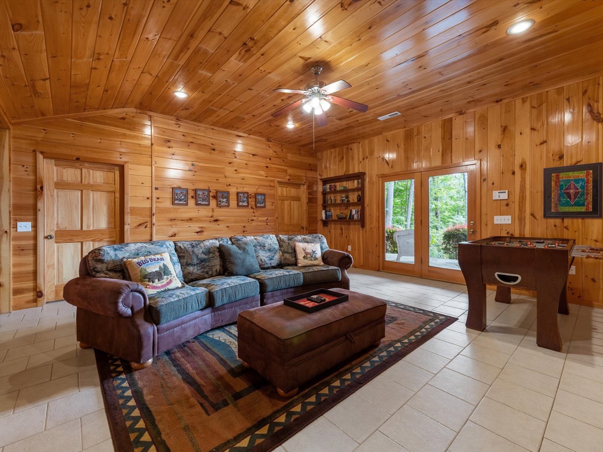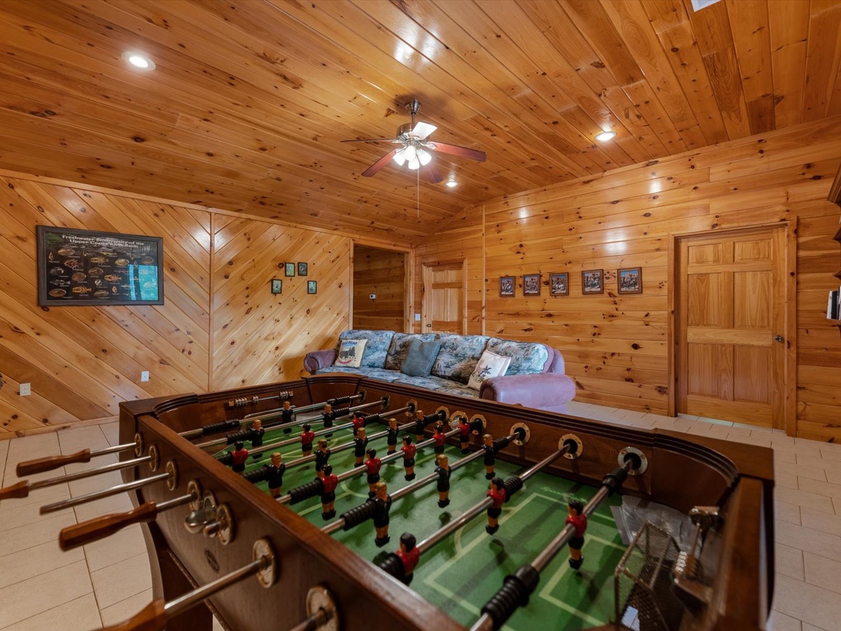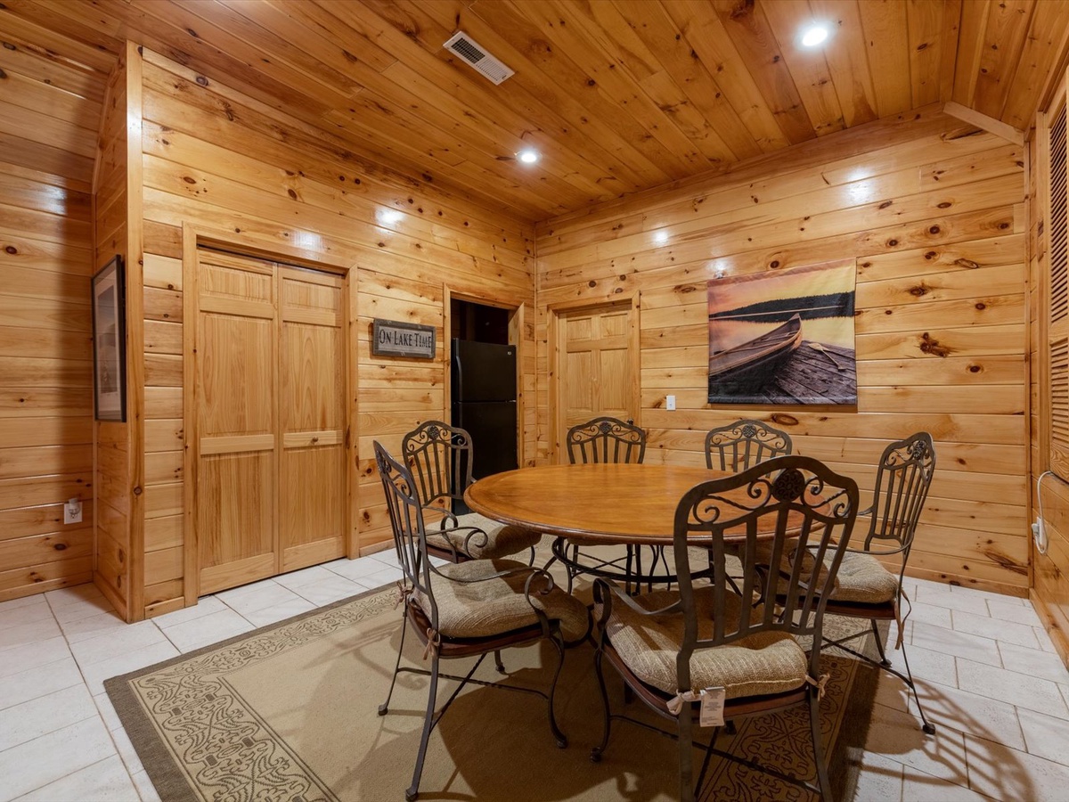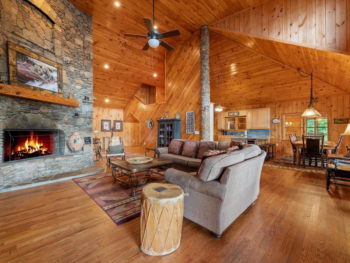 Prepare to be thrilled as you step into this captivating vacation home, where the vast living room welcomes you with the exhilarating crackle of an extra-large wood-burning fireplace, luring you to cuddle up with your loved ones on those brisk evenings. For the musically inclined, a stand-up piano eagerly awaits to ignite your creativity, while whimsical accents like a cowboy saddle and a canoe hanging on the walls amplify the excitement of the atmosphere.