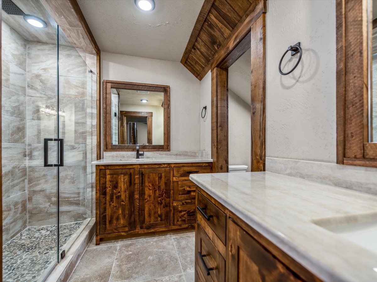 - Shared bathroom with shower and double vanity.