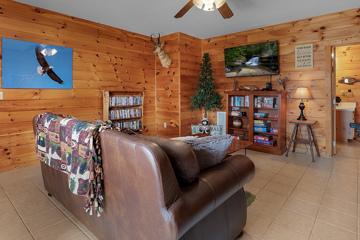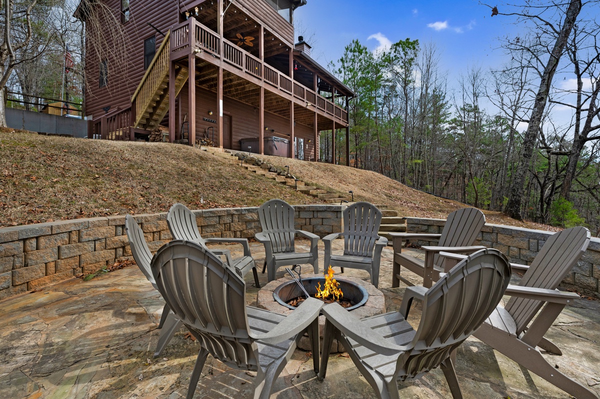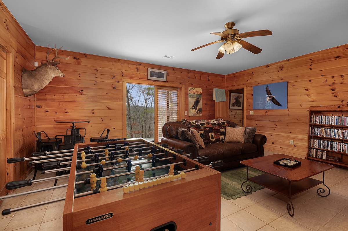Downstairs, the game room offers endless fun with a foosball table, board games, a 50" TV, and a large DVD collection. Step outside and experience the terrace level, soak in the private hot tub or gather around the flagstone firepit for stargazing and storytelling.