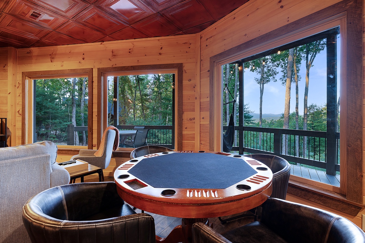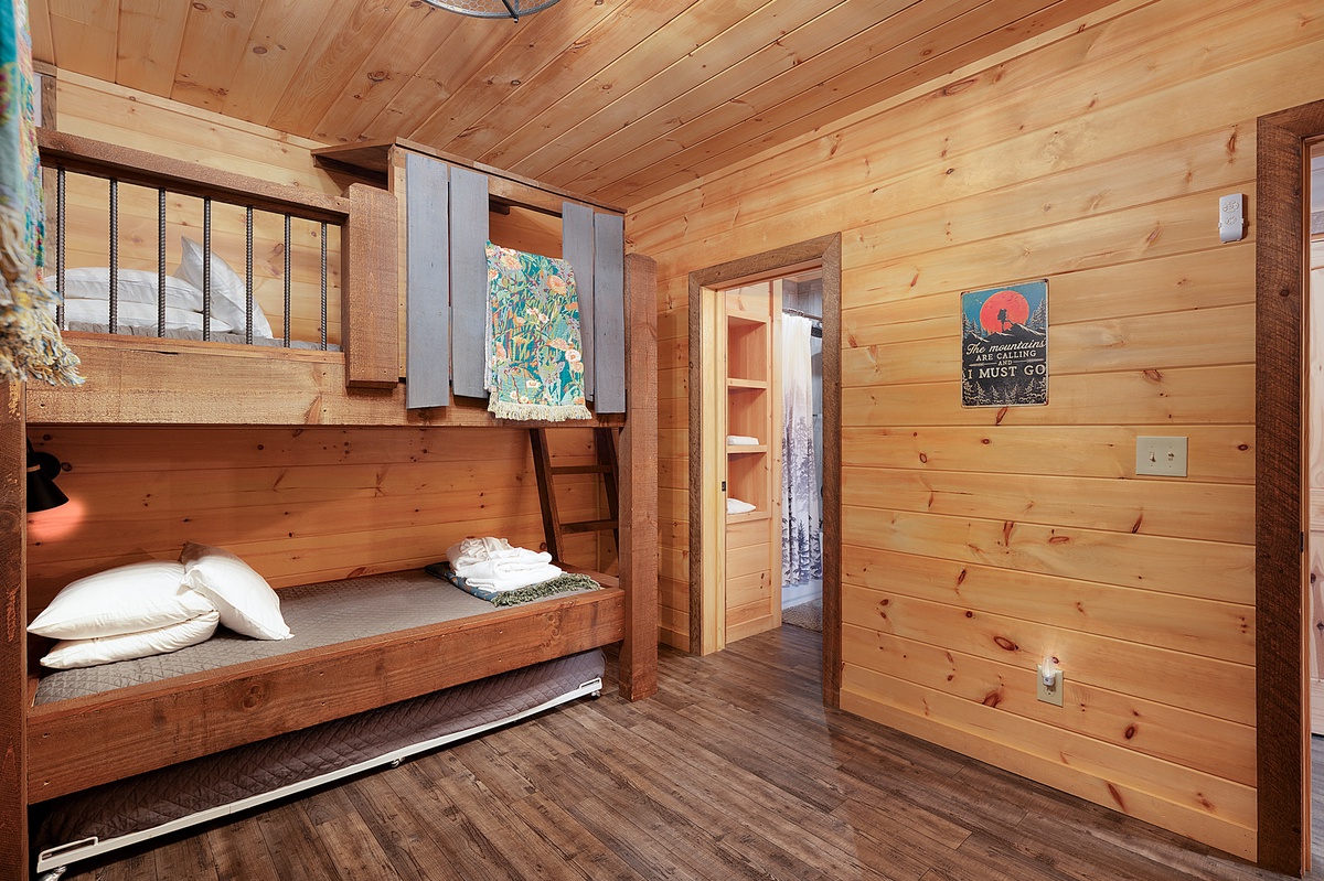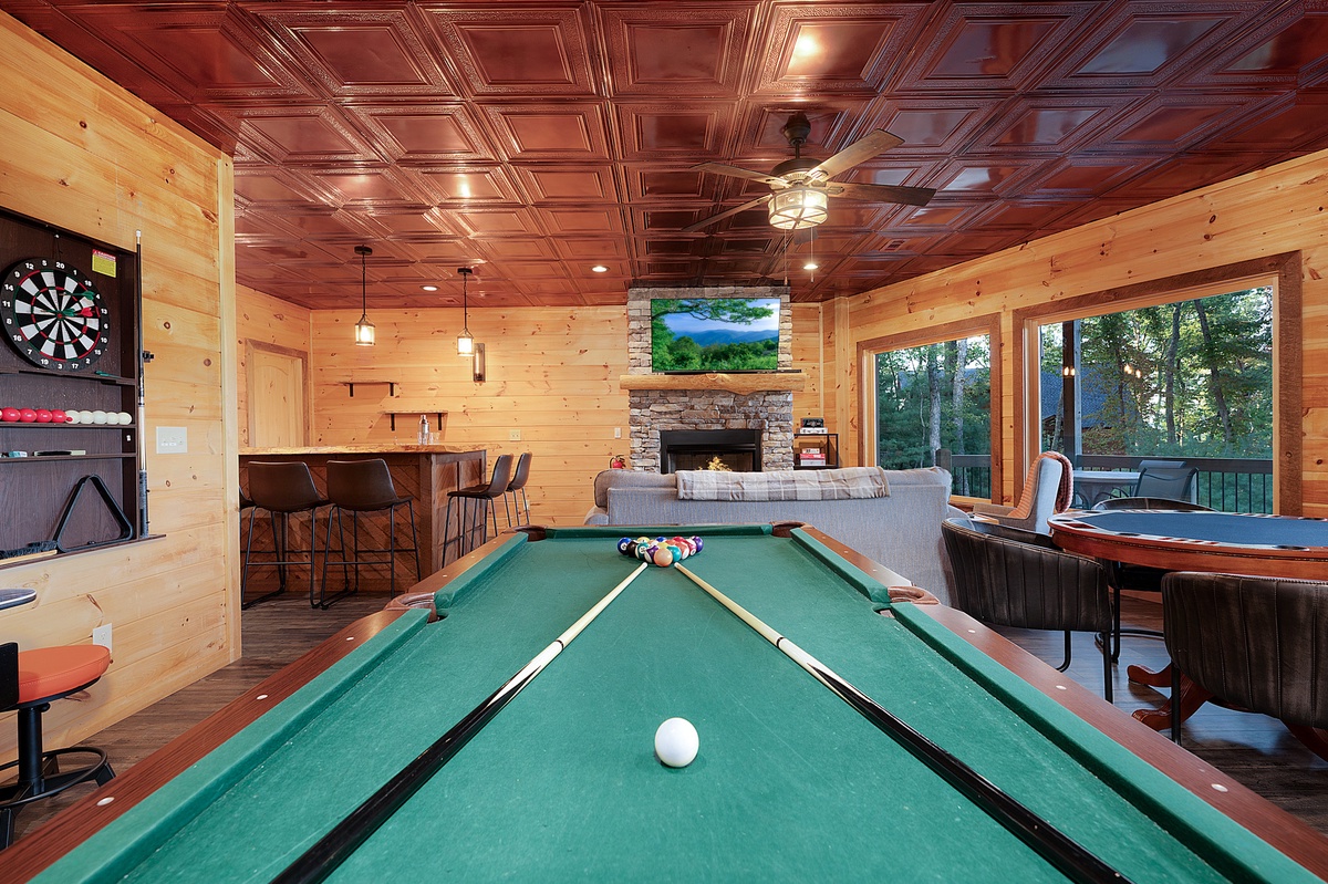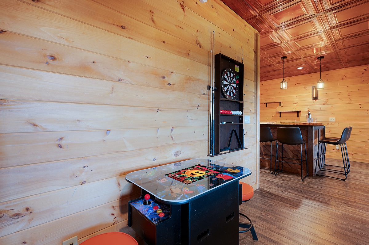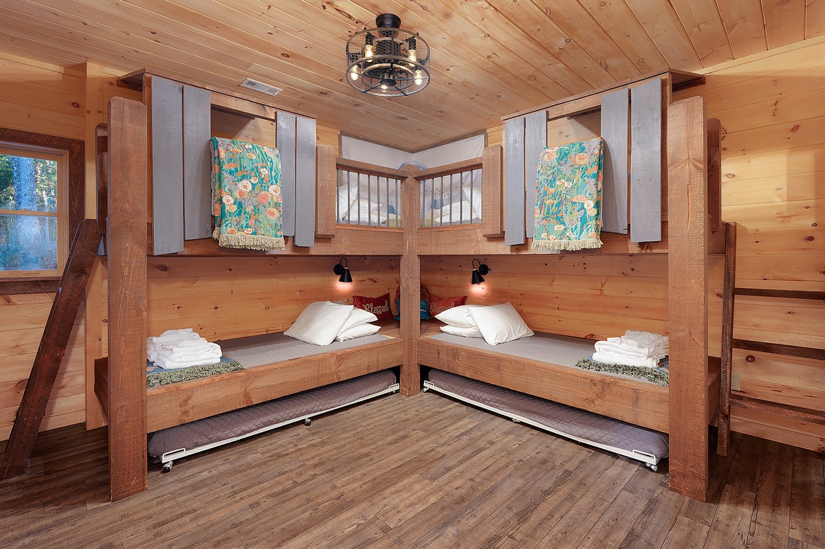 Retreat to the primary king suite on the entry level, where deck access, a soaking tub, and a walk-in shower create your own spa-like sanctuary. Upstairs, two additional king suites shares a Jack-and-Jill bath, offer cozy retreats, while the loft adds an extra workspace for those who need it. Downstairs, the fun begins in the game room, outfitted with a pool table, arcade game, poker table, and a wet bar for evenings that stretch into the night. The twin bunkroom, complete with custom built-ins and trundles, is a kids’ dream hideout.