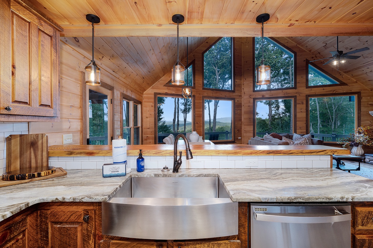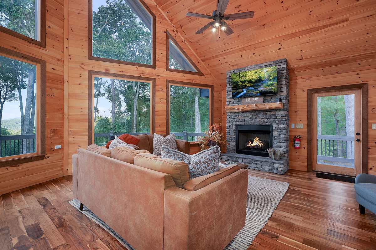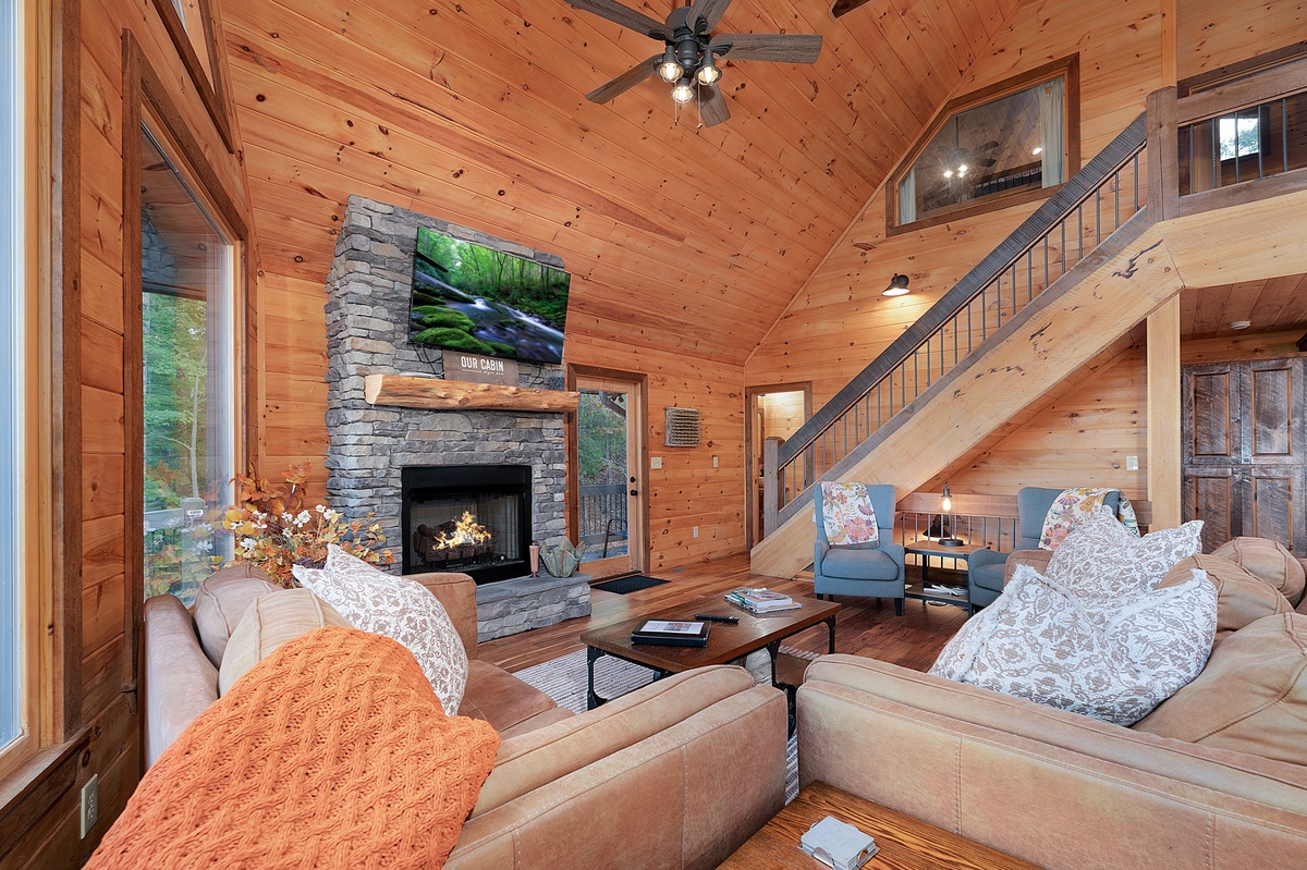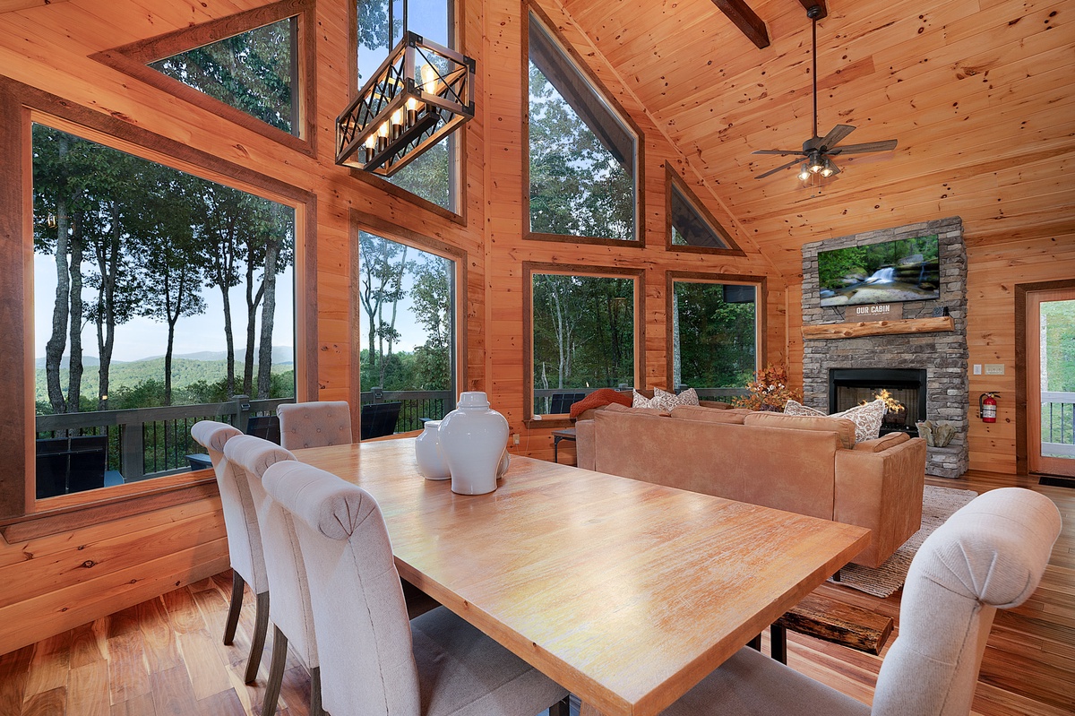 Step inside and be greeted by soaring ceilings and a wall of windows framing rolling mountain views. The main level invites you to gather in the open concept living area, complete with a stone fireplace, plush seating, and seamless access to the expansive deck. The fully equipped kitchen features rustic cabinetry, stainless appliances, and a breakfast bar, while the adjoining dining area seats ten comfortably, perfect for lingering meals and laughter.