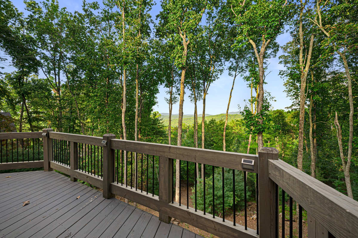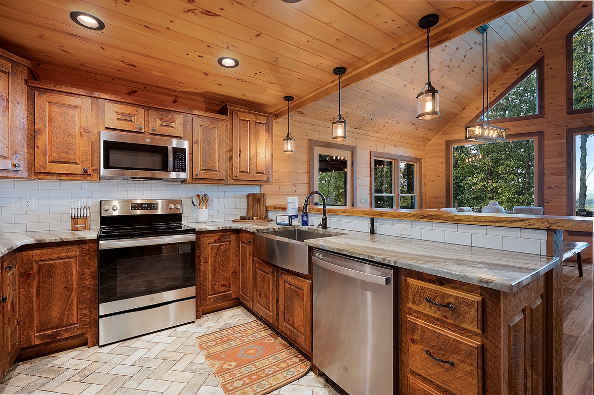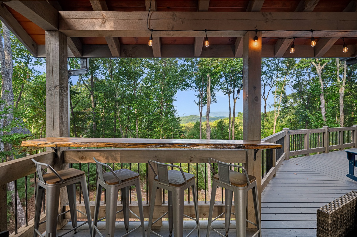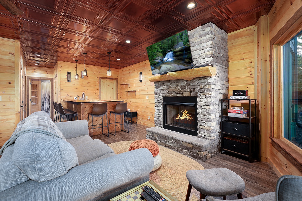 Step inside and be greeted by soaring ceilings and a wall of windows framing rolling mountain views. The main level invites you to gather in the open concept living area, complete with a stone fireplace, plush seating, and seamless access to the expansive deck. The fully equipped kitchen features rustic cabinetry, stainless appliances, and a breakfast bar, while the adjoining dining area seats ten comfortably, perfect for lingering meals and laughter.