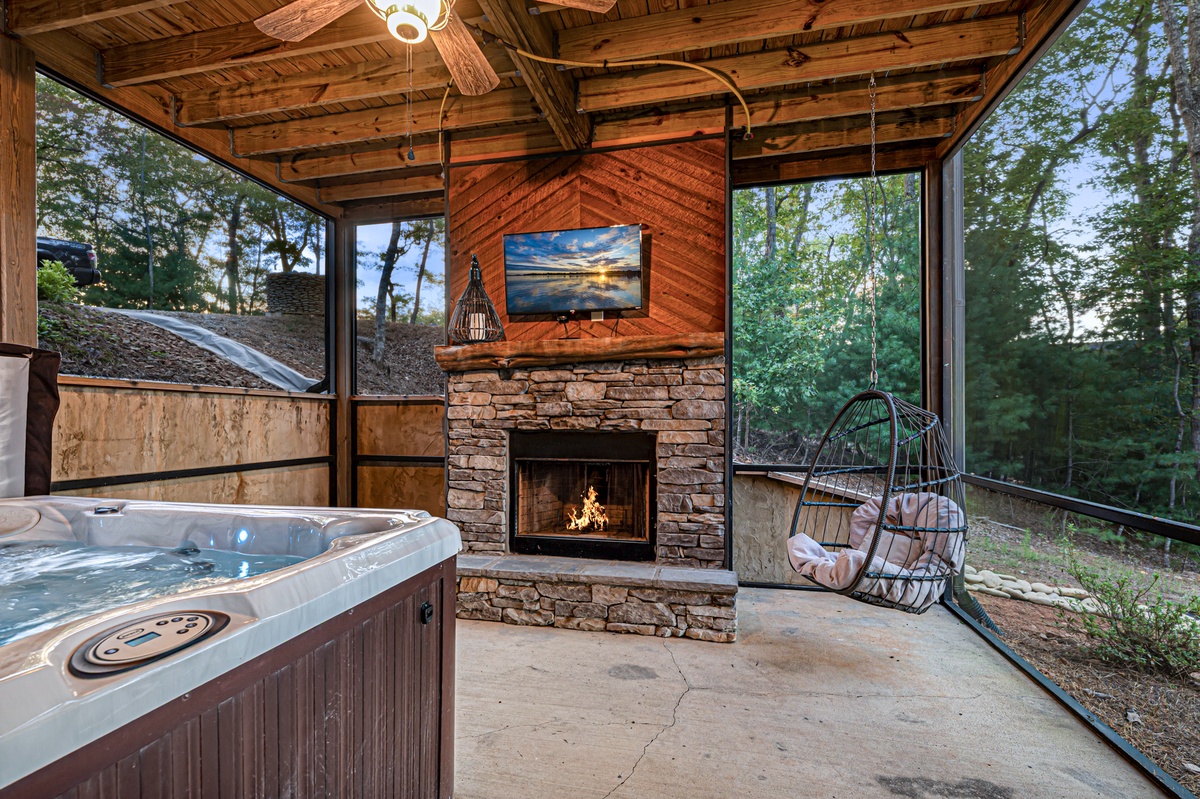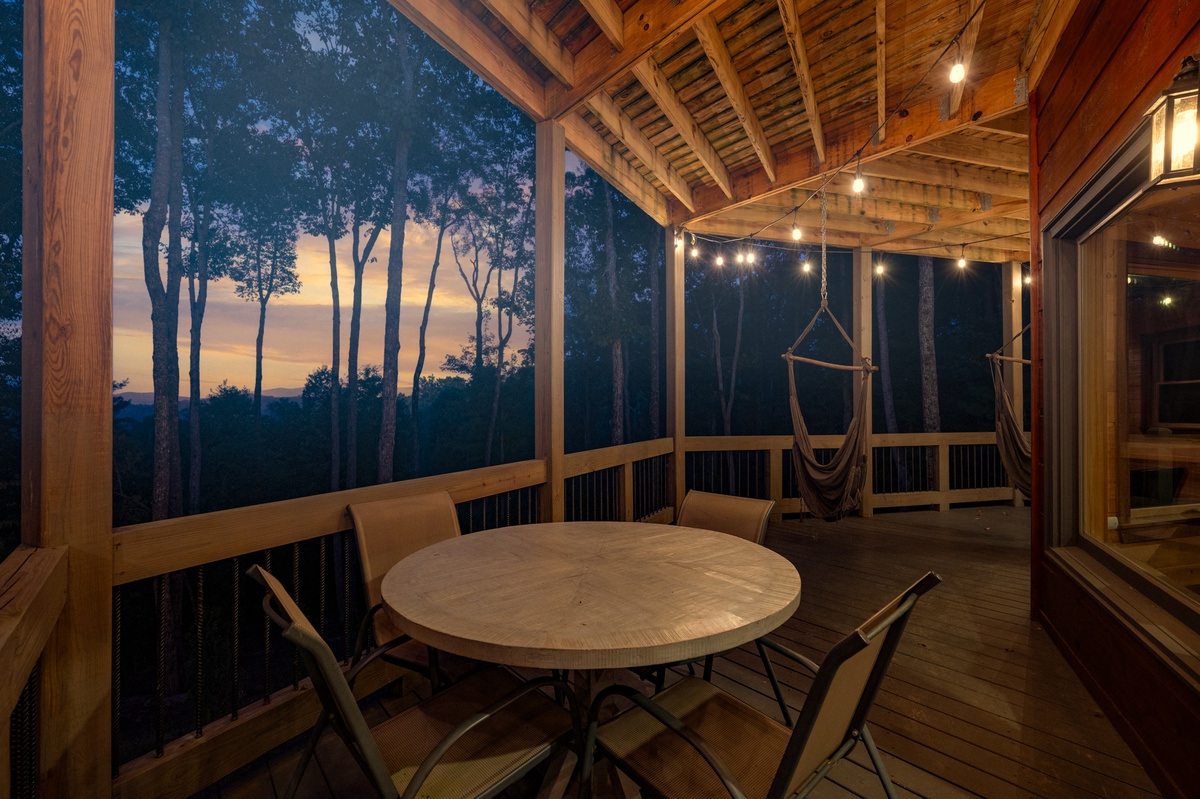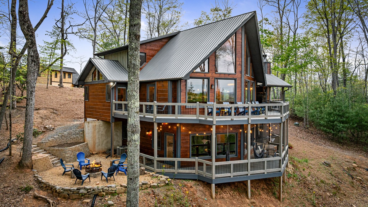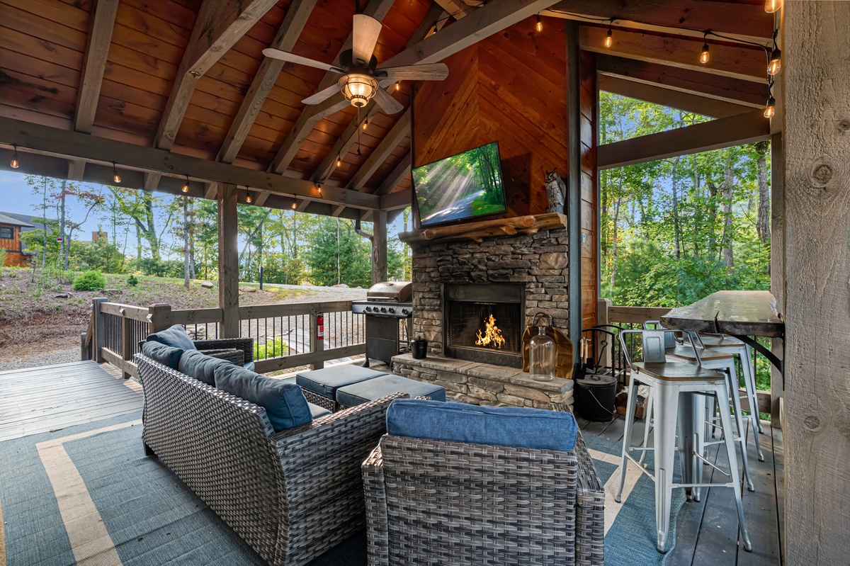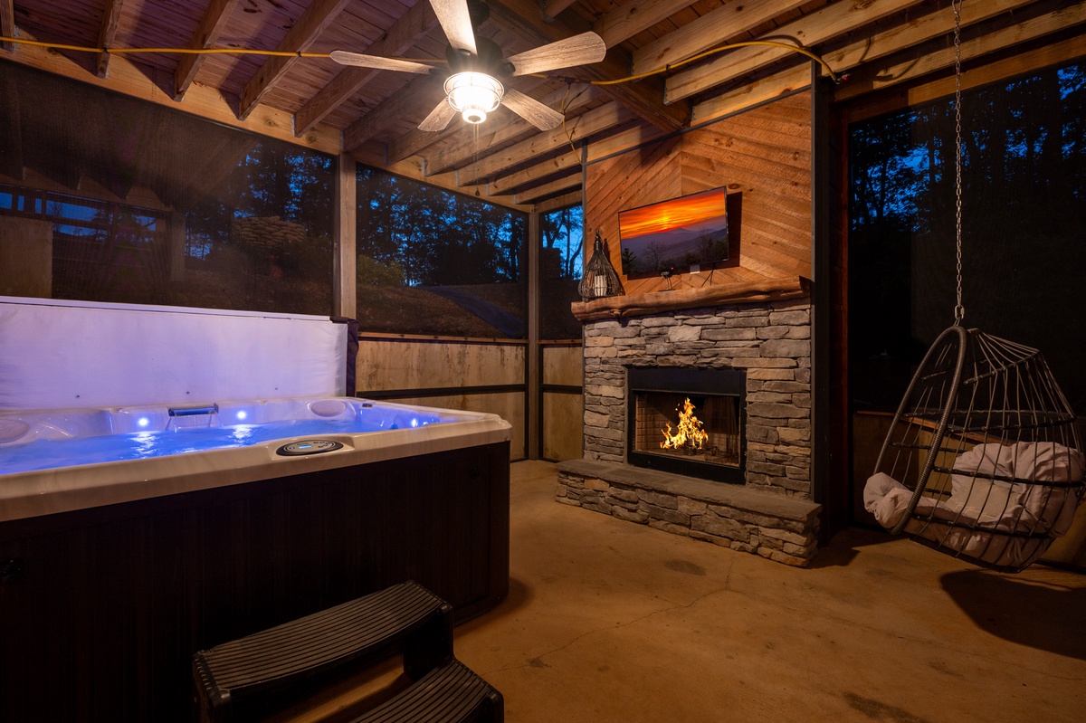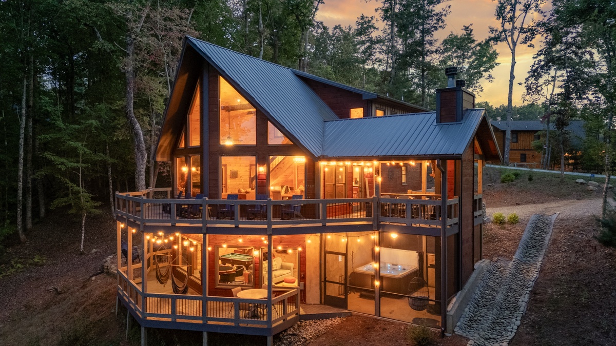 Morning Glory shines outdoors with spaces designed to soak in the scenery. Sip coffee by the outdoor fireplace on the covered deck, unwind in the hot tub with a view, or swing lazily in a hammock. Evenings are best spent gathered around the firepit under the stars, sharing stories and s’mores.