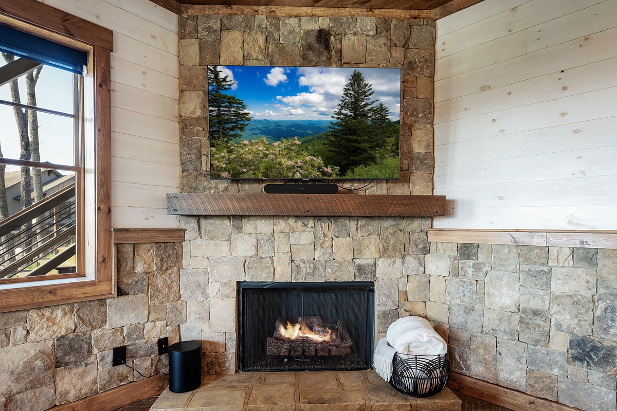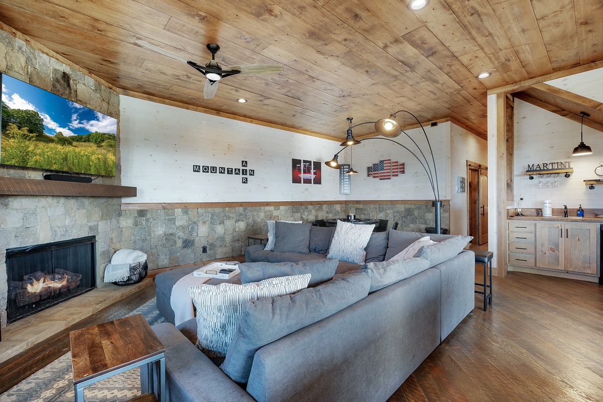 - Wood burning fireplace, 55” TV, sofa seating 5-7 and 2 chairs