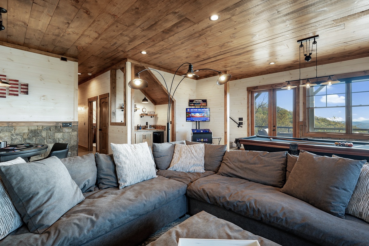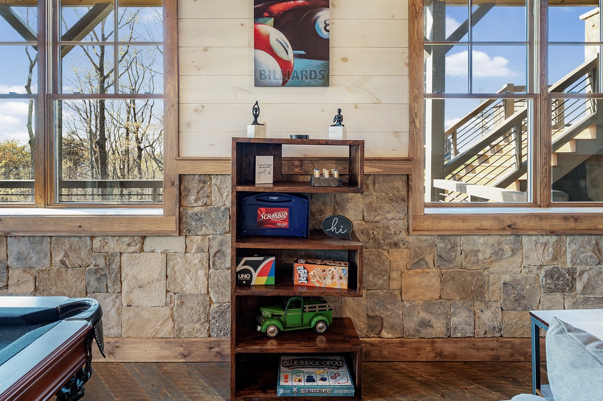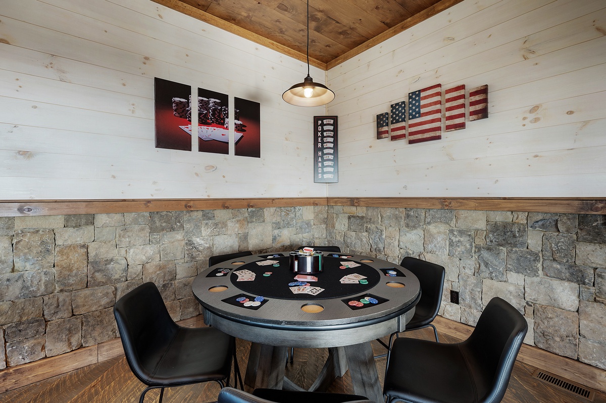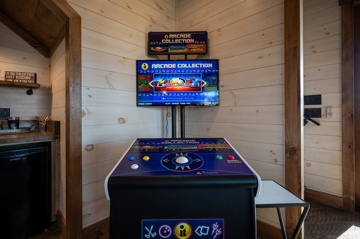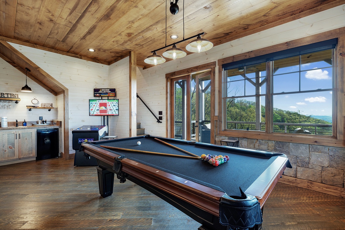 Day or night, when the gaming bug bites, you’ll find the antidote in the lower-level entertainment area with its pool table, arcade, board games and card table set for those high rollers. Those not bitten can join the fun atmosphere sitting on the large sectional watching their favorite show while enjoying the gas fireplace.