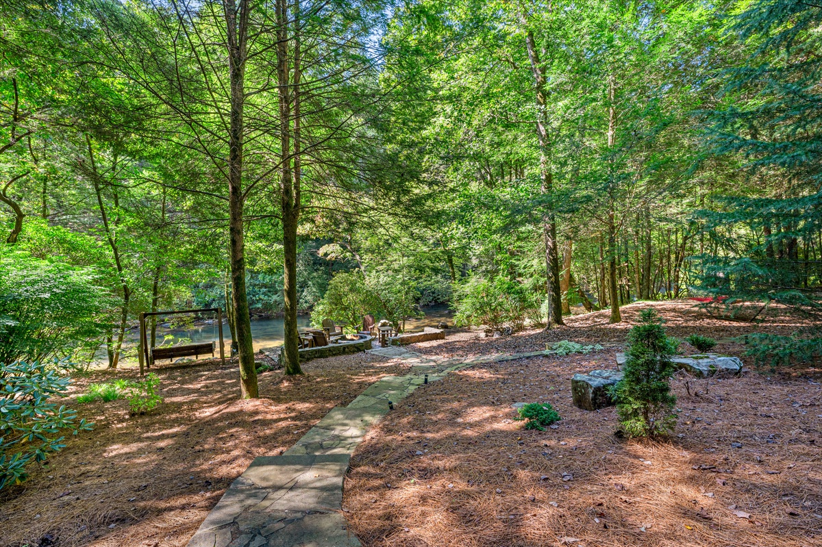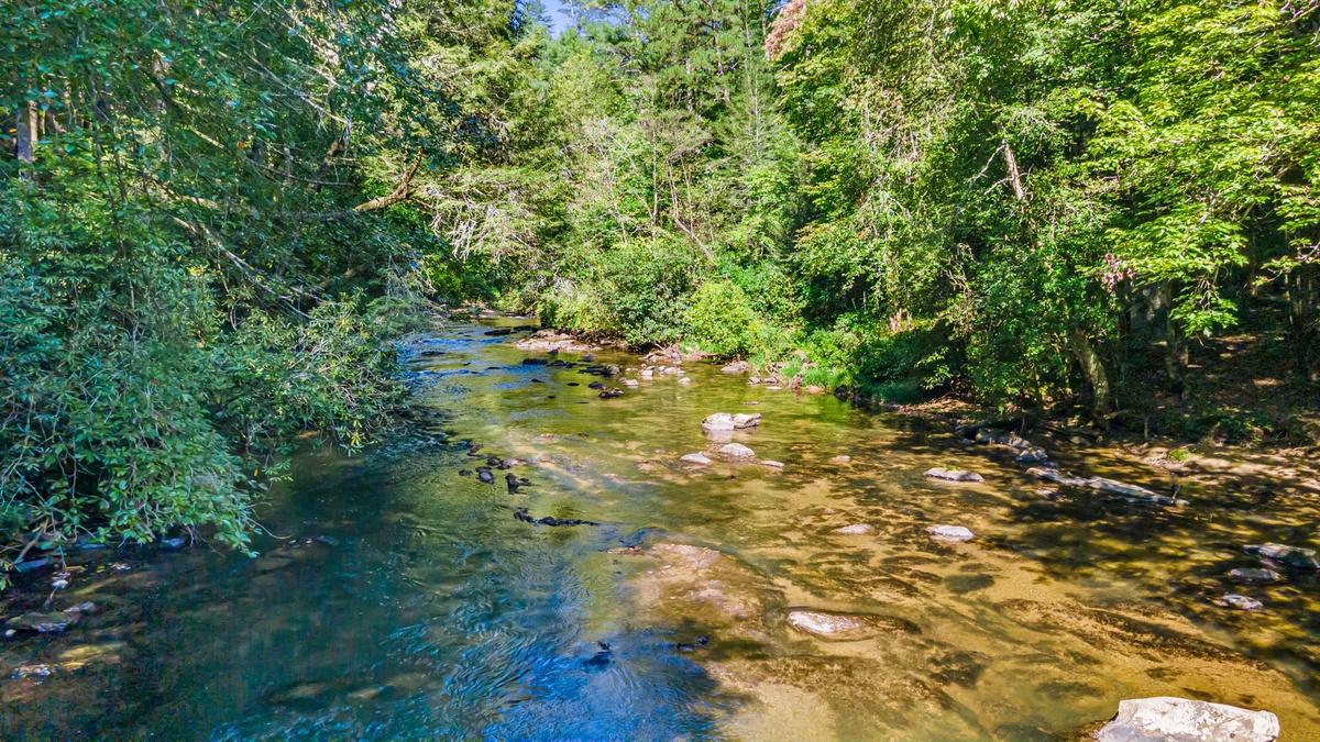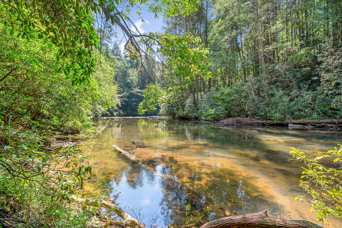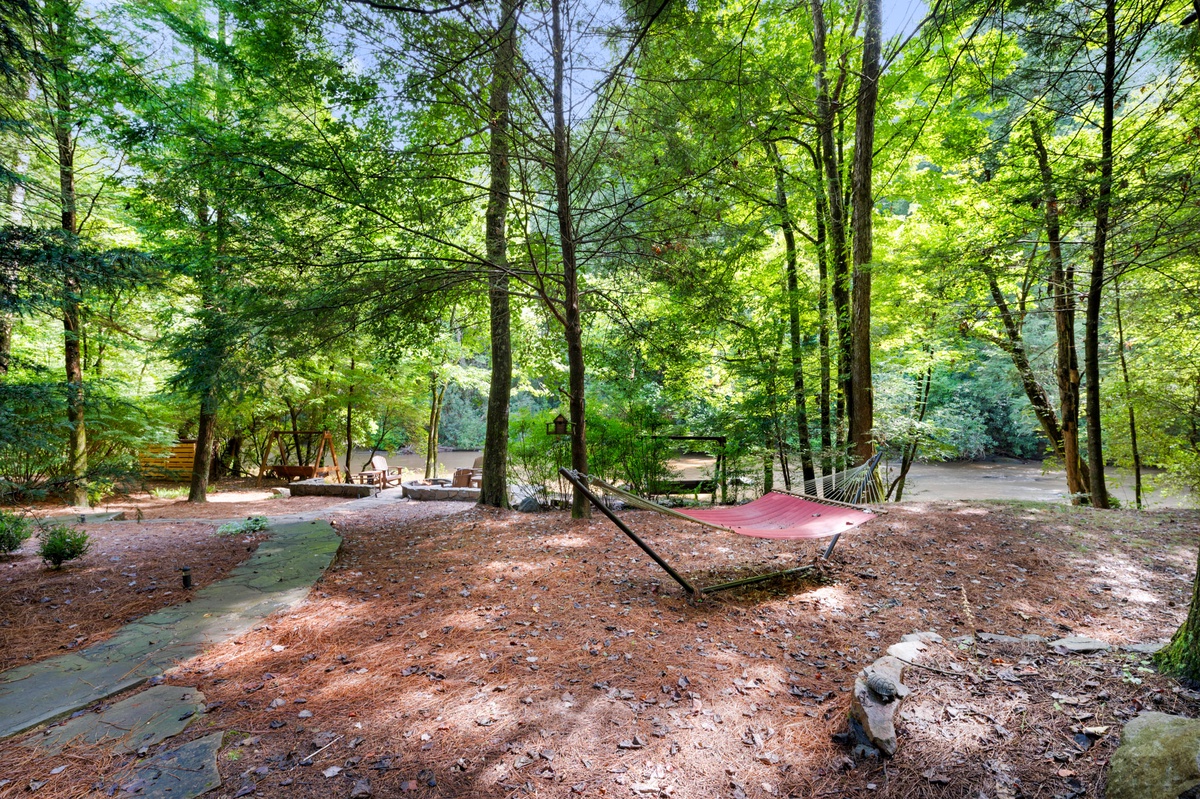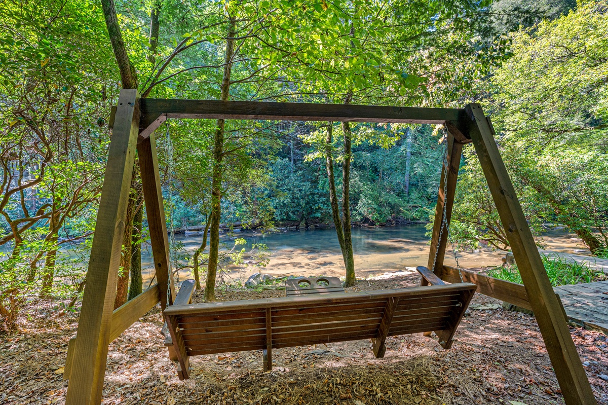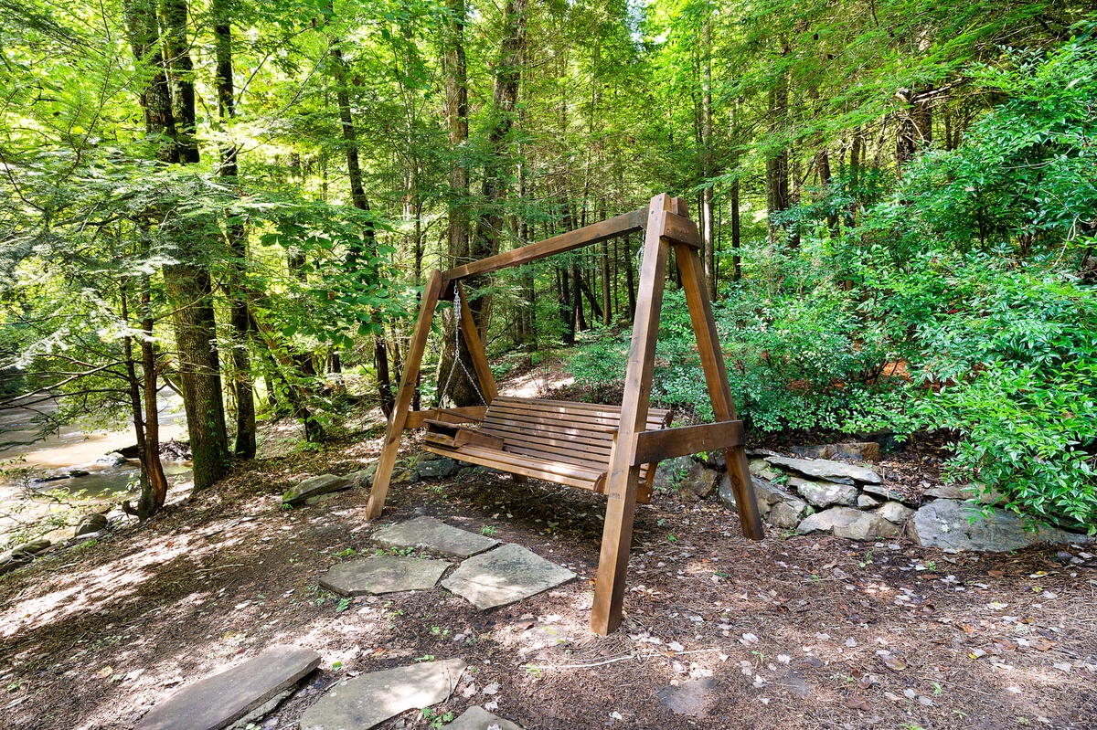 Stroll the grounds and discover moments of tranquility. A hammock sways gently, beckoning you to surrender to lazy afternoons. Two freestanding swings by the rushing Mountaintown Creek offer a slice of paradise for daydreaming. Follow the stone pathway to the water's edge, where you can dip your toes or simply watch the world flow by.