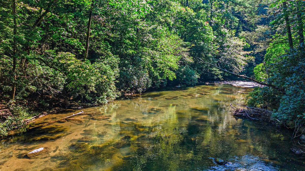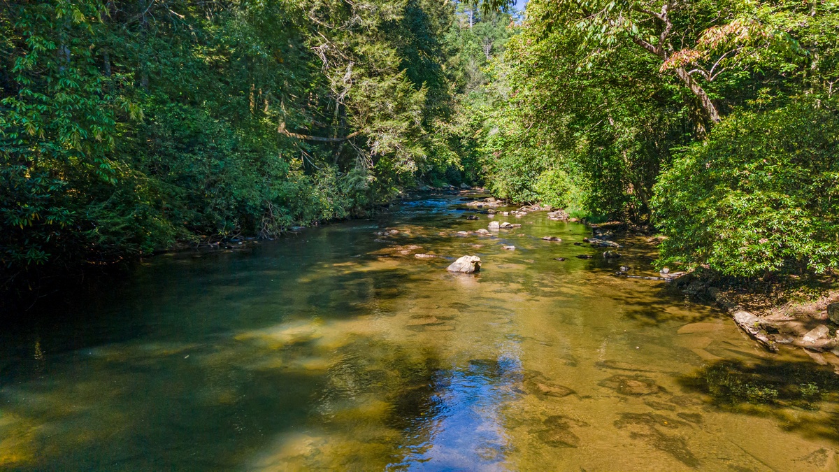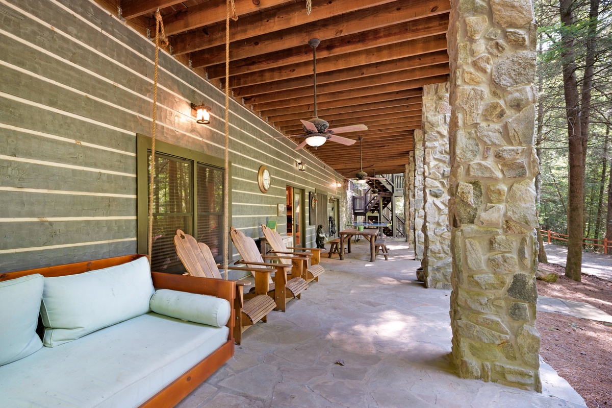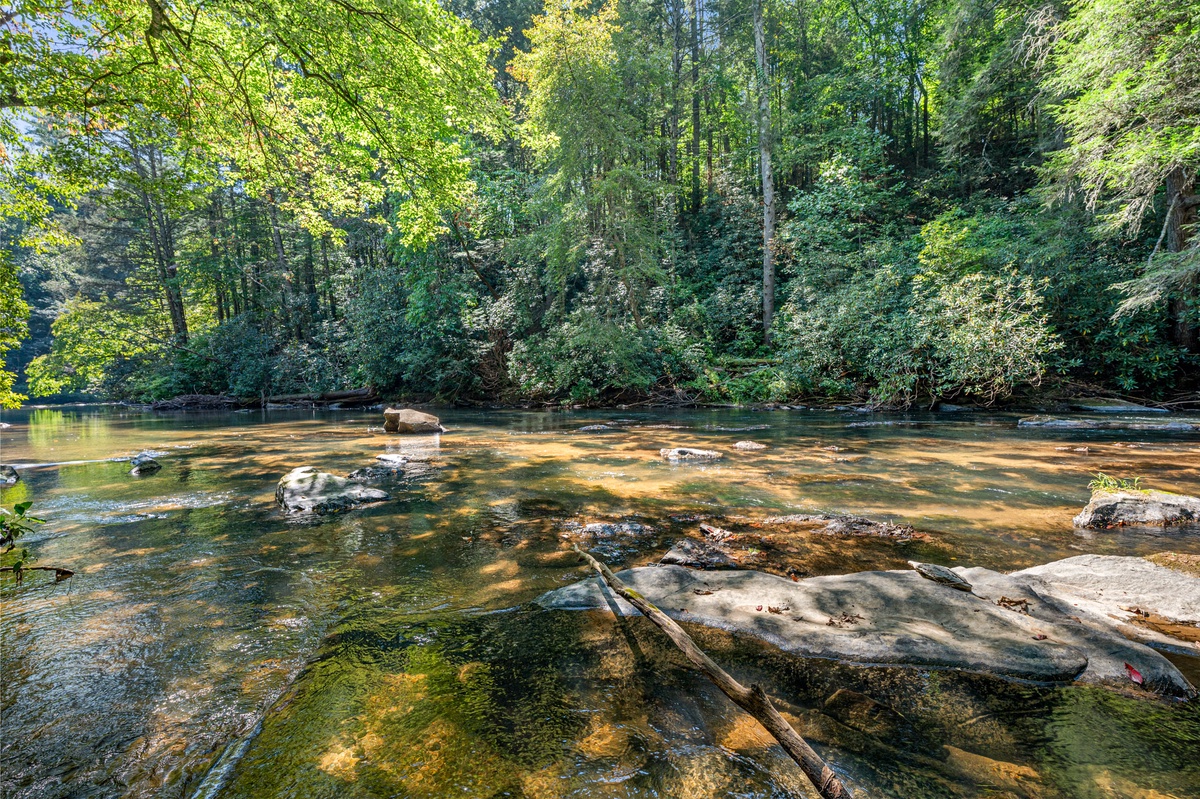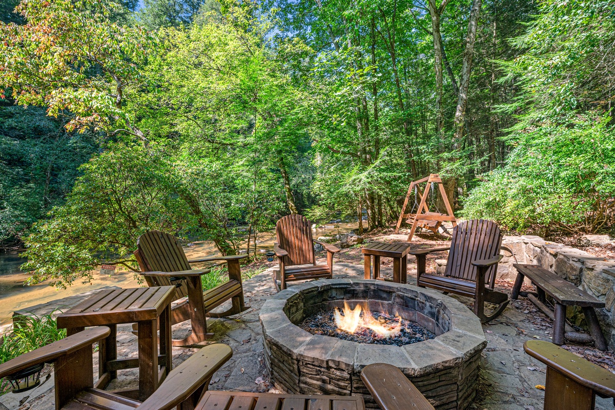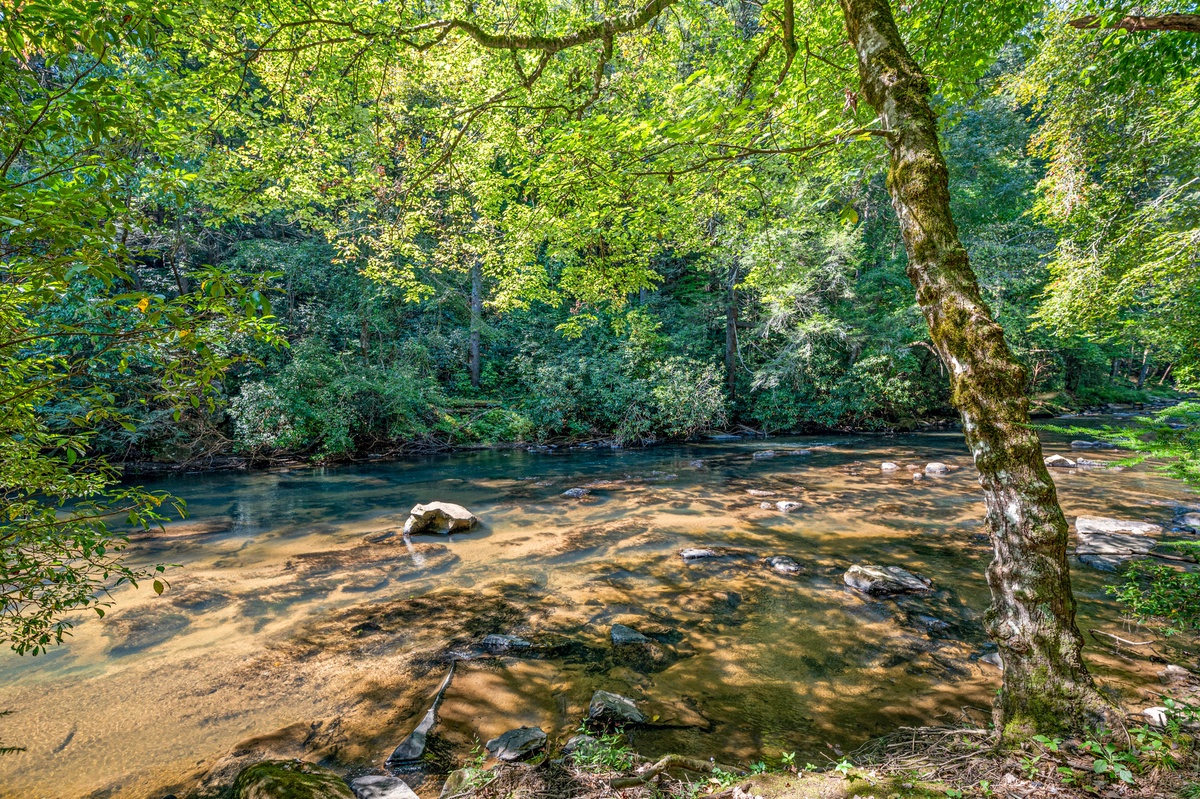 Stroll the grounds and discover moments of tranquility. A hammock sways gently, beckoning you to surrender to lazy afternoons. Two freestanding swings by the rushing Mountaintown Creek offer a slice of paradise for daydreaming. Follow the stone pathway to the water's edge, where you can dip your toes or simply watch the world flow by.