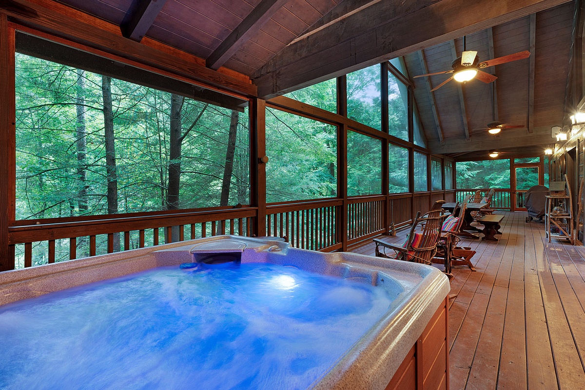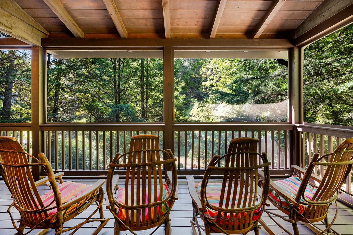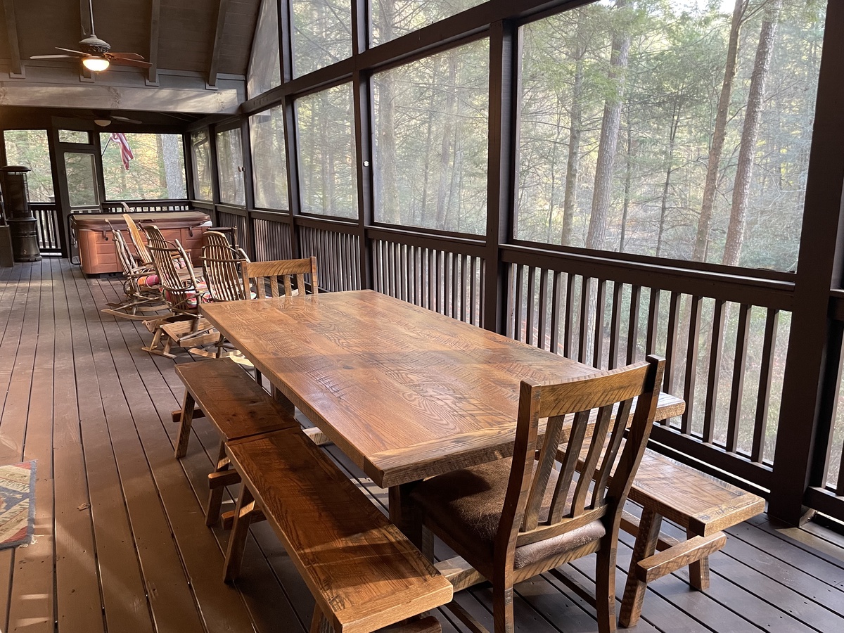 But the true magic awaits outdoors. Step onto the screened deck, your shield against pesky bugs, and be captivated by the melody of nature. With ample seating and a charming picnic table, this is the ideal spot to savor afternoon and evening meals while the melodious music of the creek serenades you. And don't forget the hot tub – your personal harbor of pleasure after a long day of joyful exploration.