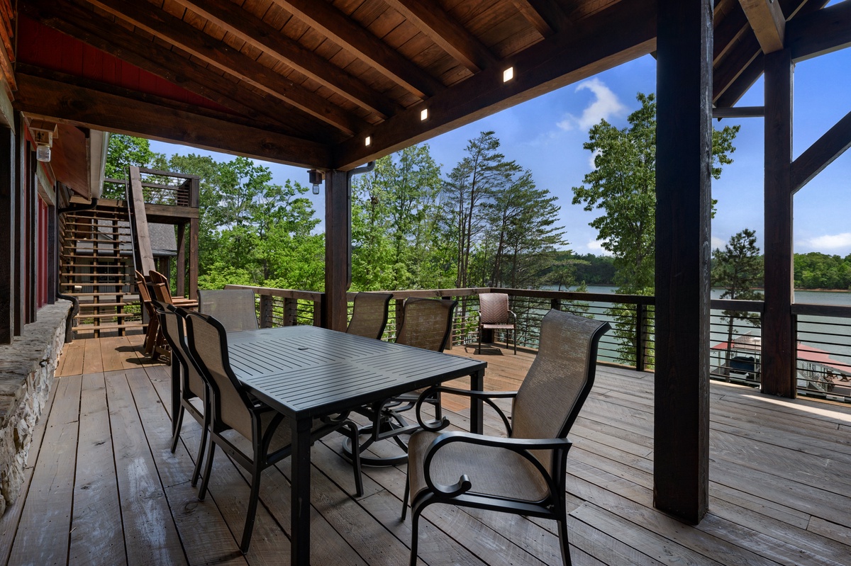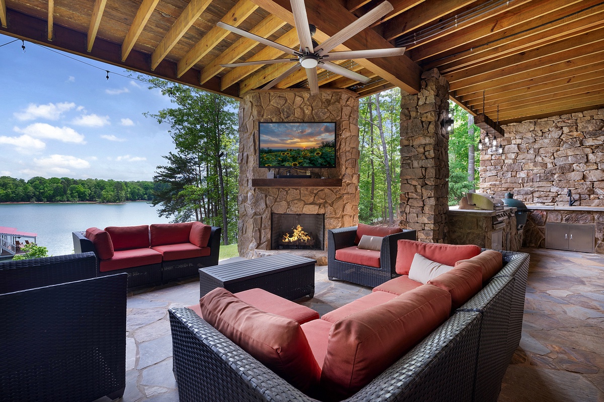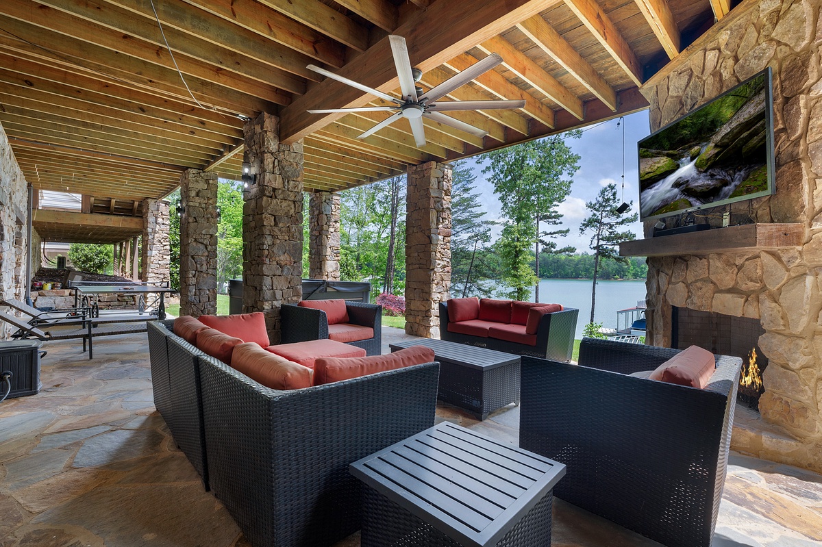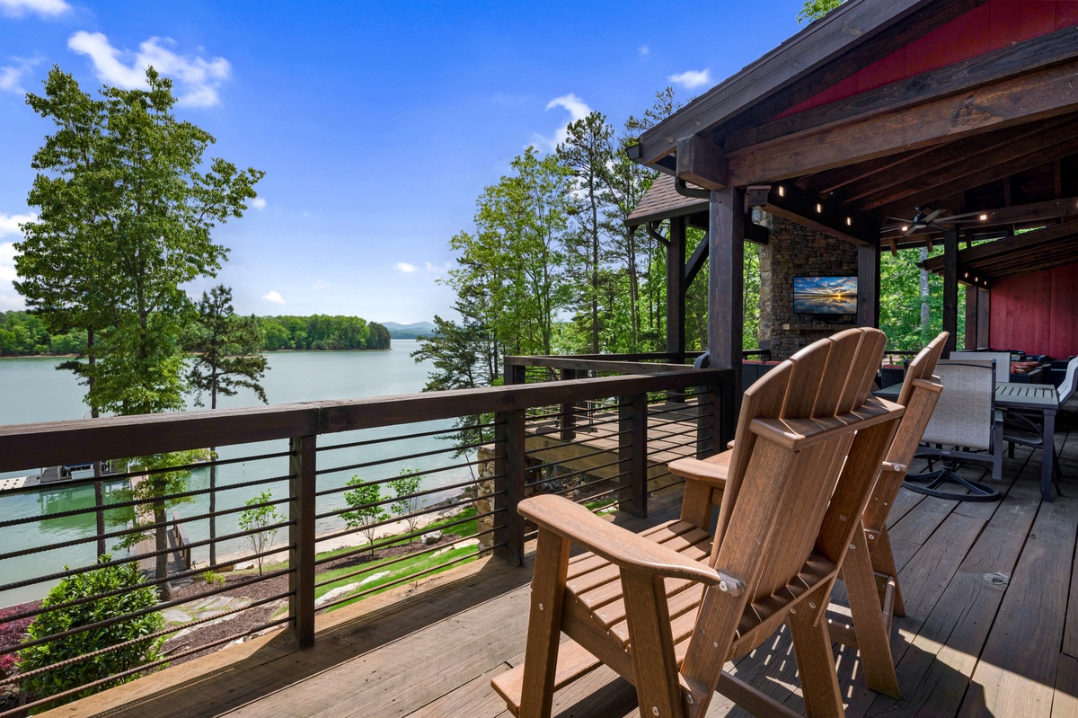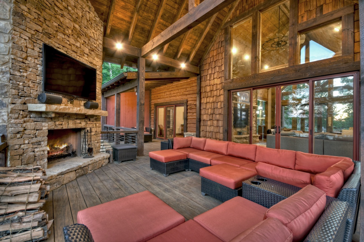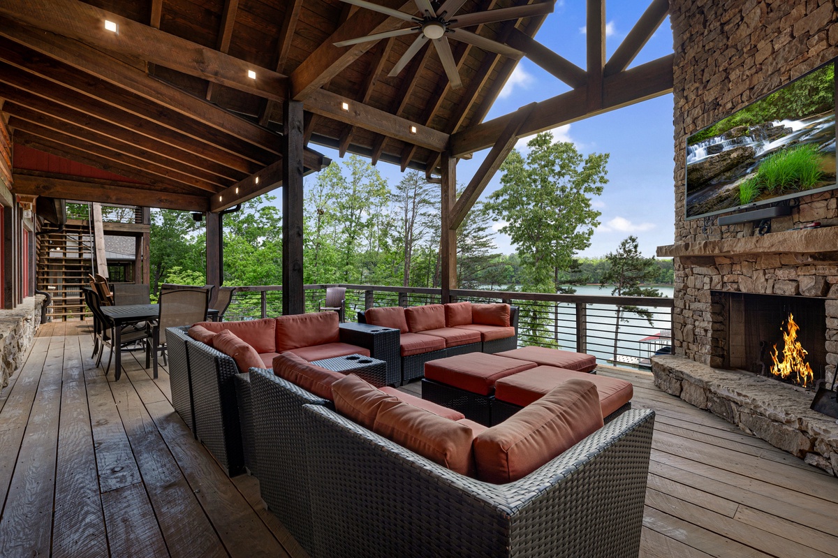 - Entry Level Deck with Large Seating Area, Panoramic View of Lake Nottely, Wood Burning Fireplace, Cast Iron Grill and 70” Flat Panel TV