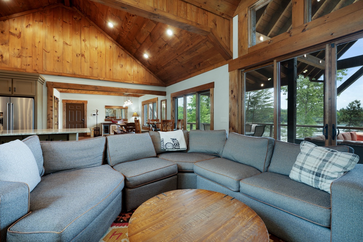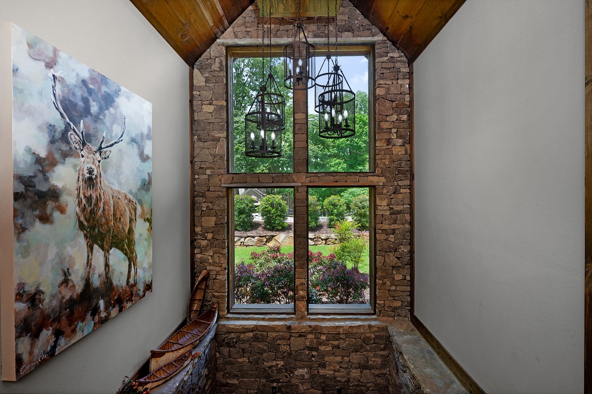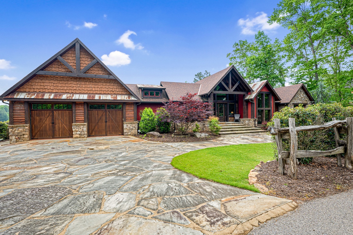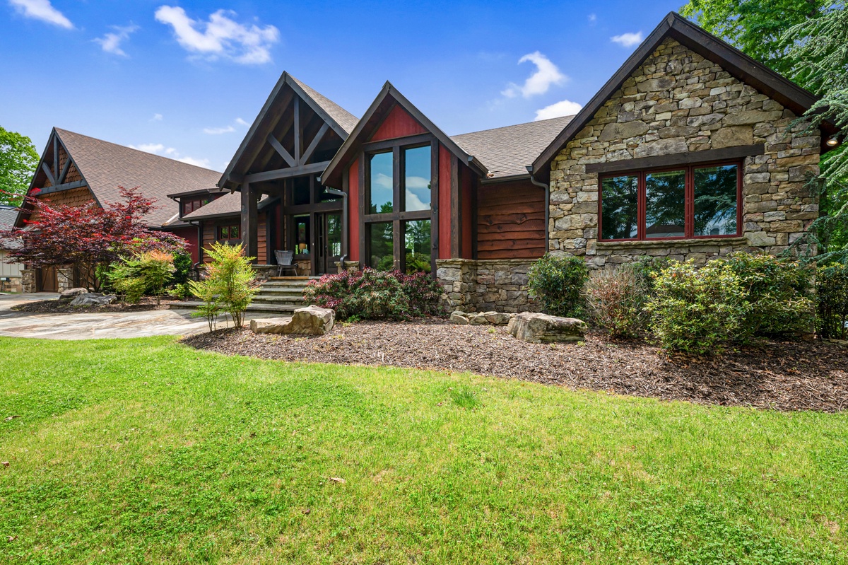 Hurried footsteps patter on the custom stone pathway leading to the inviting grand entrance where in one swing of the door, pupils dilate in admiration of the view, breath lengthens, and nothing but the sound of a stress releasing exhale sets the tone. Spacious open floor plan, cathedral ceilings, fully equipped chefs’ kitchen, stone gas fireplace, 70” flat panel television and windows framing the lake view undoubtably pleases. Wake up to yoga on the deck overlooking the lake or wonder down the slate path to the dock and sip coffee from the sunning deck.