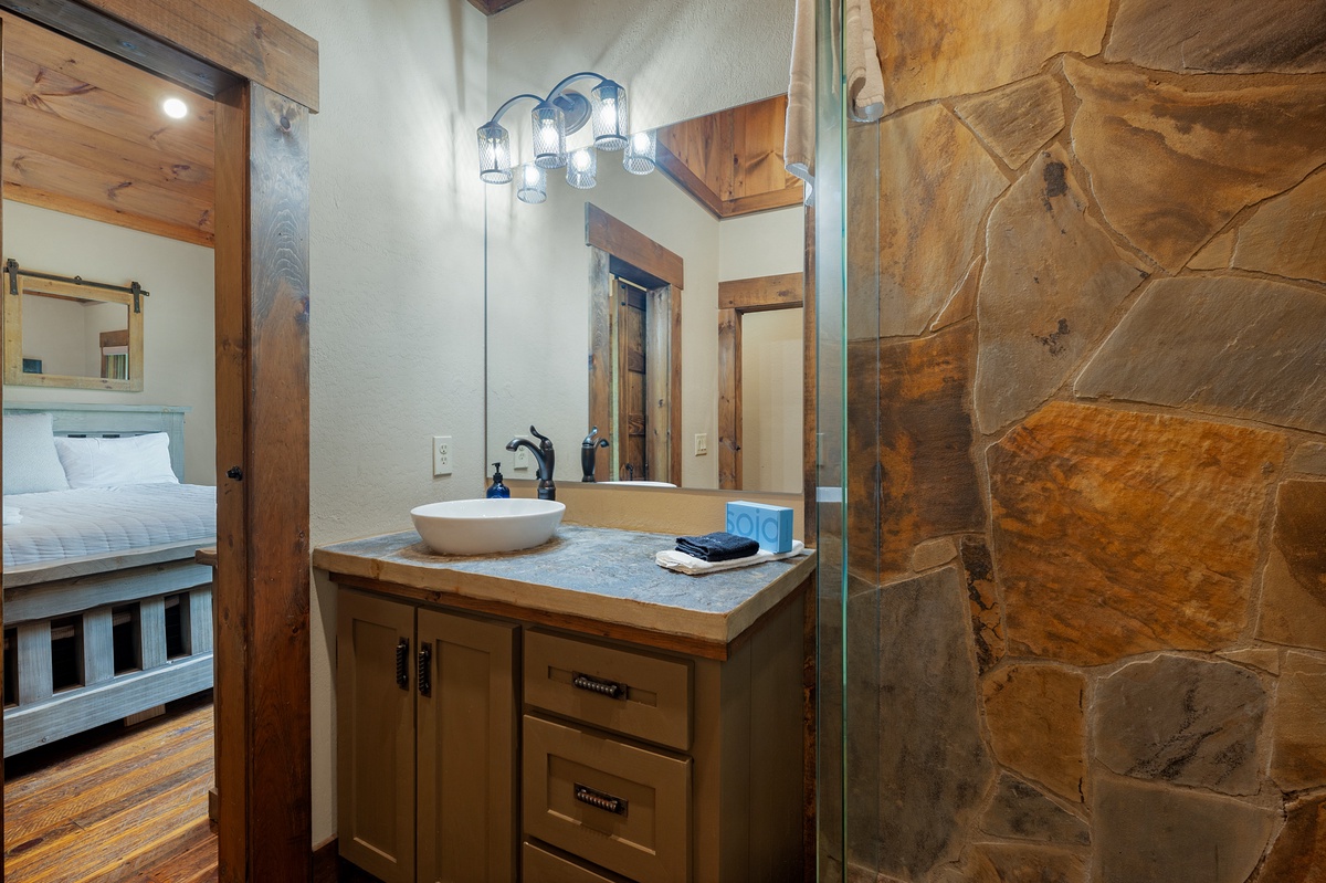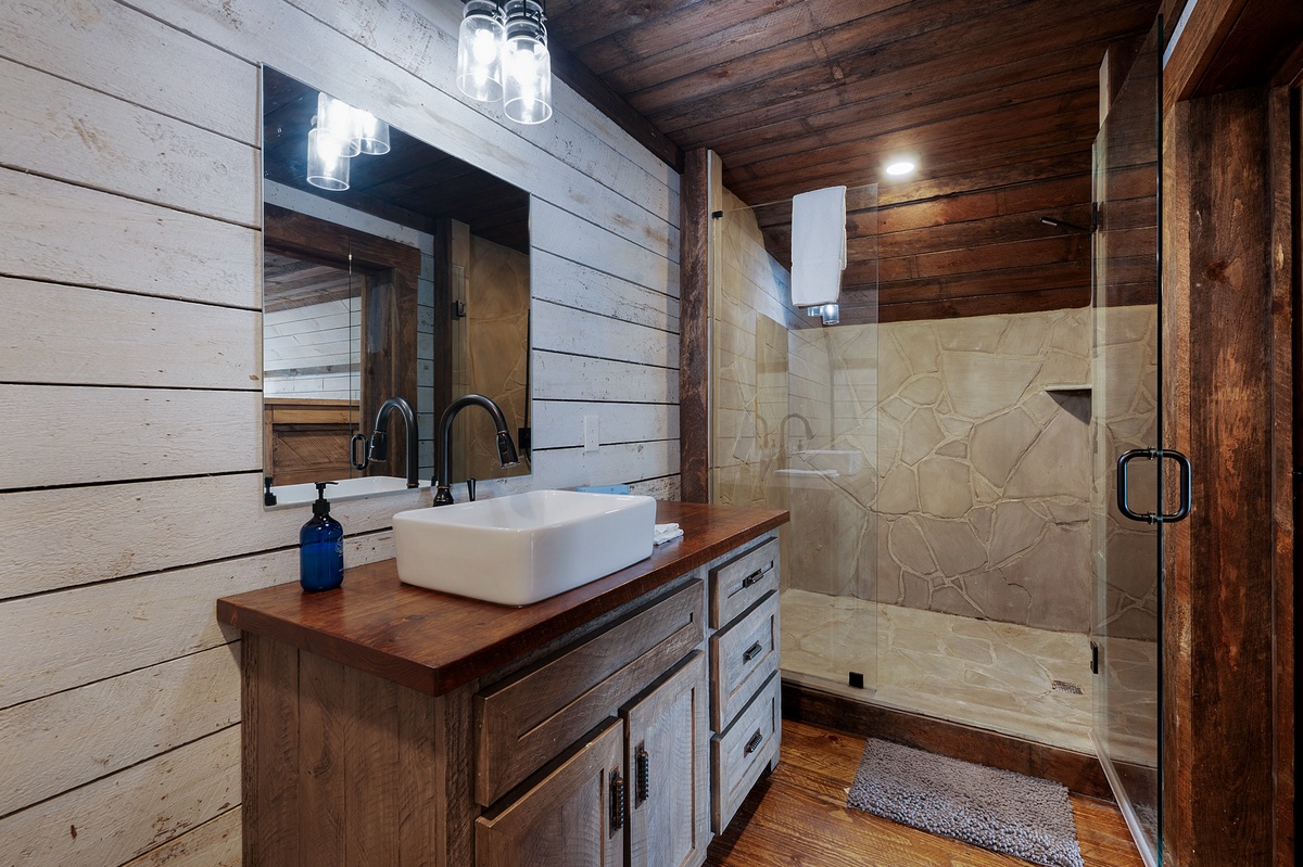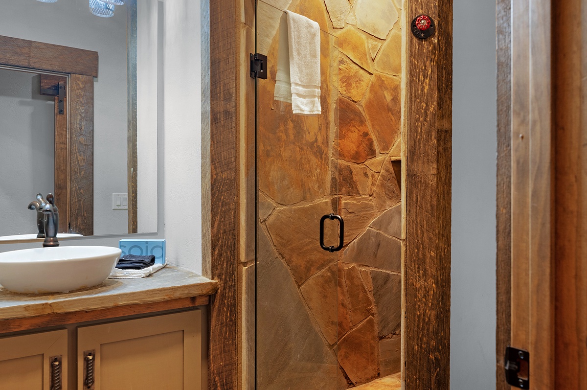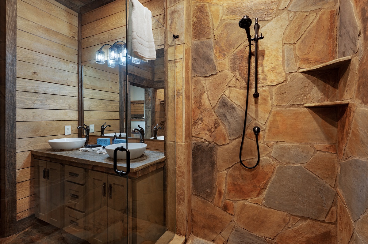 Opposite the lower level common area, find a luxurious second king master suite with another waterfall shower in the en suite. A little further down the hall, find the shared full bathroom and bunk room housing 4 twin beds.