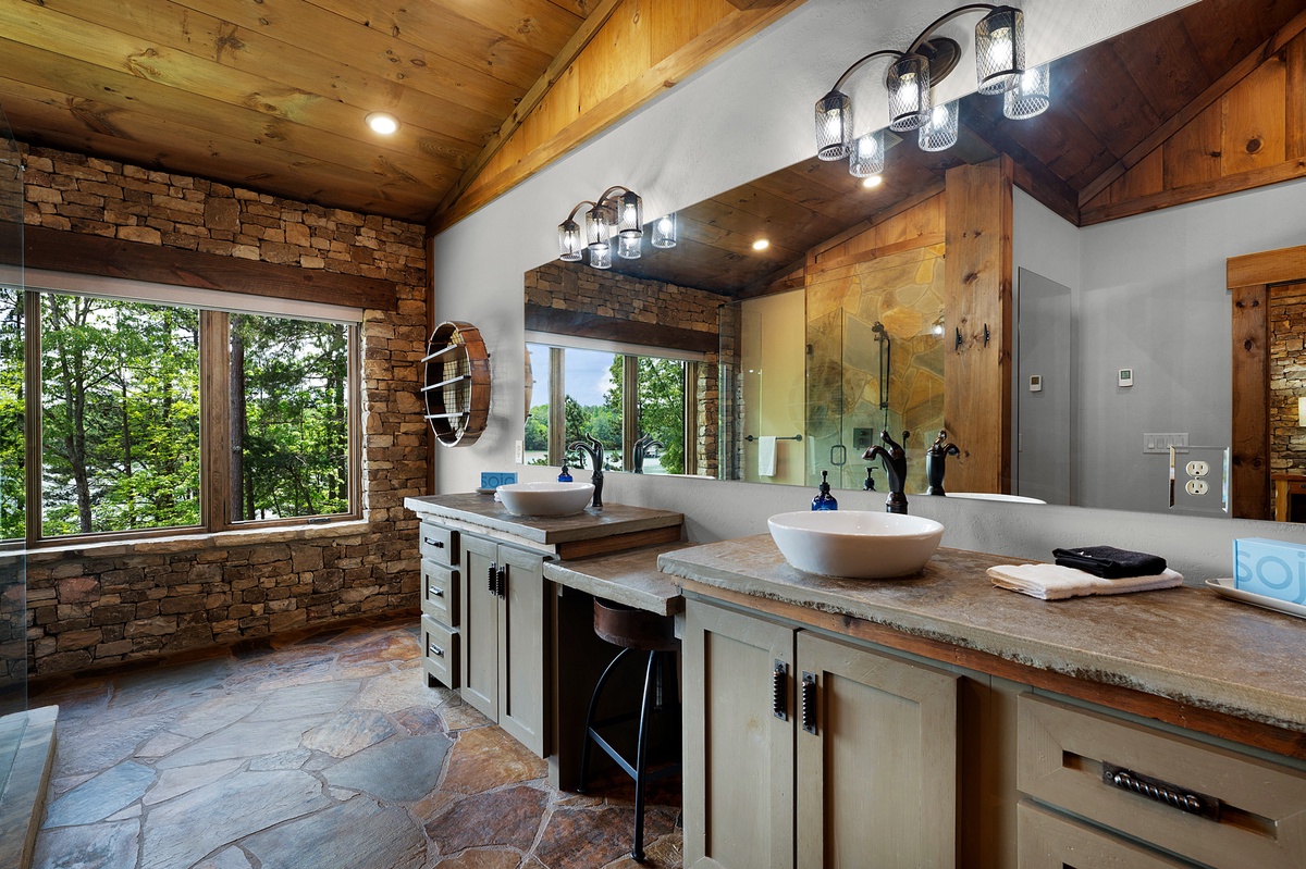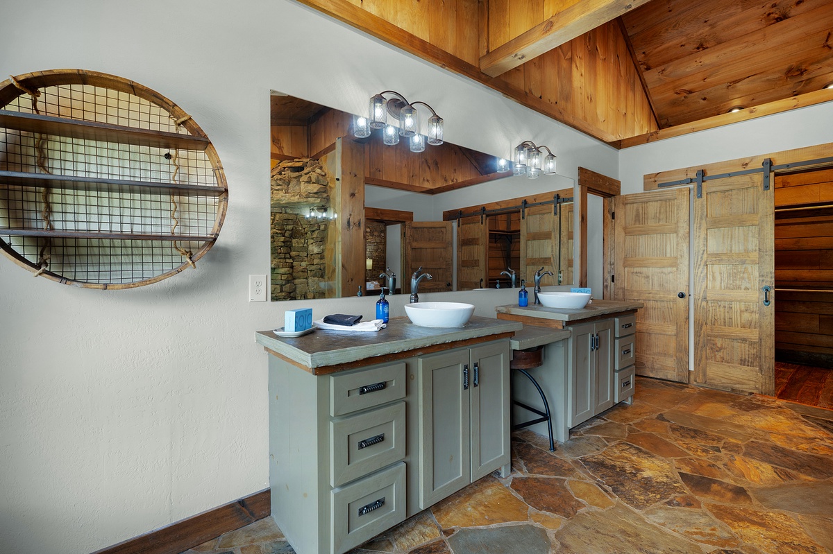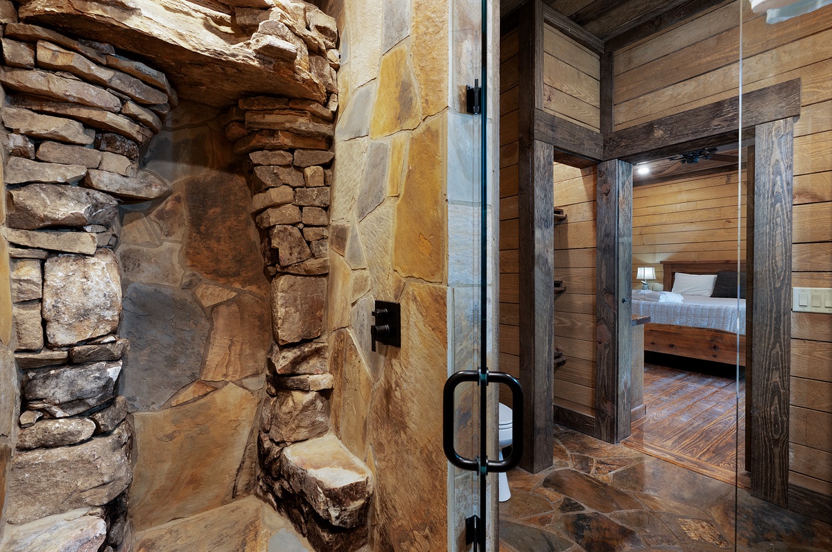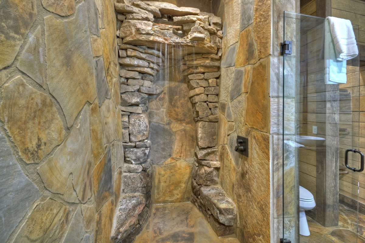 Opposite the lower level common area, find a luxurious second king master suite with another waterfall shower in the en suite. A little further down the hall, find the shared full bathroom and bunk room housing 4 twin beds.