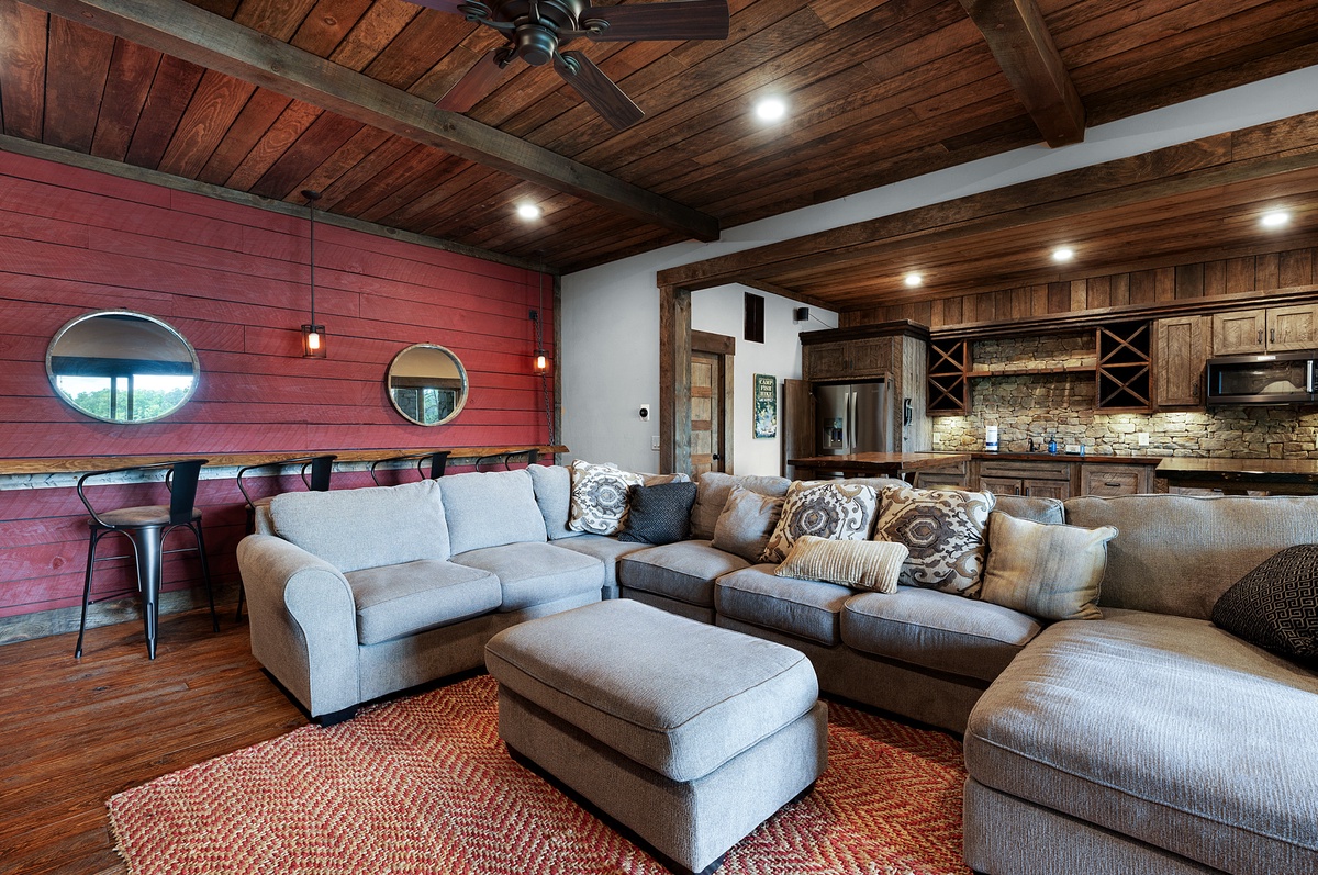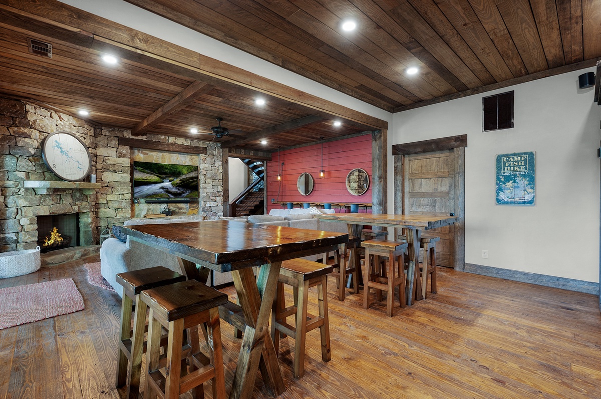 Stroll down the grand staircase to a second common area with gas fireplace, 70” flat panel television and access to the outdoor kitchen and seating area. Settle here over a cocktail from the wet bar and board game while the outdoor grill sizzles with goodies.