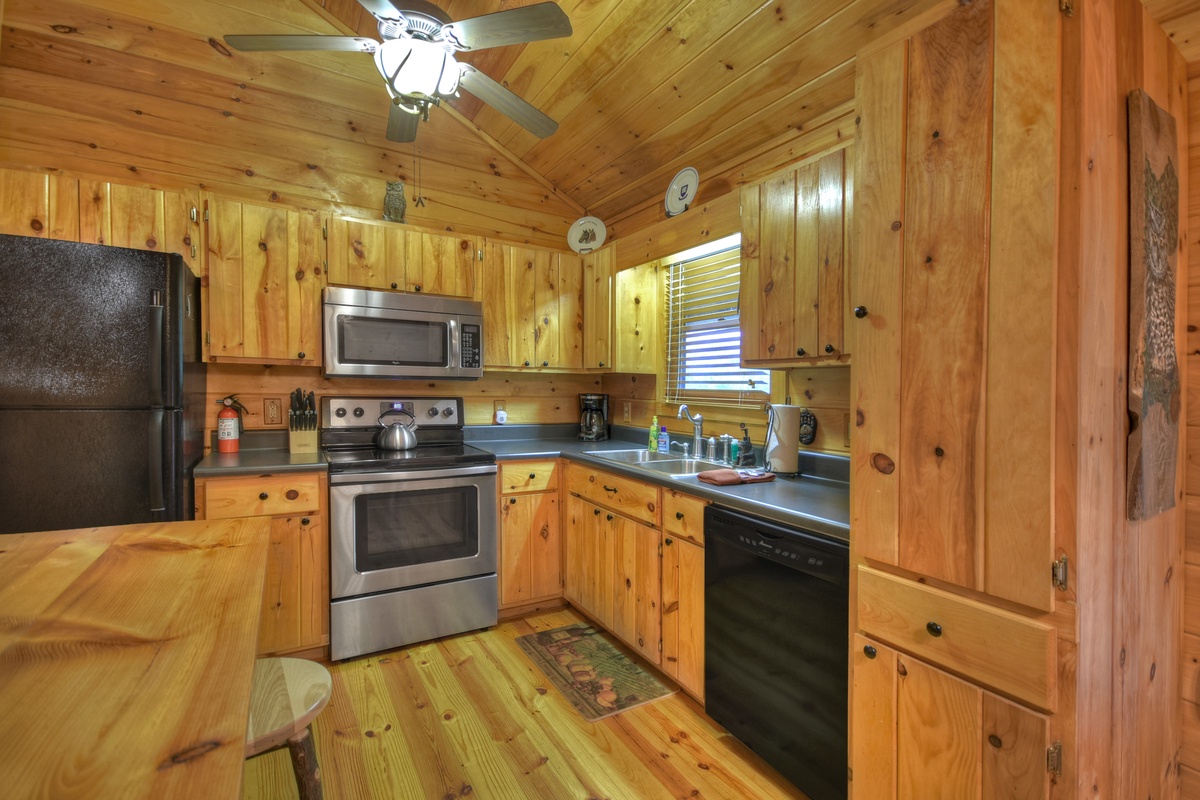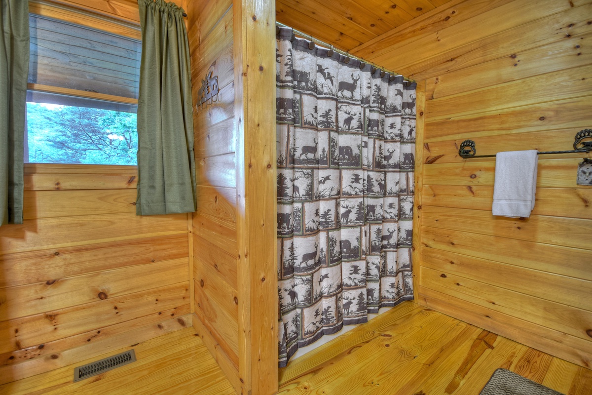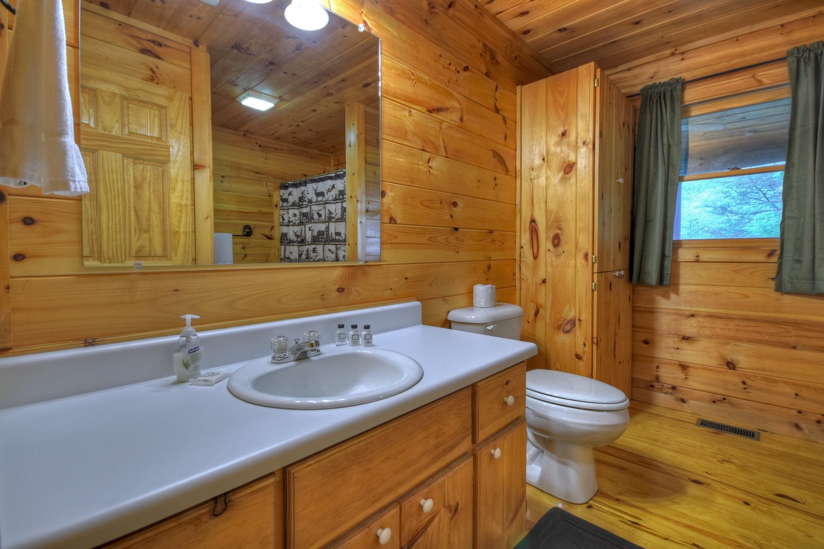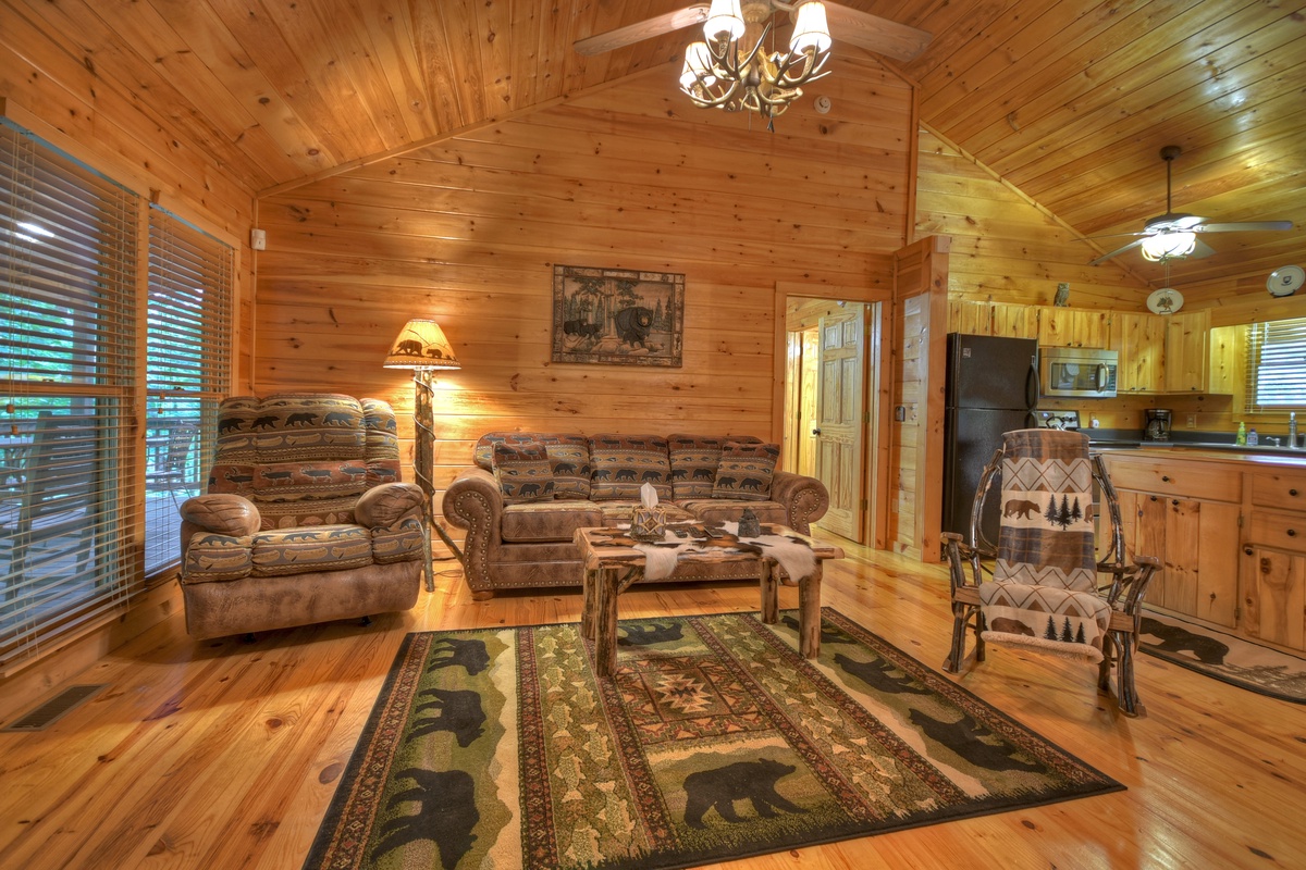 The living room has new furniture, including a recliner, rocker, and comfy couch. Kick back and relax while watching the 48" TV w/ Dish Network and soundbar next to the gas log fireplace. You won't find a better atmosphere to cozy up to your loved ones! On one side of the cabin, you will find the queen bedroom and 32" TV w/ Dish across from the shared tub/shower combo bathroom across the hall. The washer and dryer are also conveniently located in the closet of this restroom.