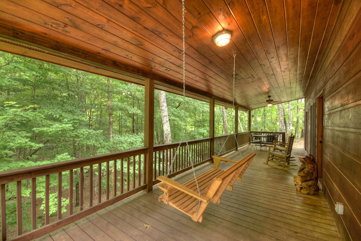 - The front deck has a porch swing, table for 4, and wooden rocking chairs
