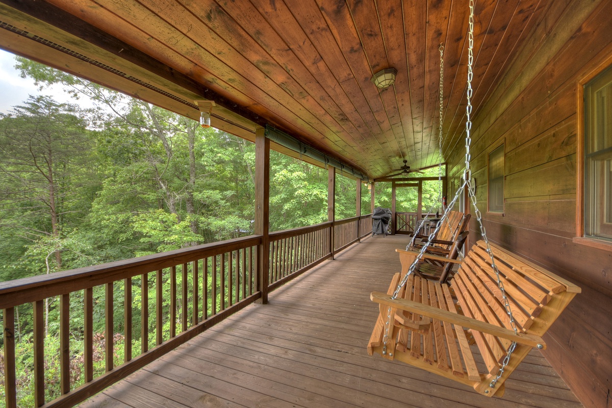 - The back deck has the gas grill, hot tub, more wooden rockers, and another porch swing with a mountain view