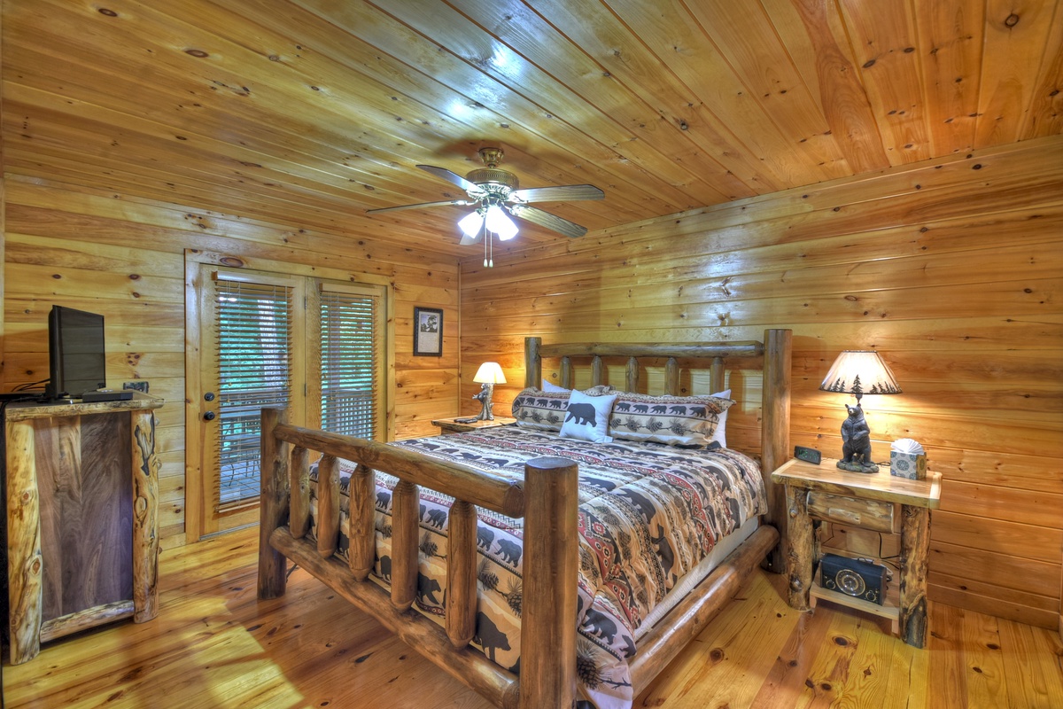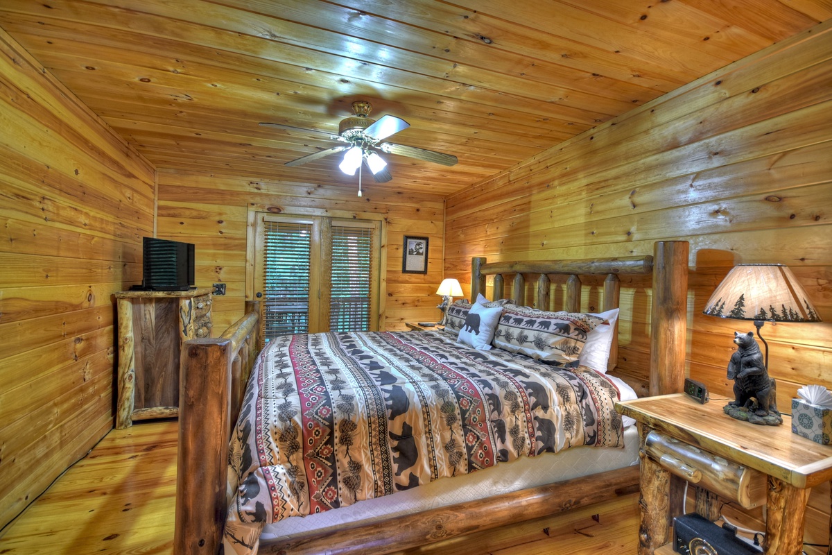 On the other side of the cabin, you have the king master suite! This includes a 32" TV w/ Dish Network and a private bathroom with a walk-in shower. This particular room also has direct deck access.
