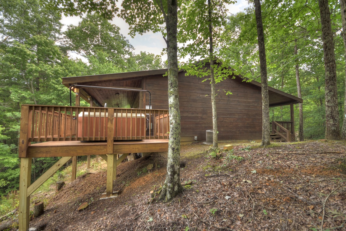 On the back side of the cabin offering the mountain view, you will find the hot tub along with the gas grill, wooden rockers, and a delightful porch swing. On the front side, there is an additional porch swing and a table for 4 with a couple more wooden rockers. Both decks lead to the side of the cabin where the outdoor fire pit is.