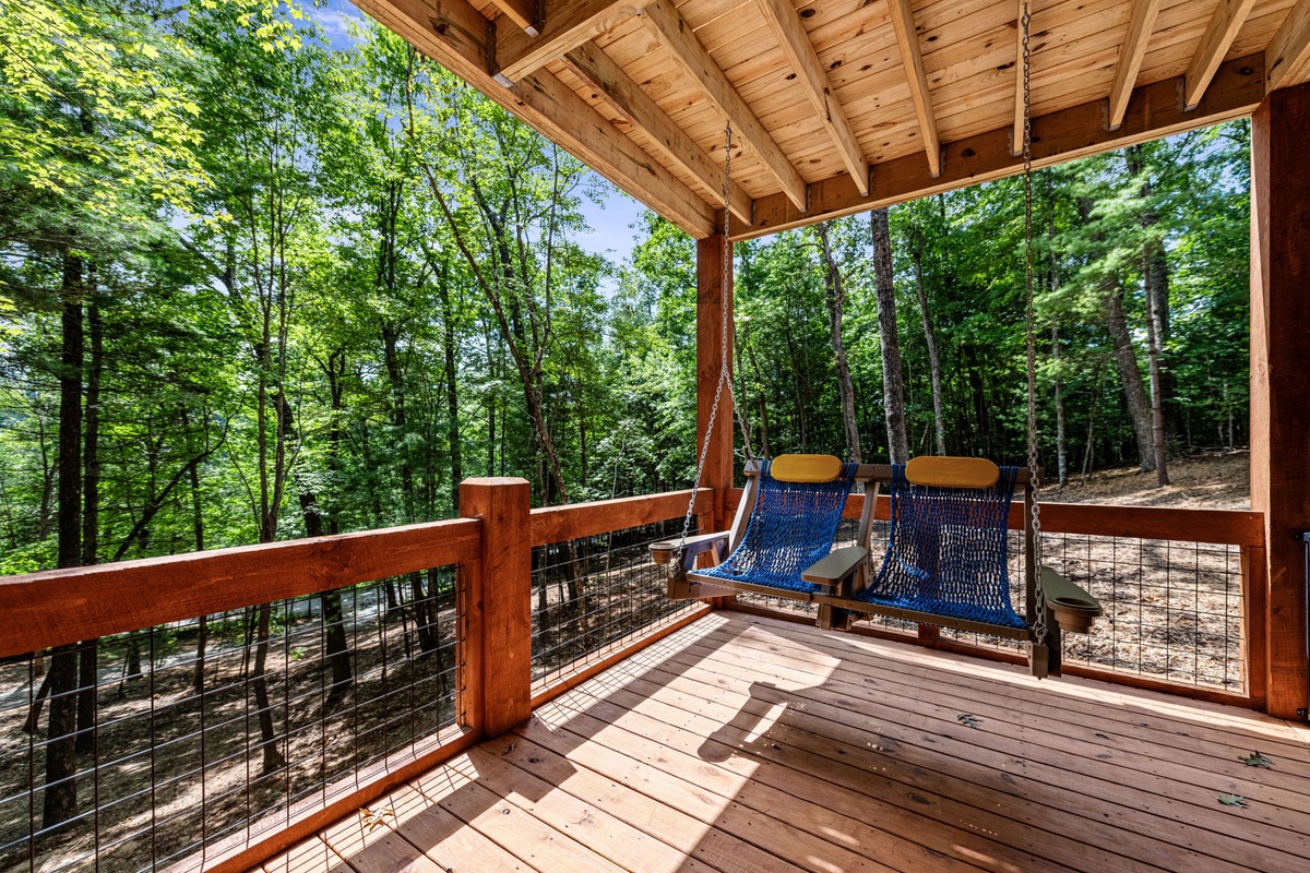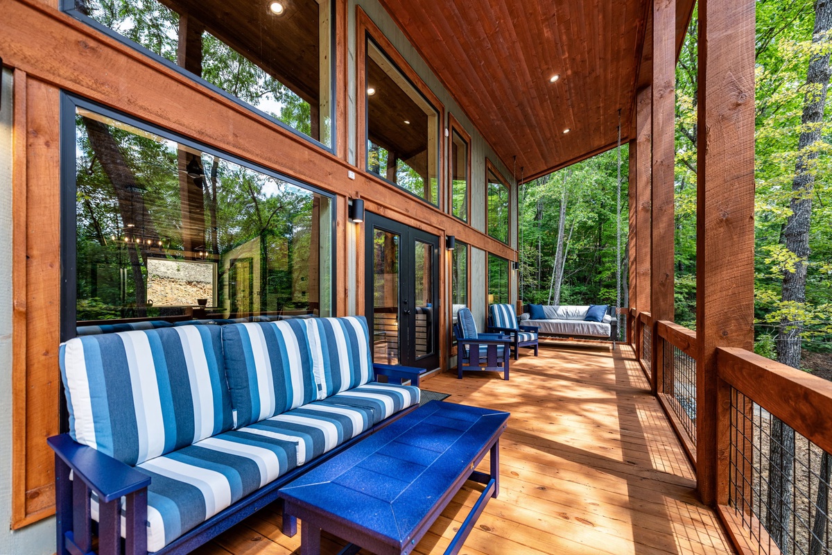 Outdoor living is just as impressive, with a covered upper deck featuring a wood-burning fireplace, 55" TV, and dining for six, plus a gas grill. The lower deck includes a six-person hot tub, high-top seating, and a swing built for two. Finish your day around the beautifully landscaped fire pit under the stars.