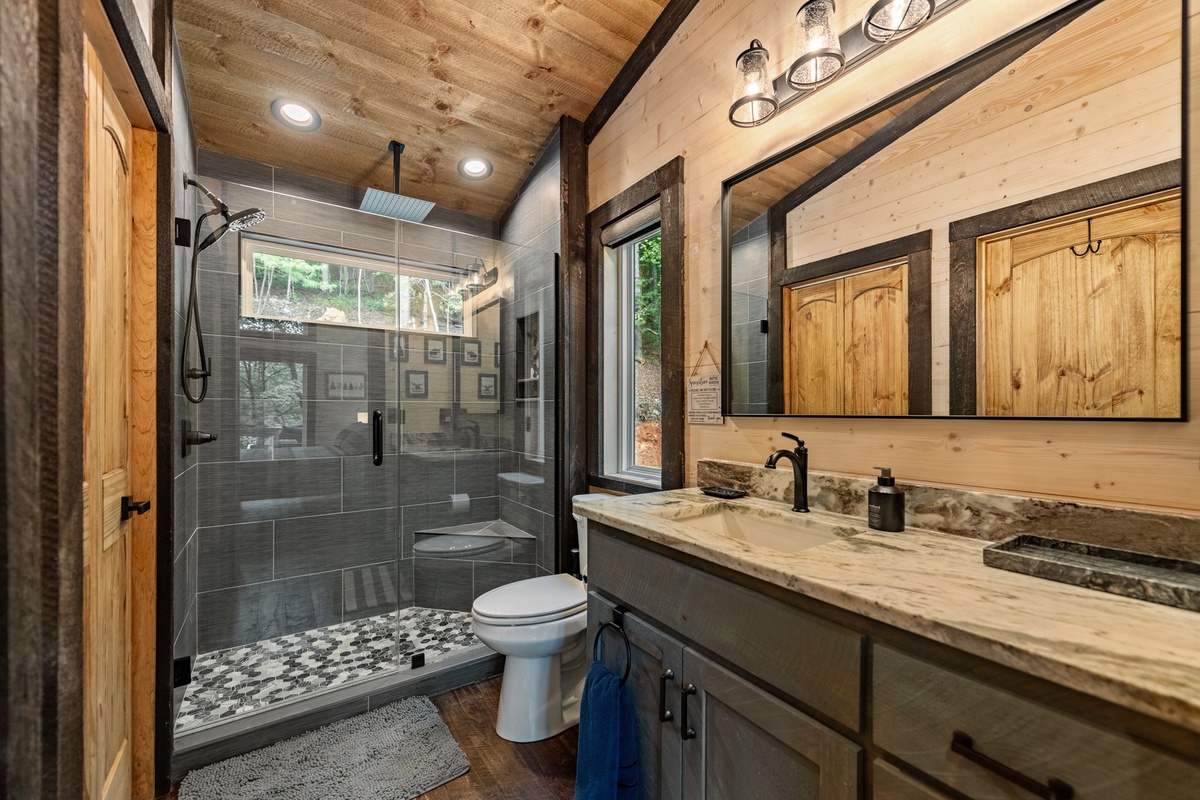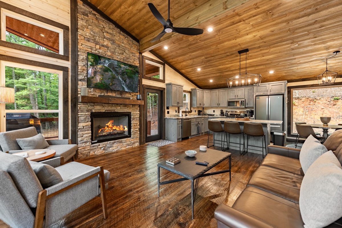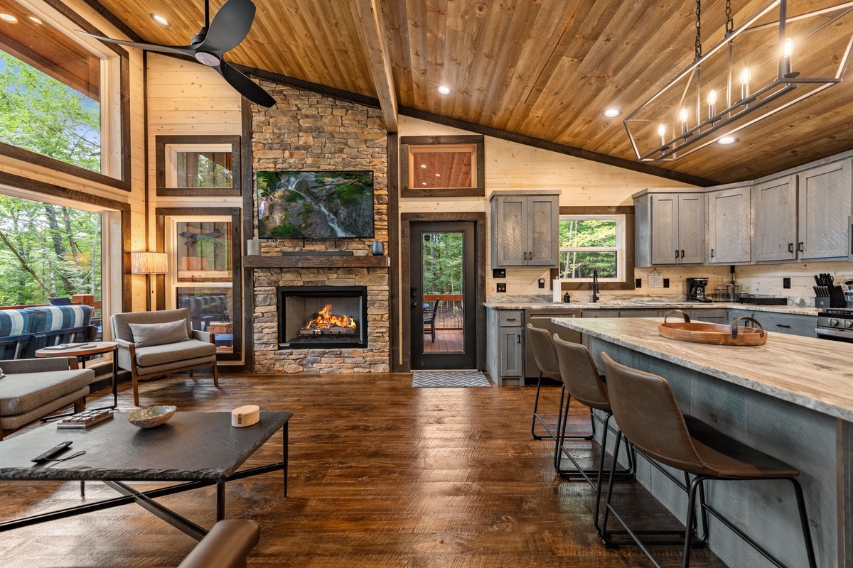 The entry level welcomes you with a spacious open layout featuring a fully equipped gourmet kitchen, a warm gas fireplace, and a 65" TV. Enjoy meals at the dining table or the island seating, all while soaking in views of the forest through expansive windows. A king bedroom suite with a spa-style waterfall shower offers comfort and privacy.